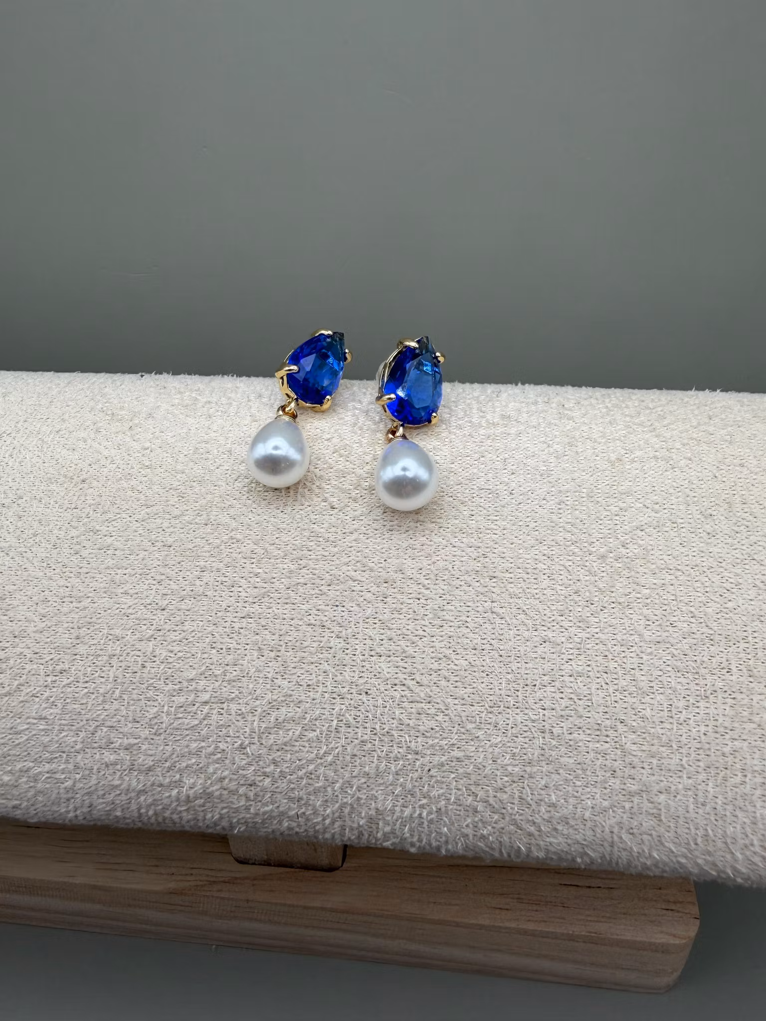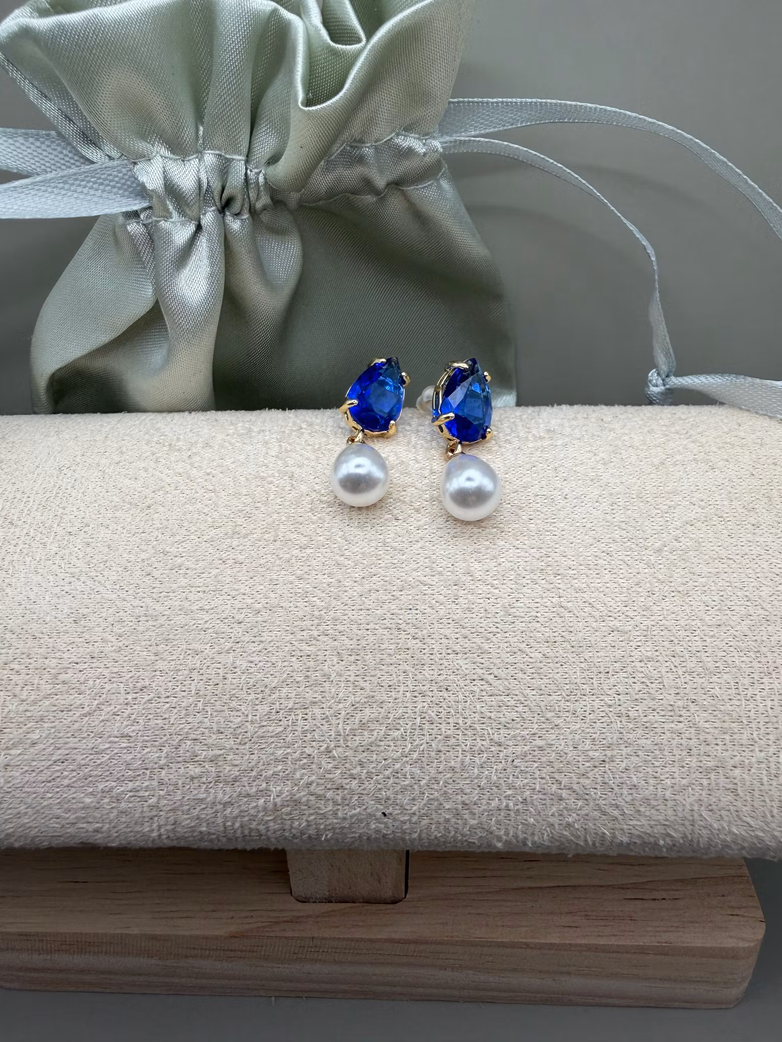 Droppformade örhängen med blått kristallglas och en stilfullt hängande vit pärla som ger ett stilrent uttryck.