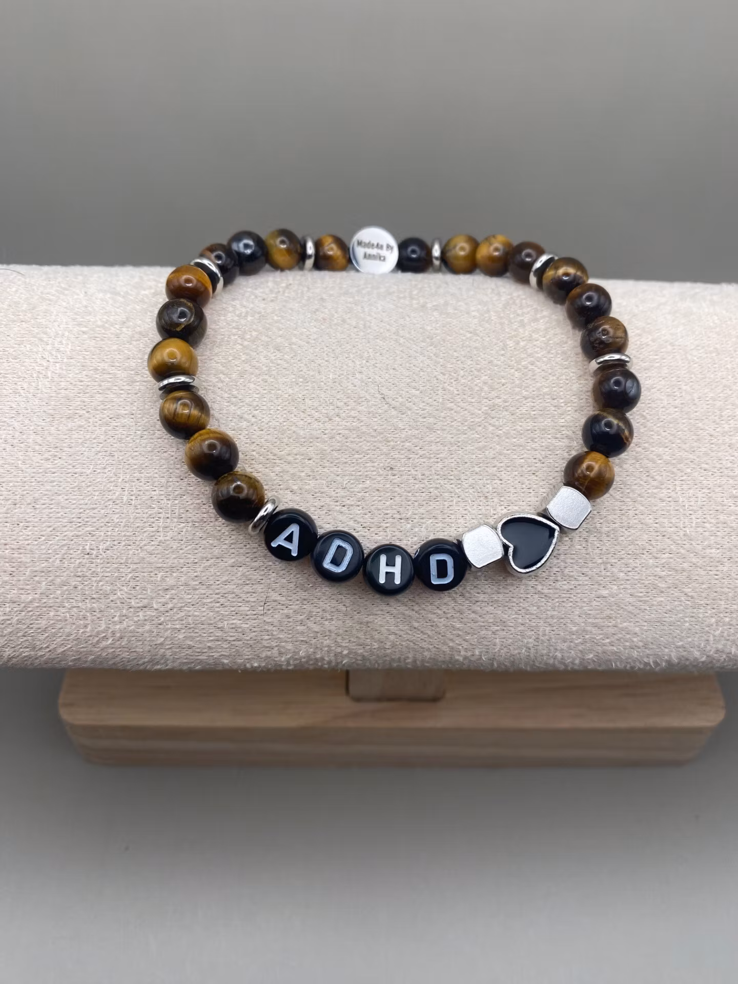 Stiligt armband med budskap. ADHD. Vackra träpärlor i bruna nyanser med tyngd varvat med stålfärgade distanser, fyrkanter och hjärta.Pärlor 6mm