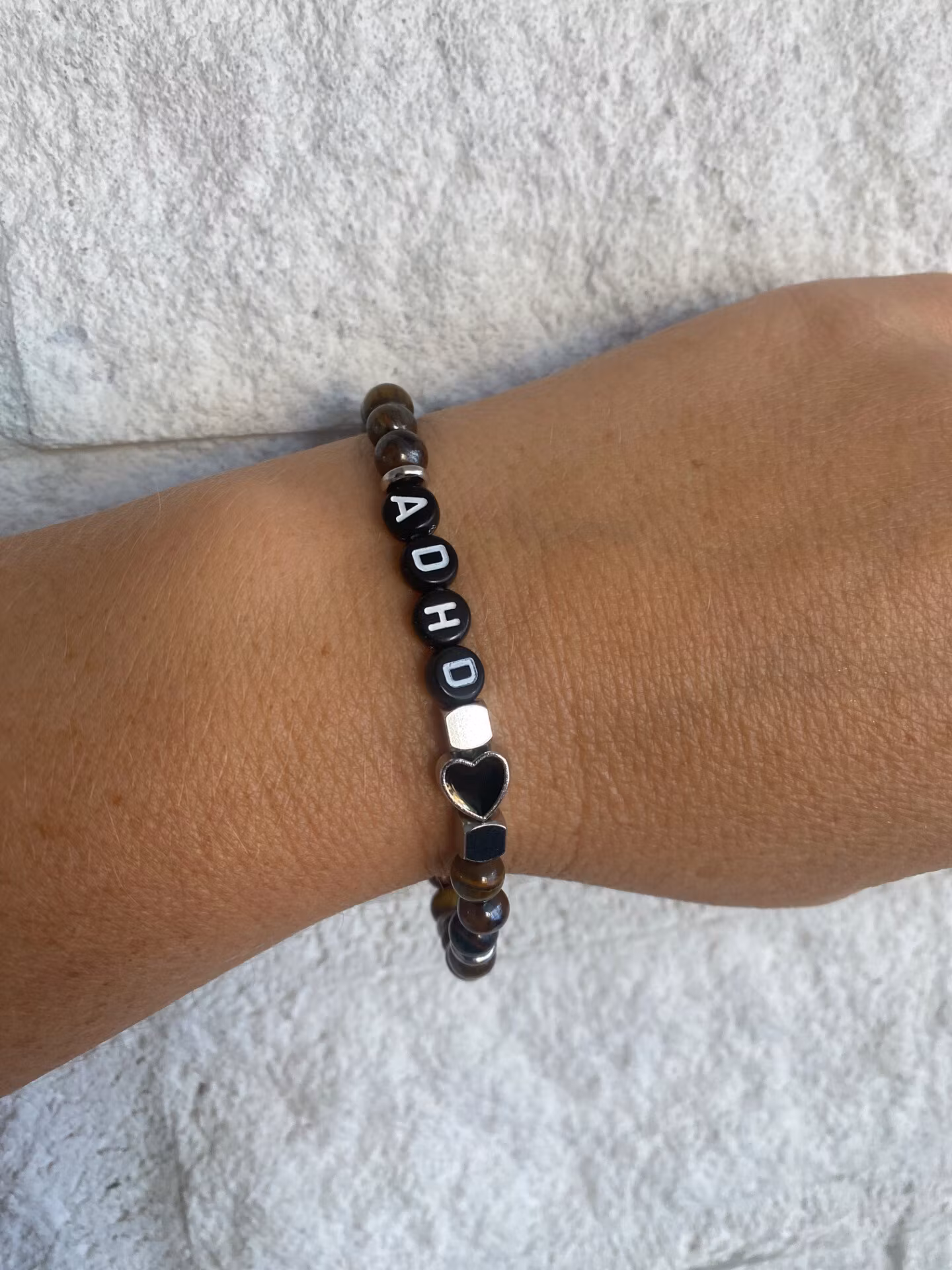 Stiligt armband med budskap. ADHD. Vackra träpärlor i bruna nyanser med tyngd varvat med stålfärgade distanser, fyrkanter och hjärta.Pärlor 6mm*Visas produkten