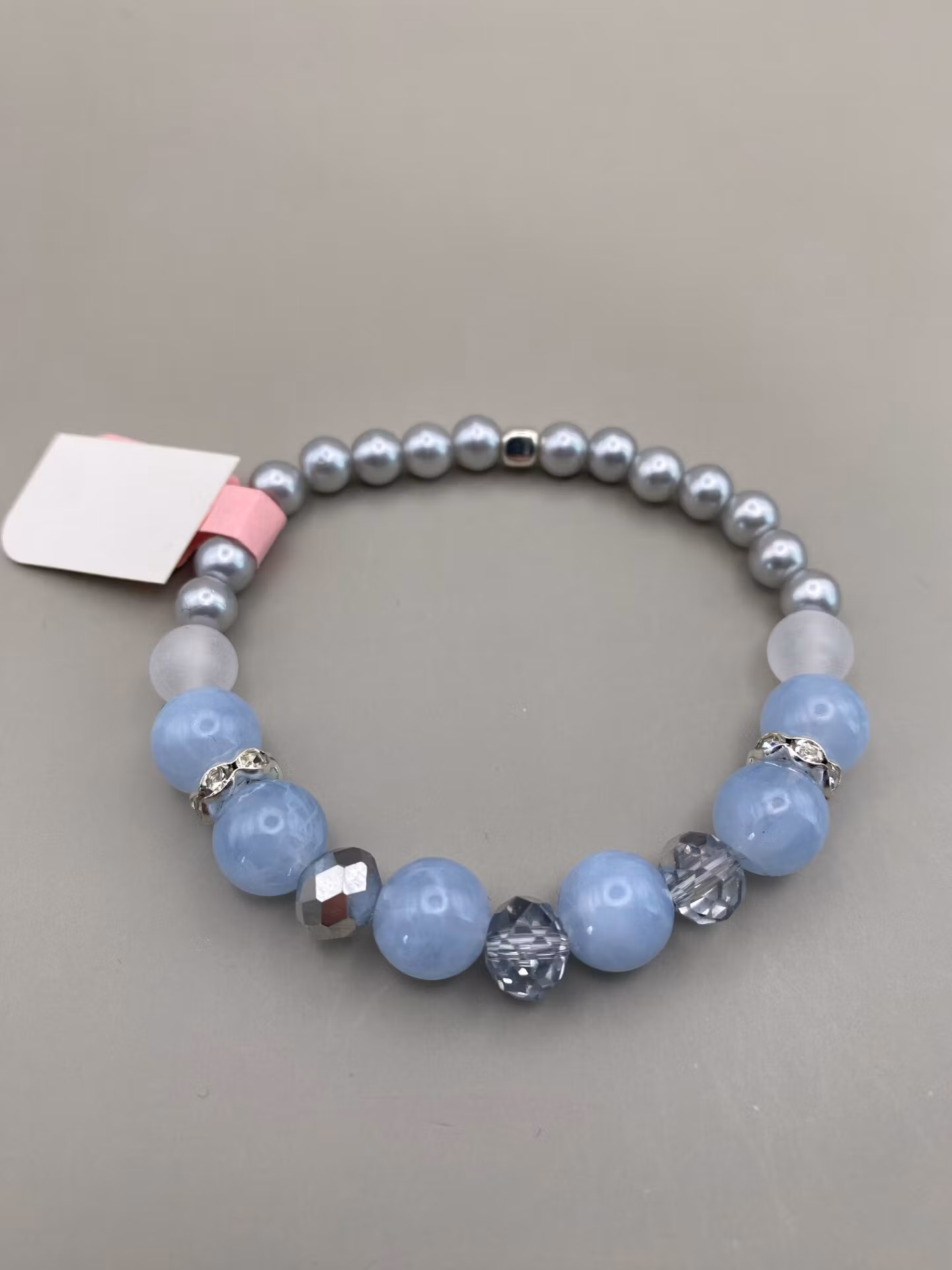 Armband i ljusblå större glaspärlor varvat med silvergrå glaspärlor och strassdetaljer samt något mindre silvergrå pärlor runt om.