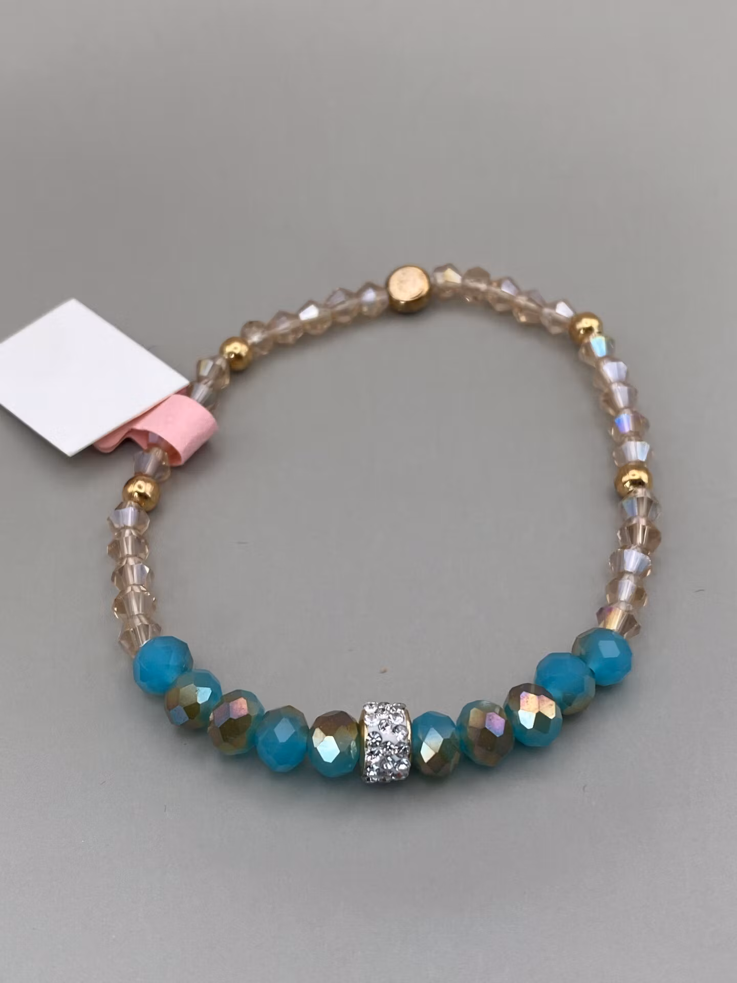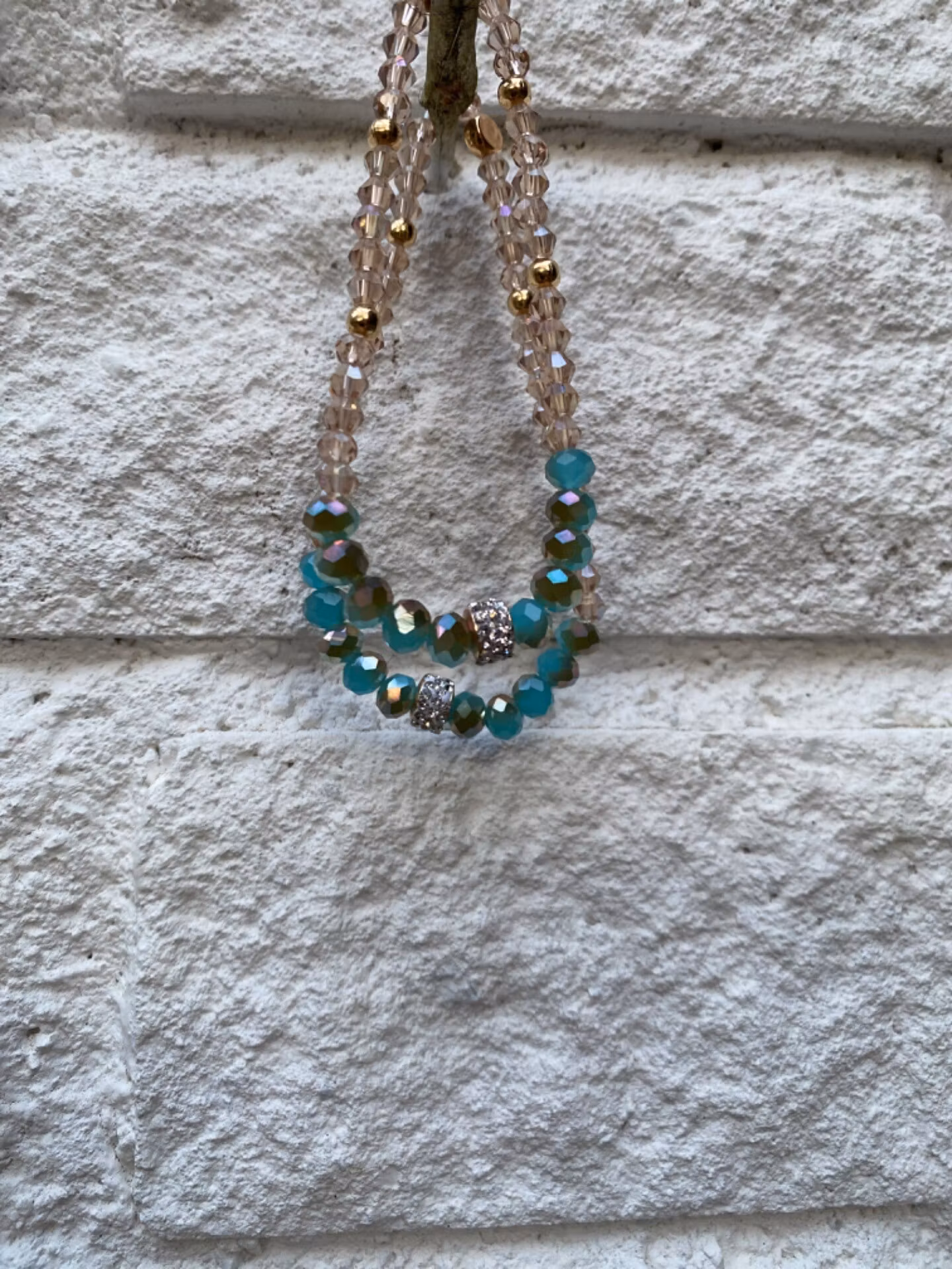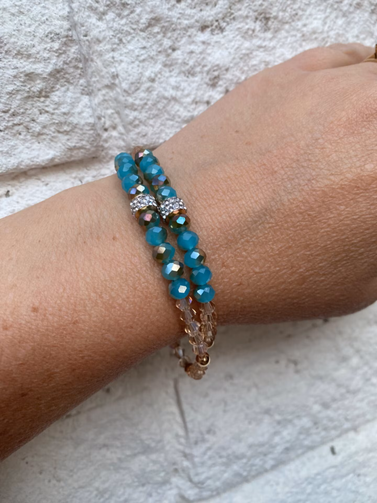 Armband i små champagnefärgade pärlor varvat med guldfärgade pärlor, turkos och brunmellerade pärlor och strassdetalj i blickfånget