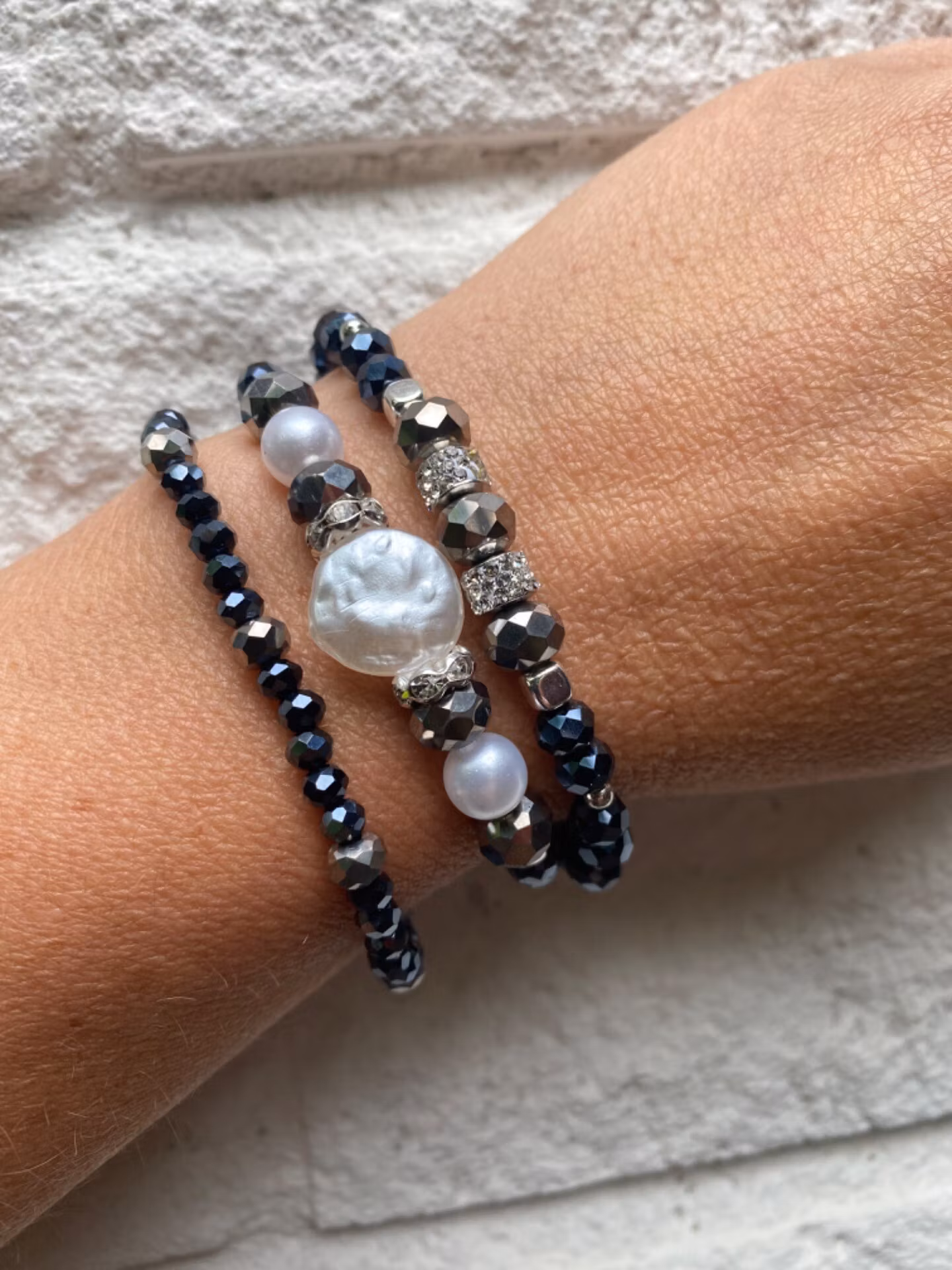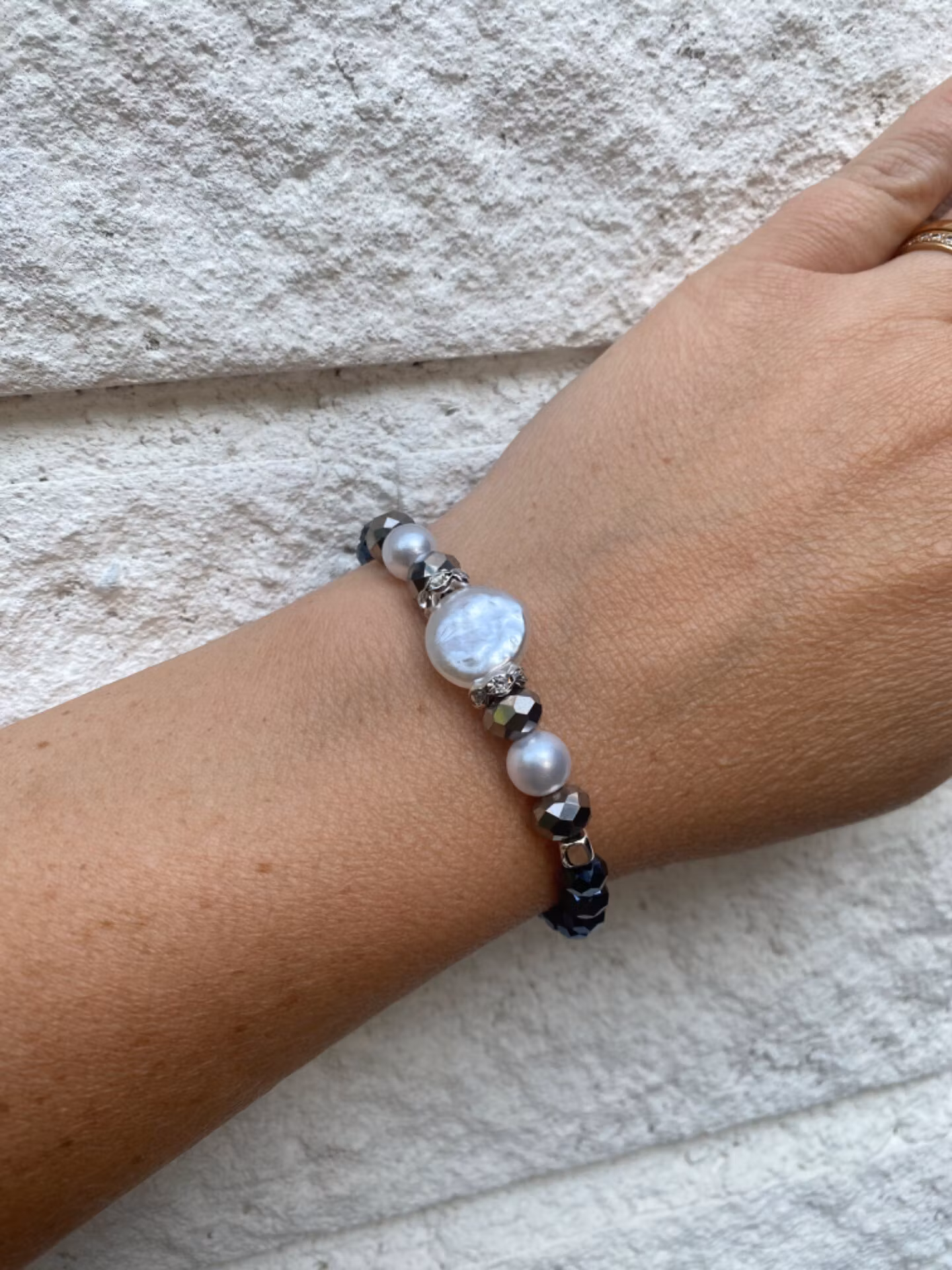 Armband i mörkt midnattsblå glansiga glaspärlor, varvat med silverfärgade större glaspärlor, silverfärgade detaljer och stor vit vaxad platt pärla i blickfånget