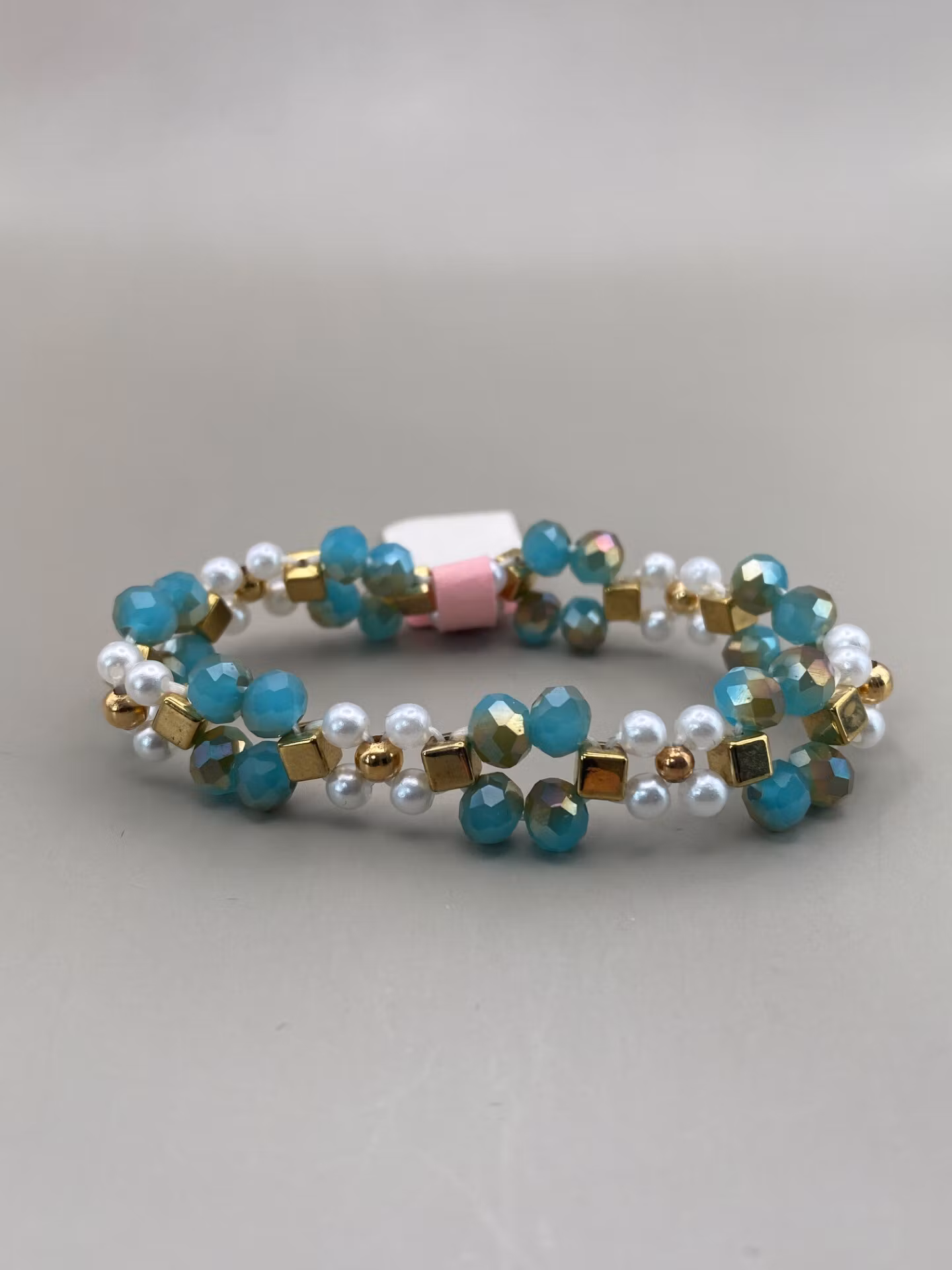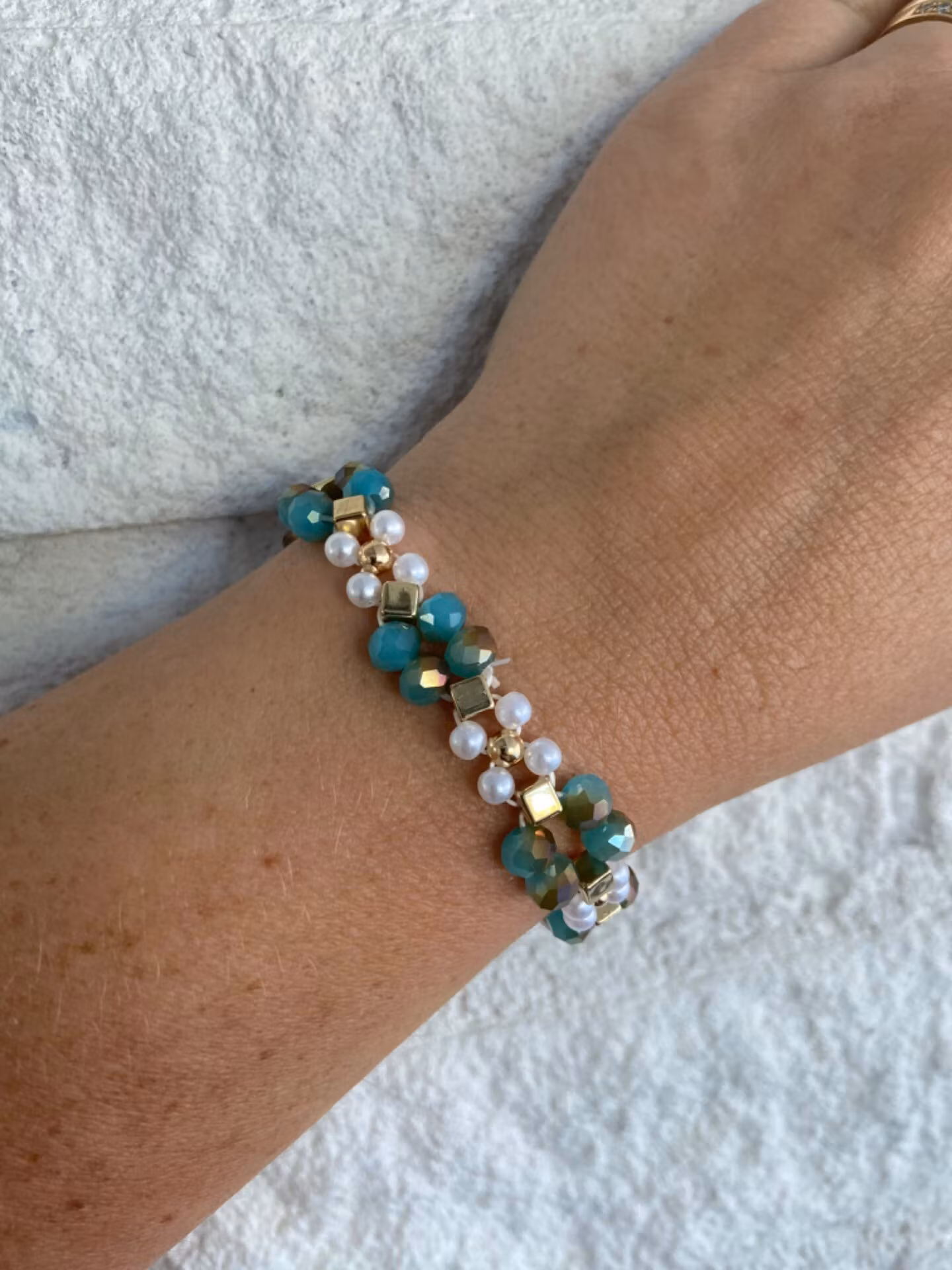 Armband i vackert mönster av vita vaxade pärlor, guldfärgade runda pärlor och fyrkantiga pärlor samt grön- och guldbrun mellerade glaspärlor