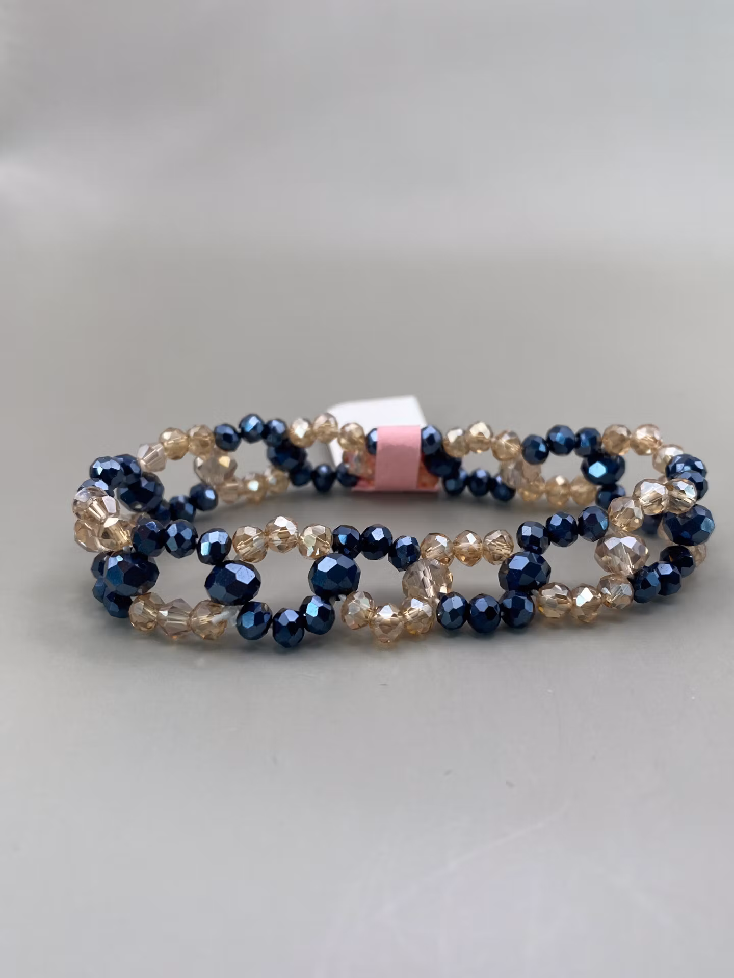 Armband i fint mönster av små mörkt midnattsblå blanka glaspärlor och champagnefärgade pärlor