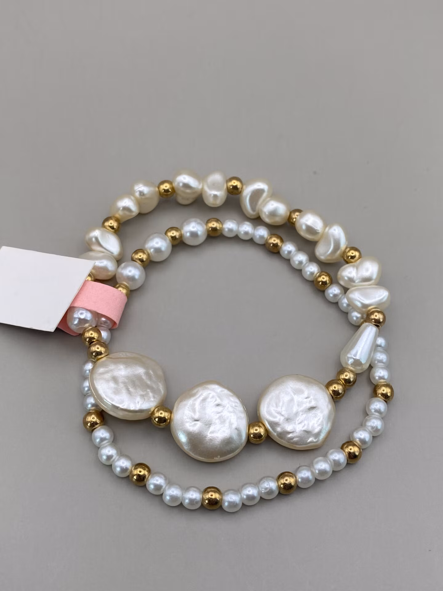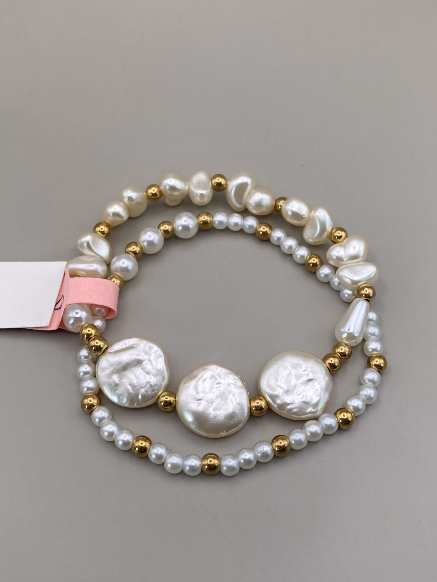 Vackert 2-pack armband. Armband 1, benvita vaxade pärlor i olika storlekar och former, varvat med guldfärgade pärlor, tre större platta vaxade pärlor i blickfån