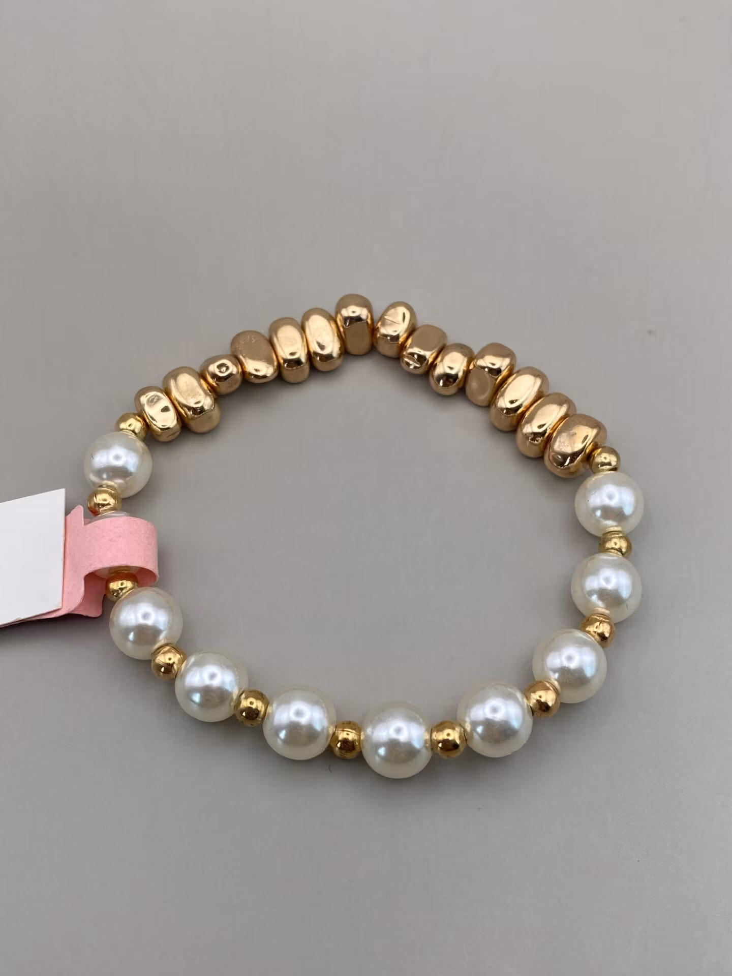 Benvita vaxade pärlor varvat med guldfärgade detaljer framtill, 14K guldpläterade oregelbundna hematit pärlor baktill.Kan varvas med vilken sida man vill ha i b