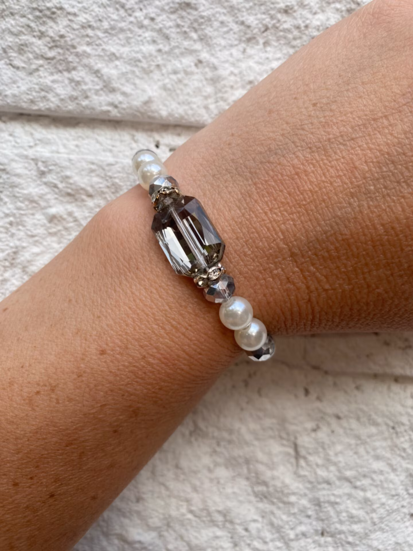 Armband med vita pärlor varvade med silvergrå glaspärlor, där en stor rektangulär grå glaspärla blir blickfånget. En elegant och tidlös accessoar som lyfter din