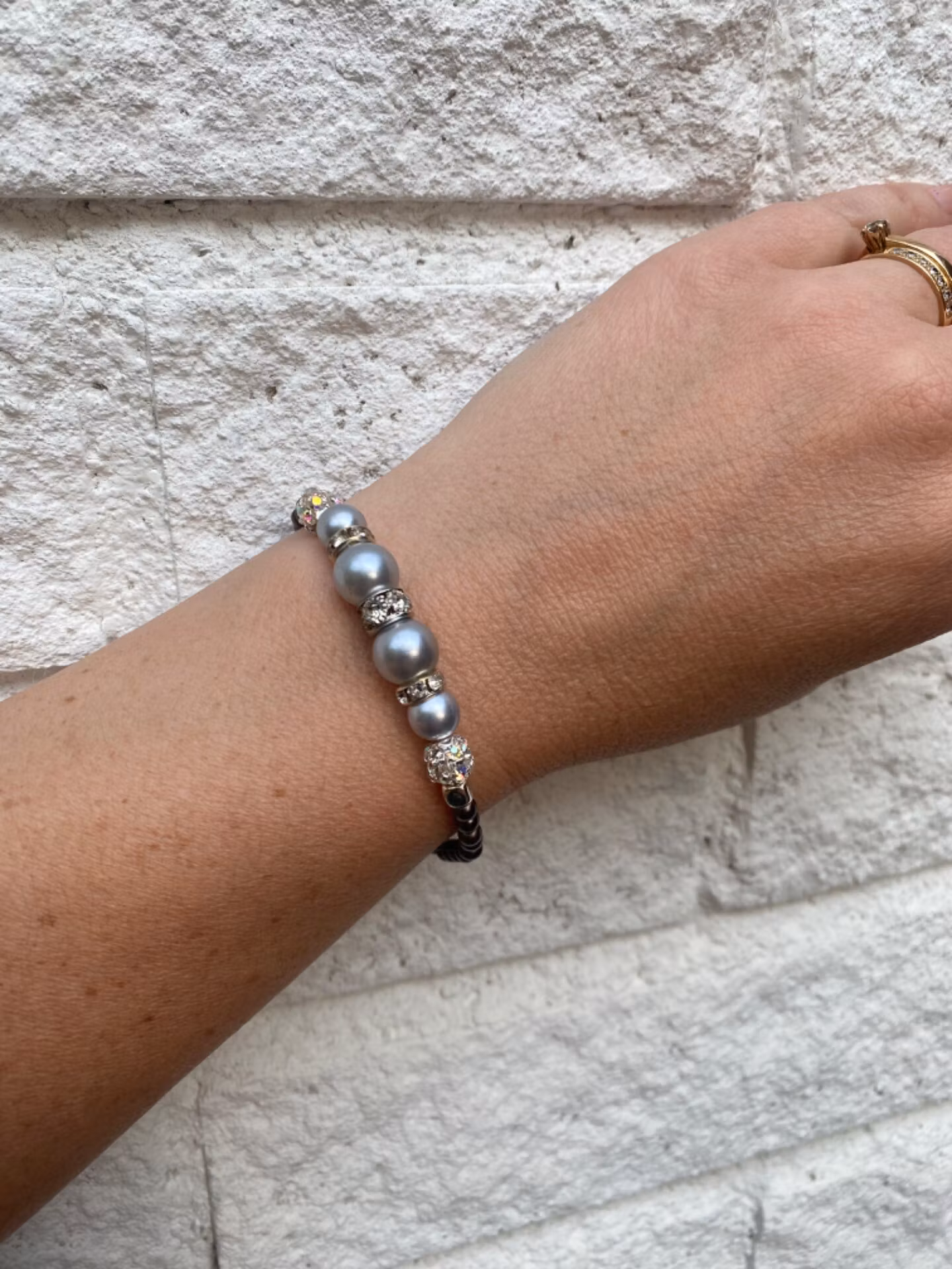 Armband med silvergrå pärlor och silverfärgade strassdetaljer, kombinerat med varma kaffefärgade pärlor som blickfång. En harmonisk och elegant accessoar för alla tillfällen.