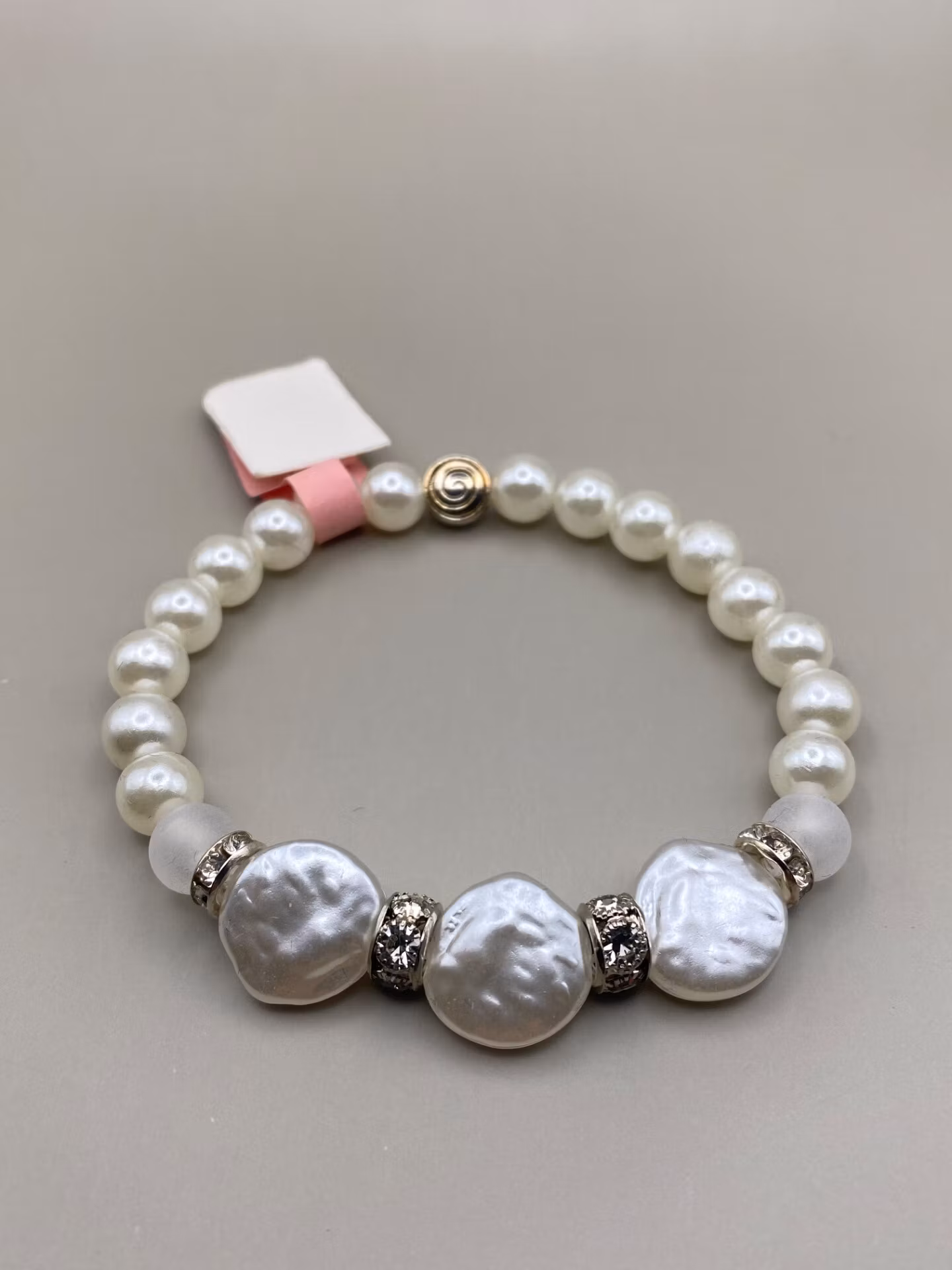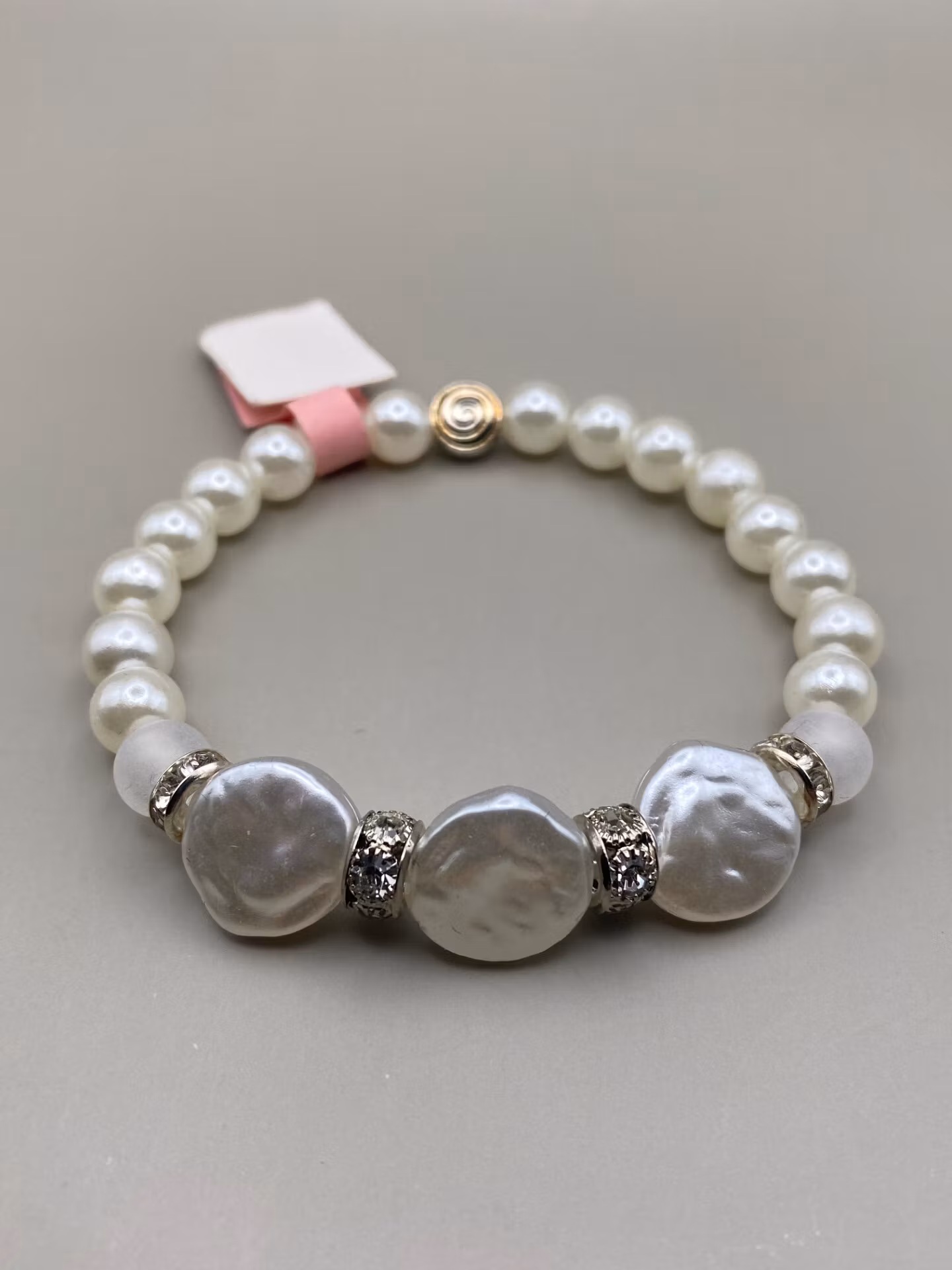 Armband med glansiga vita pärlor och silverfärgade strassdetaljer som fångar blicken. En feminin touch med det lilla extra – perfekt som blickfånget i din look.