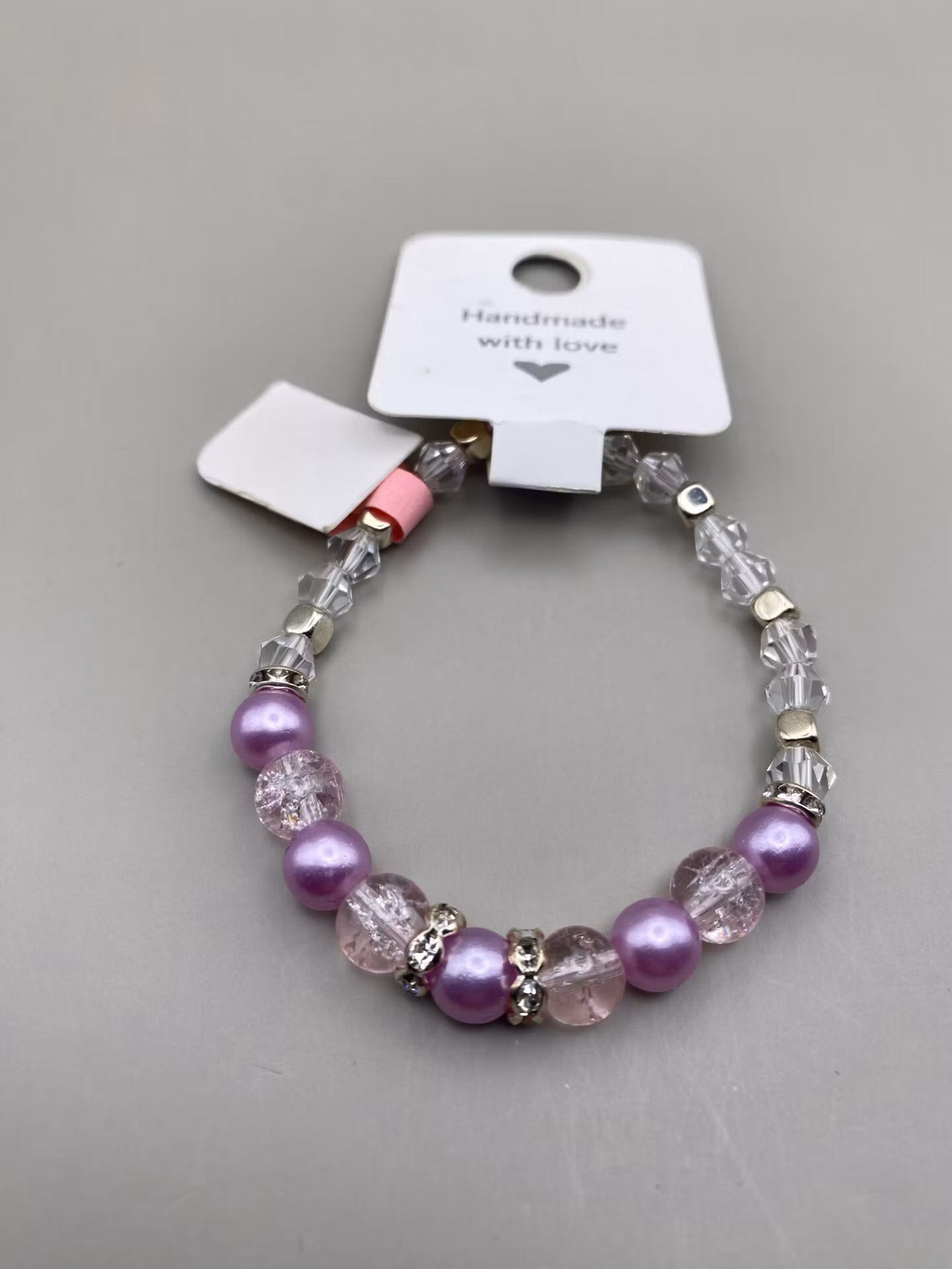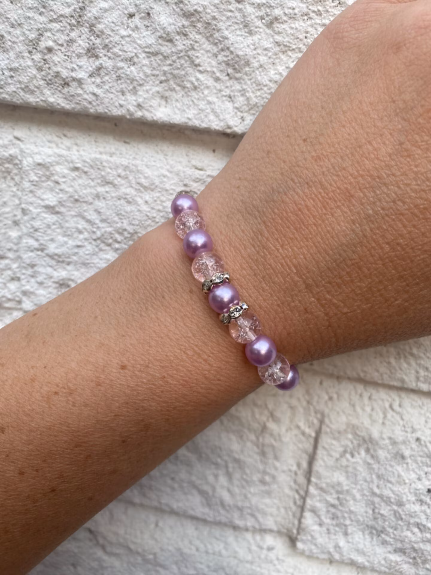 Lila-rosa pärlor, transparenta glaspärlor och silverstrass – ett stilrent blickfång.