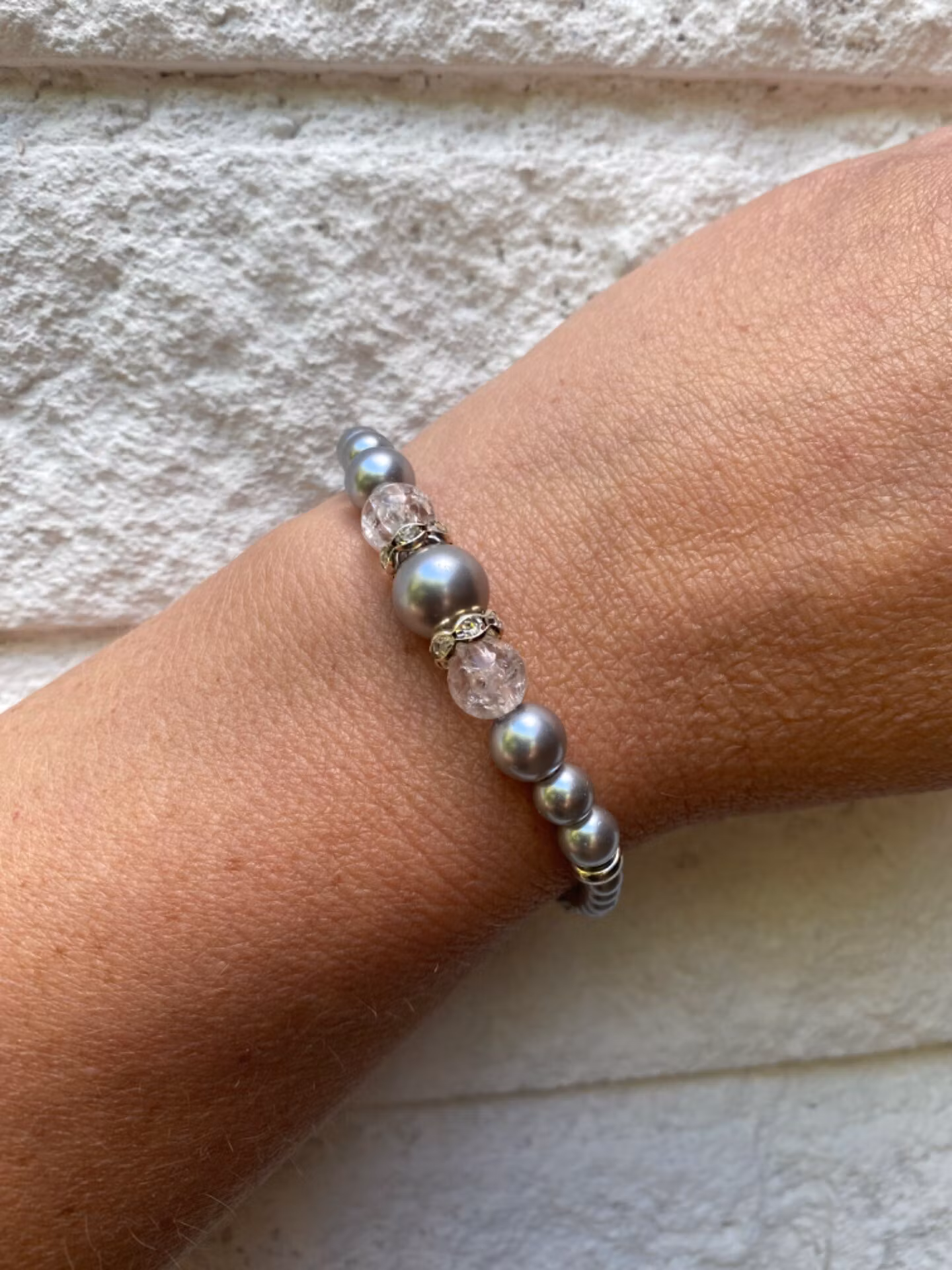 Armband i silvergrå pärlor varvade med genomskinliga och grå glaspärlor, prytt med silverfärgade strassdetaljer som blickfång. En sofistikerad och elegant accessoar som lyfter din stil.