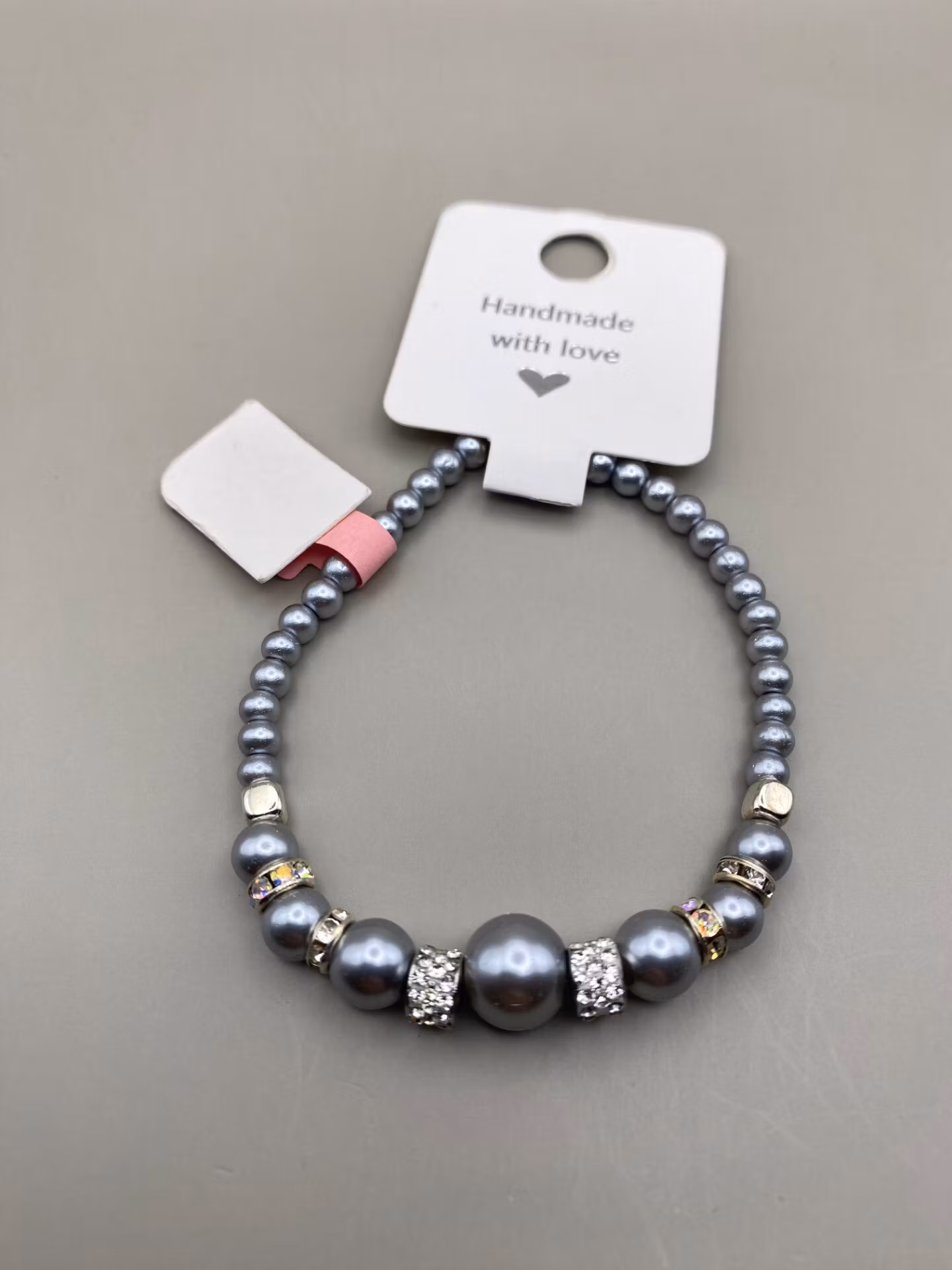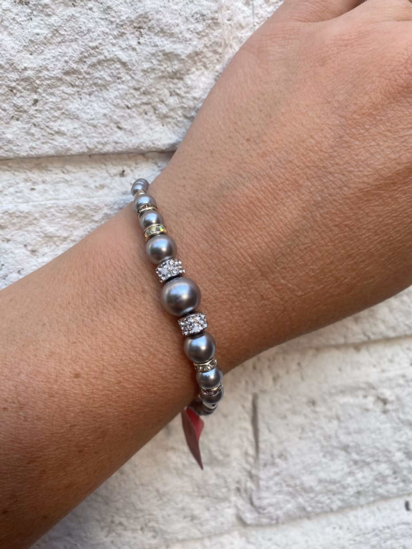 Armband i silvergrå pärlor med gnistrande silvriga strassdetaljer som blickfång. En tidlös och elegant accessoar som lyfter din stil.Pärlor 4mm, 6mm, 8mm, 10mm