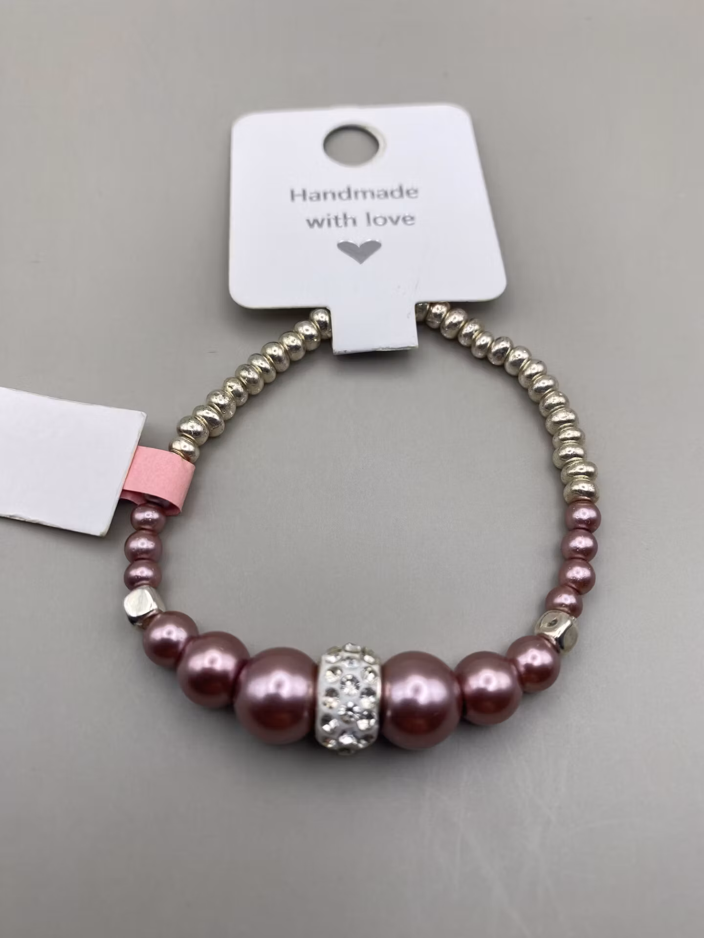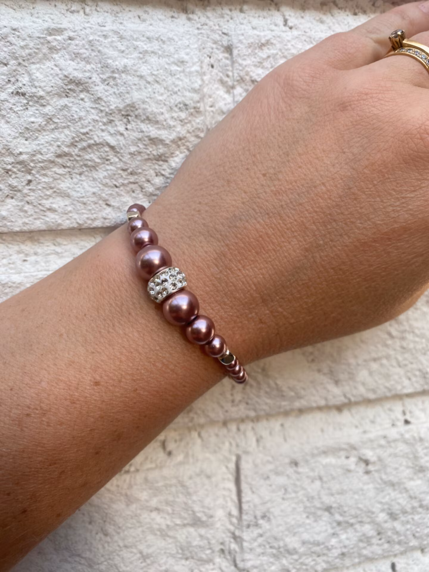 Armband i dovt lila pärlor med en stor silverstrassdetalj och silverfärgade glaspärlor som blickfång. En elegant och tidlös accessoar som lyfter din stil.Pärlor