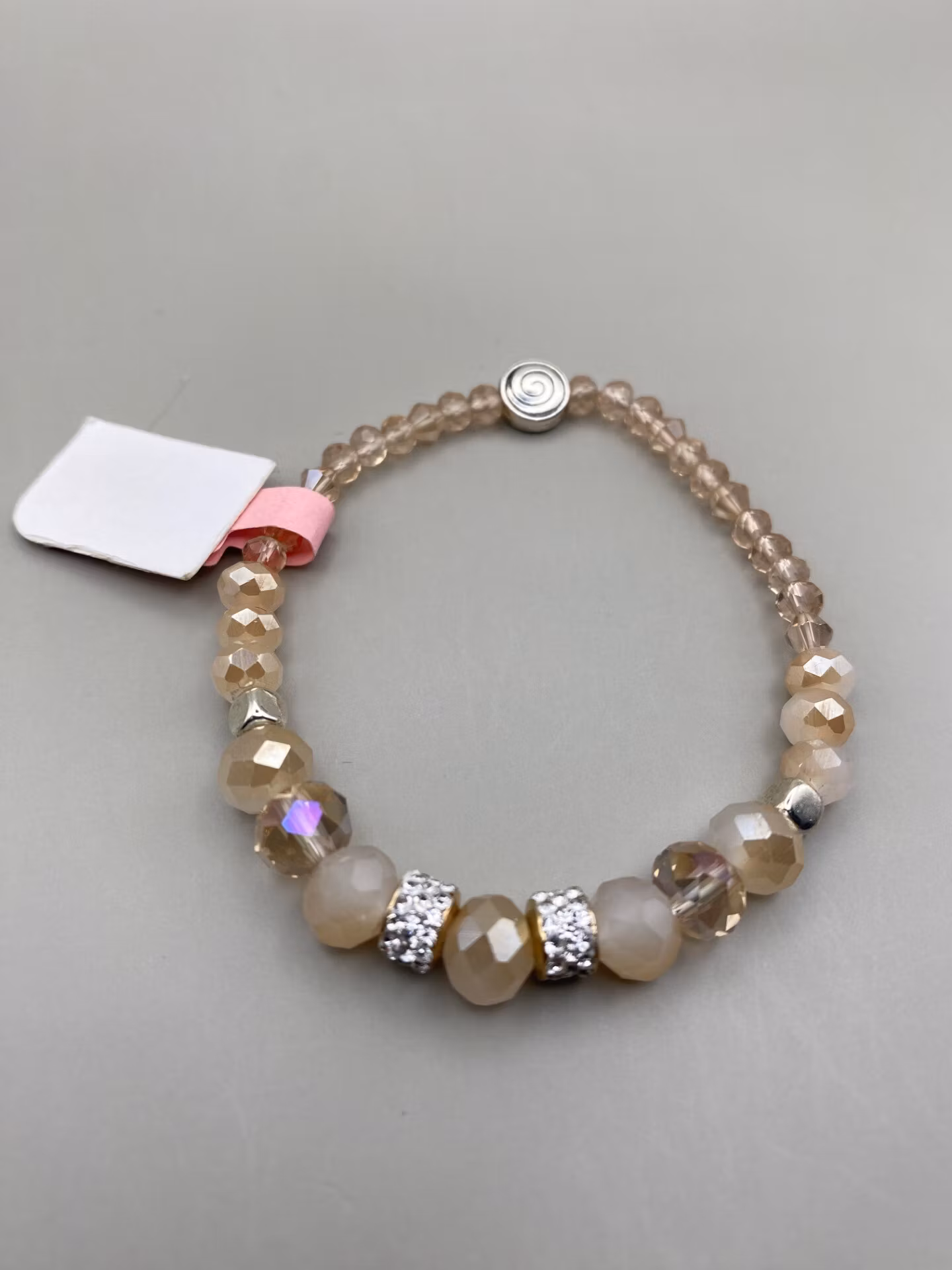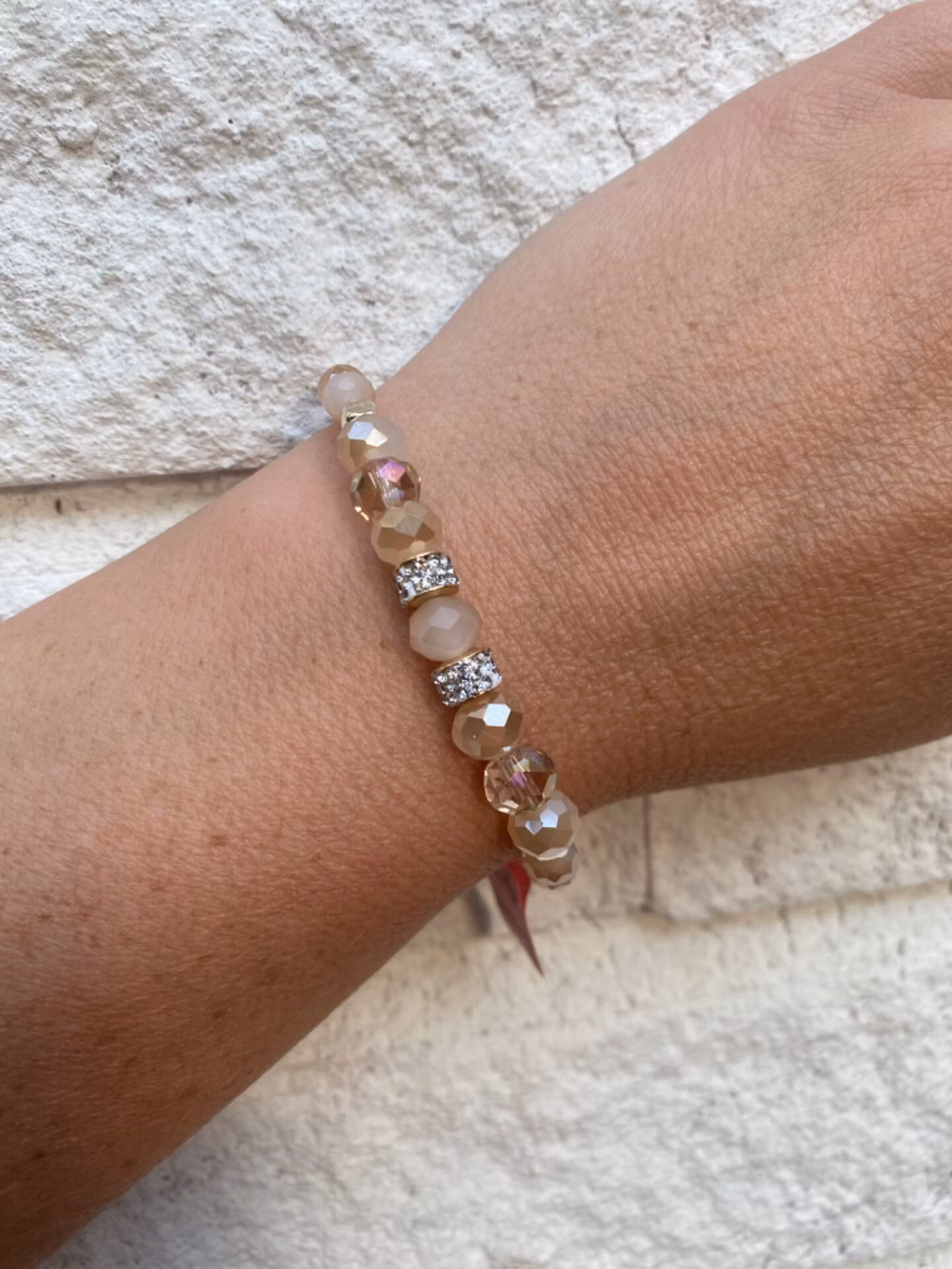Armband i lyxiga, ljusa aprikosa toner av glaspärlor med gnistrande strassdetaljer som blickfång. En mjuk och elegant accessoar som lyfter din stil..
