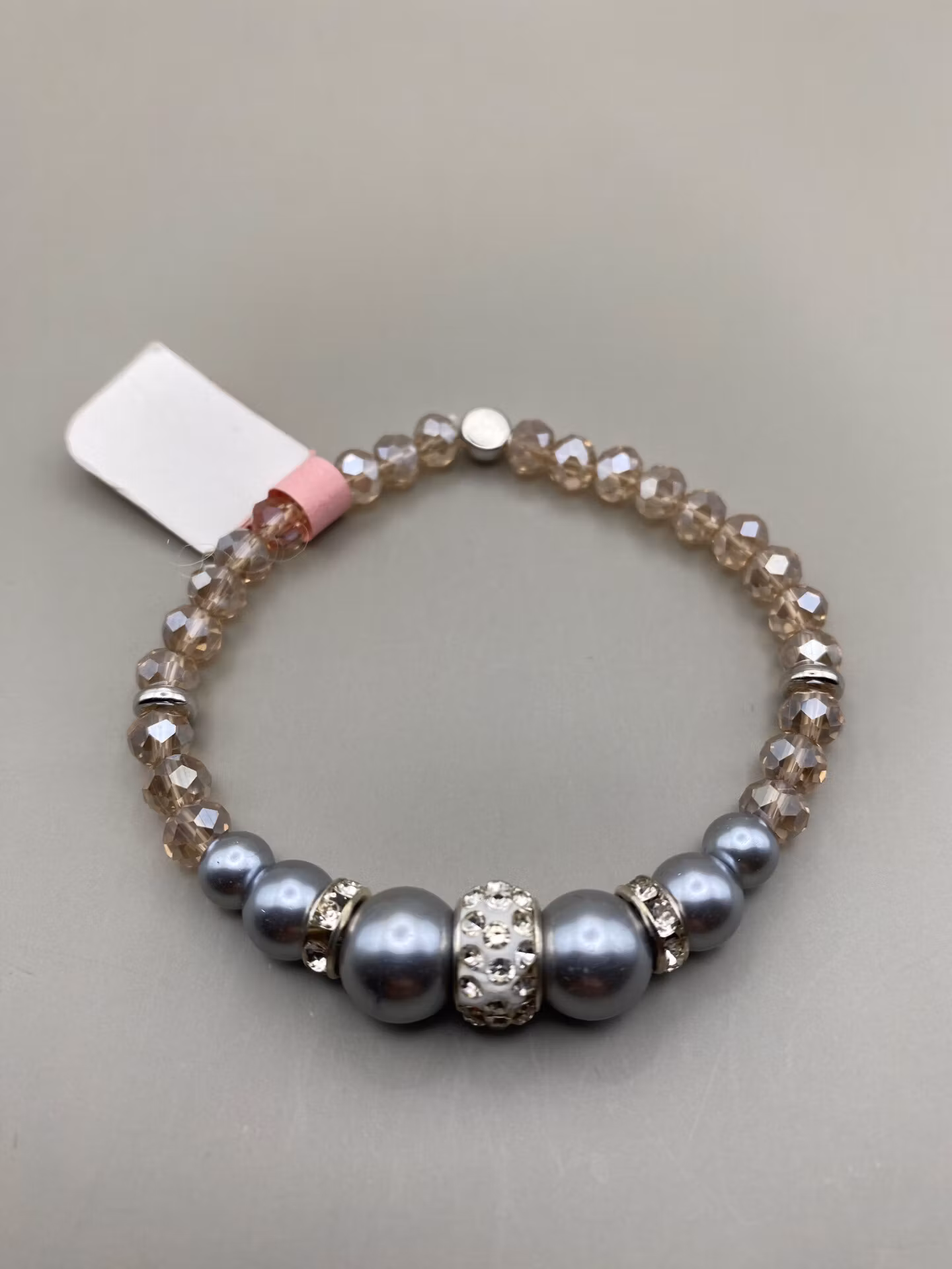 Armband i silvergrå pärlor, med silverfärgade strassdetaljer i blickfånget, champagnefärgade glaspärlor och silverfärgade detaljer
