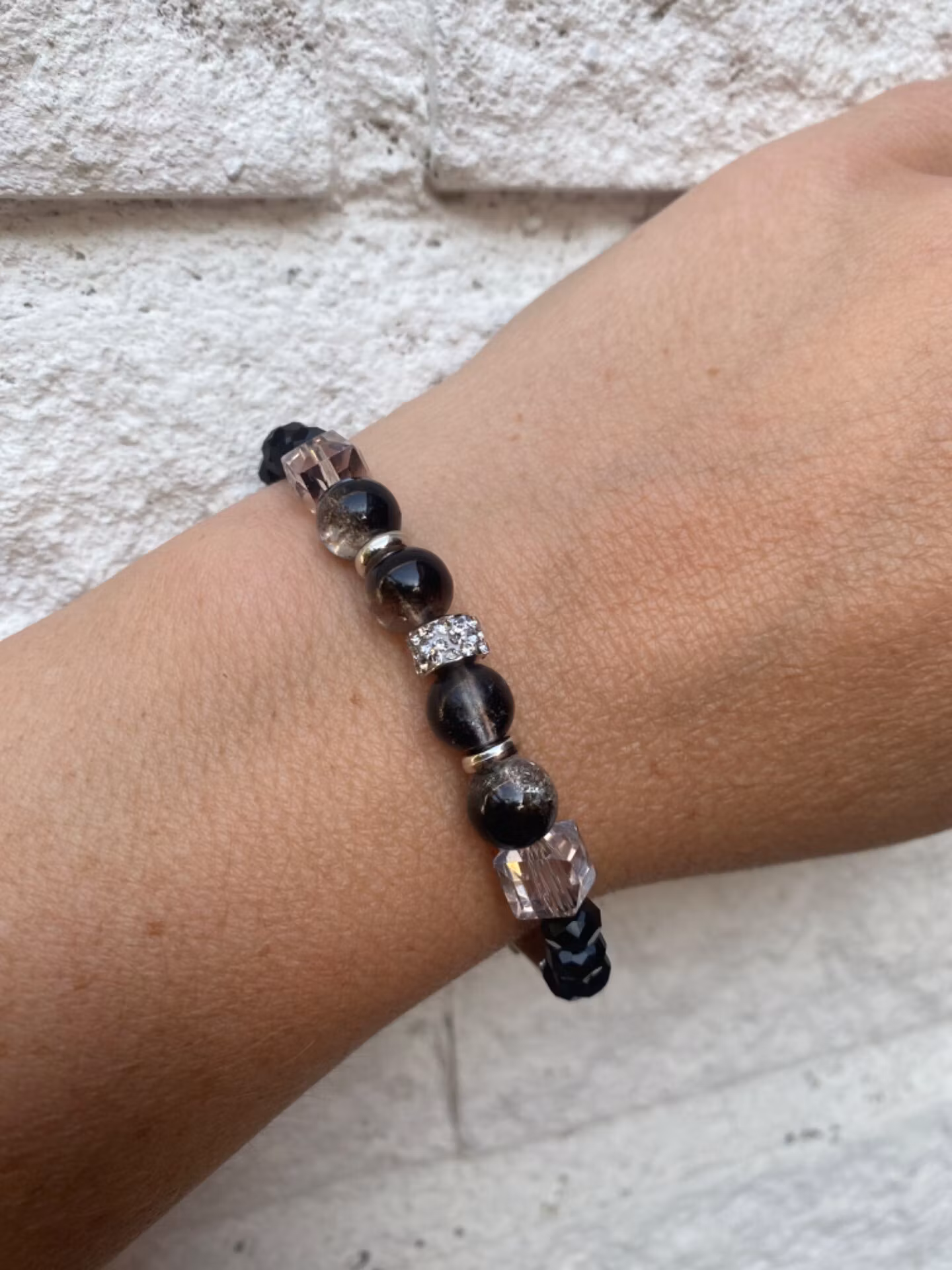 Armband i svart mellerade glaspärlor med strass i blickfånget och fyrkantiga glaspärlor, varvat med svarta glaspärlor, silverfärgade detaljer Pärlor 6mm, 8mm