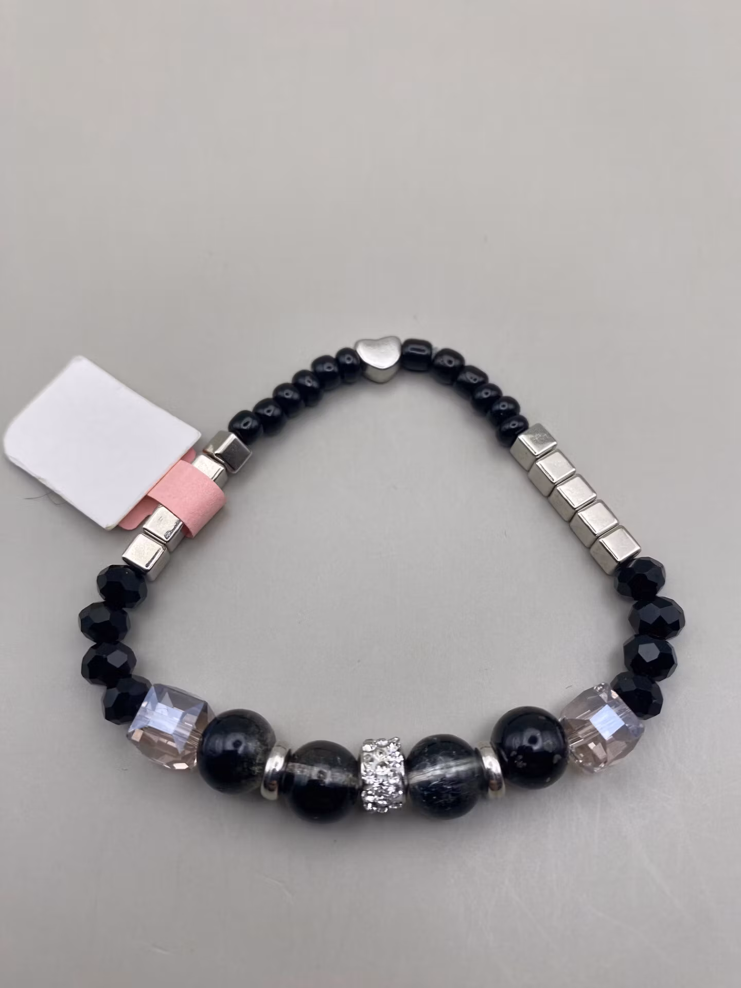 Armband i svart mellerade glaspärlor med strass i blickfånget och fyrkantiga glaspärlor, varvat med svarta glaspärlor, silverfärgade detaljer