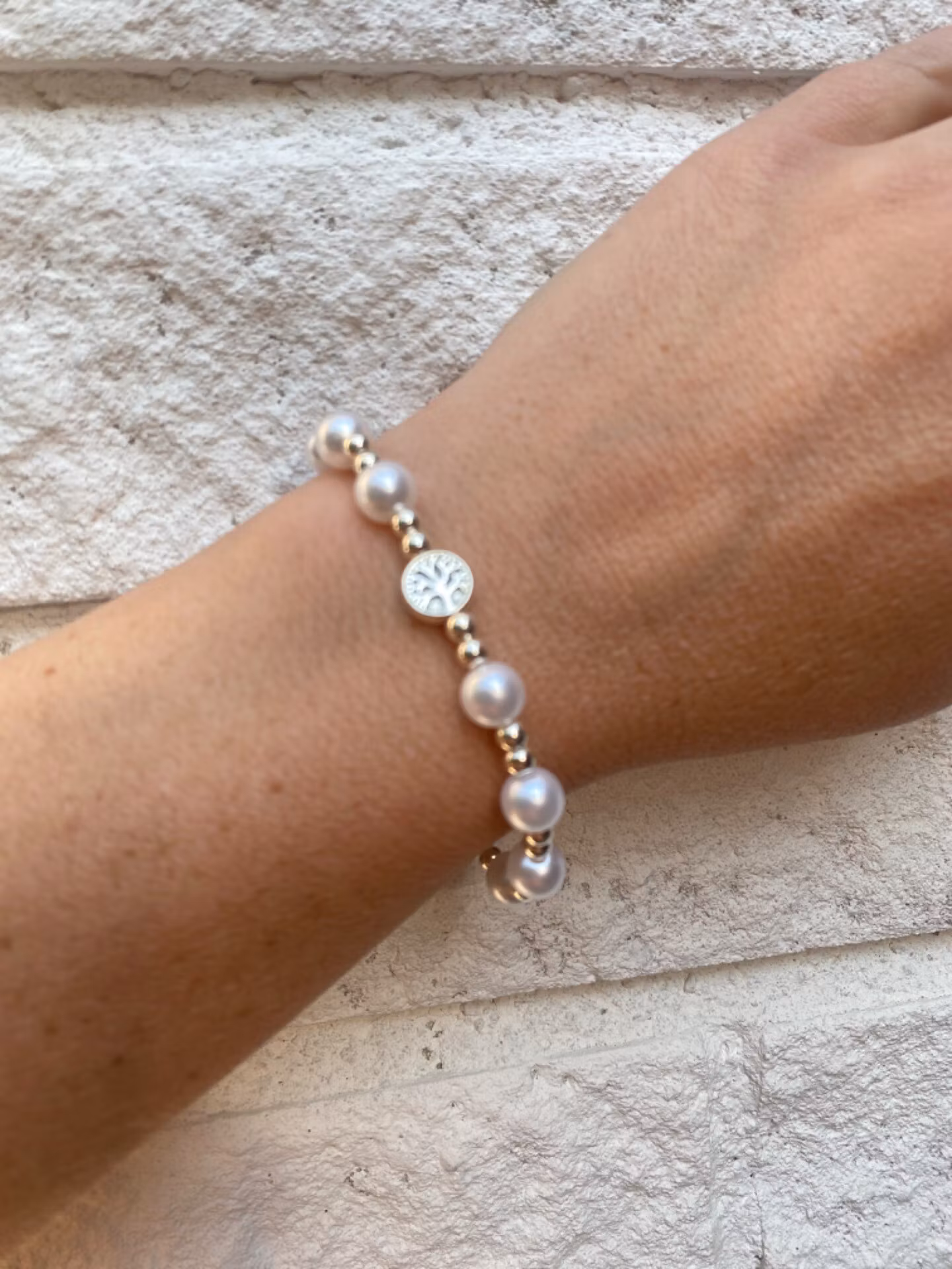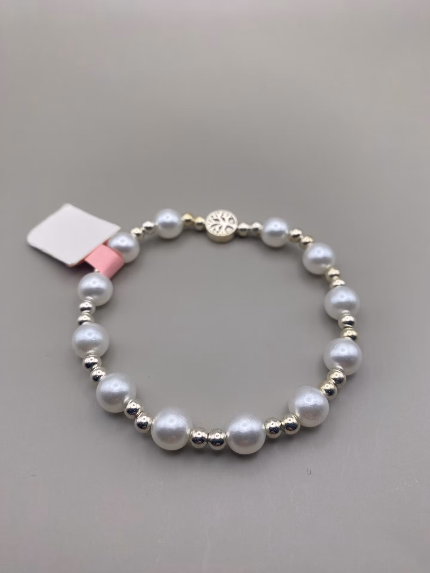 Armband med kritvita vaxade pärlor, varvat med silverfärgade pärlor samt vacker silverberlock i blickfånget