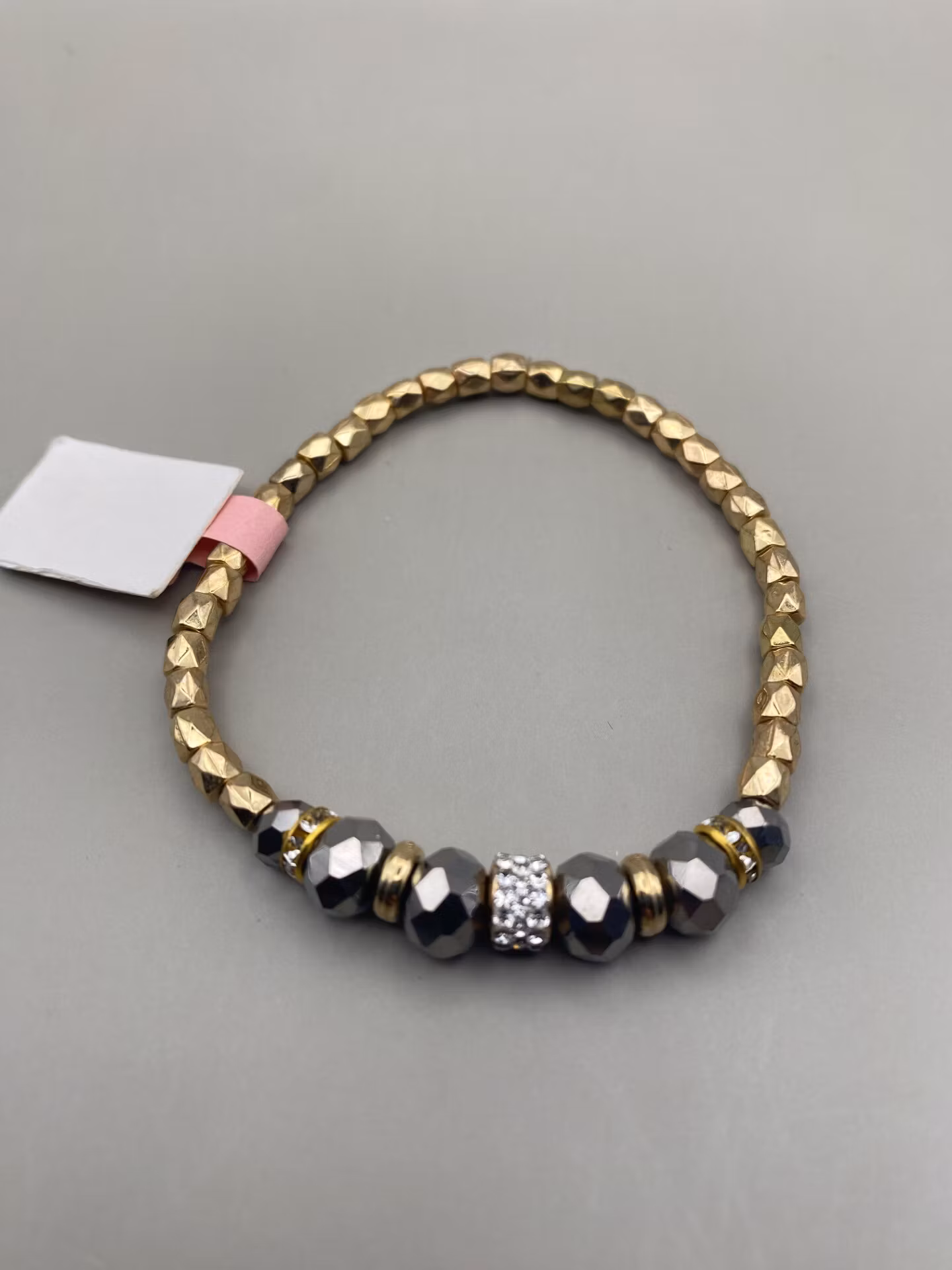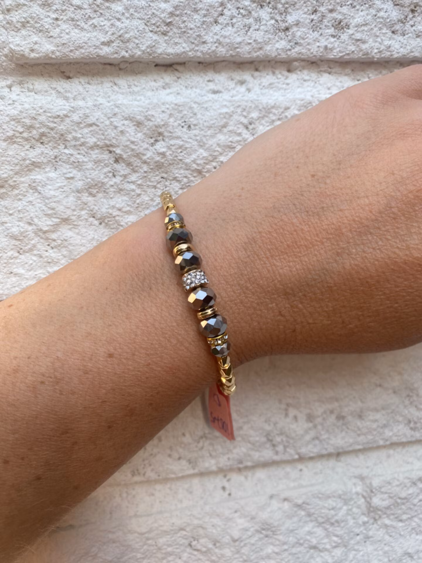 Armband i silvergrå glaspärlor, med silverfärgade strassdetaljer i blickfånget, guldfärgade pärlor runt om.