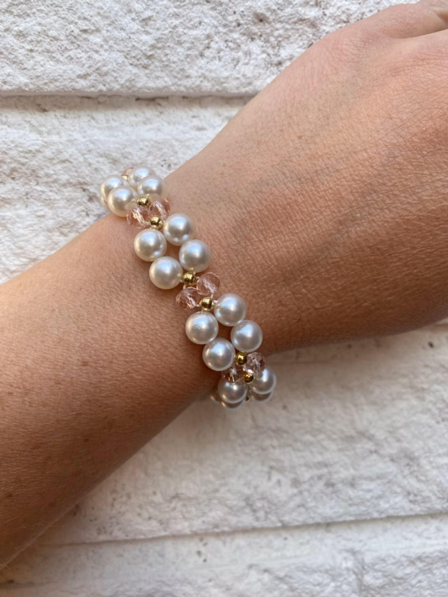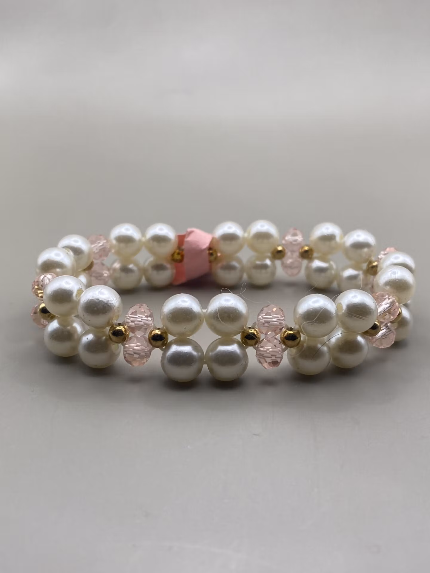 Armband med dubbelradigt benvita vaxade pärlor, varvat med ljusrosa glaspärlor samt guldfärgade pärlor