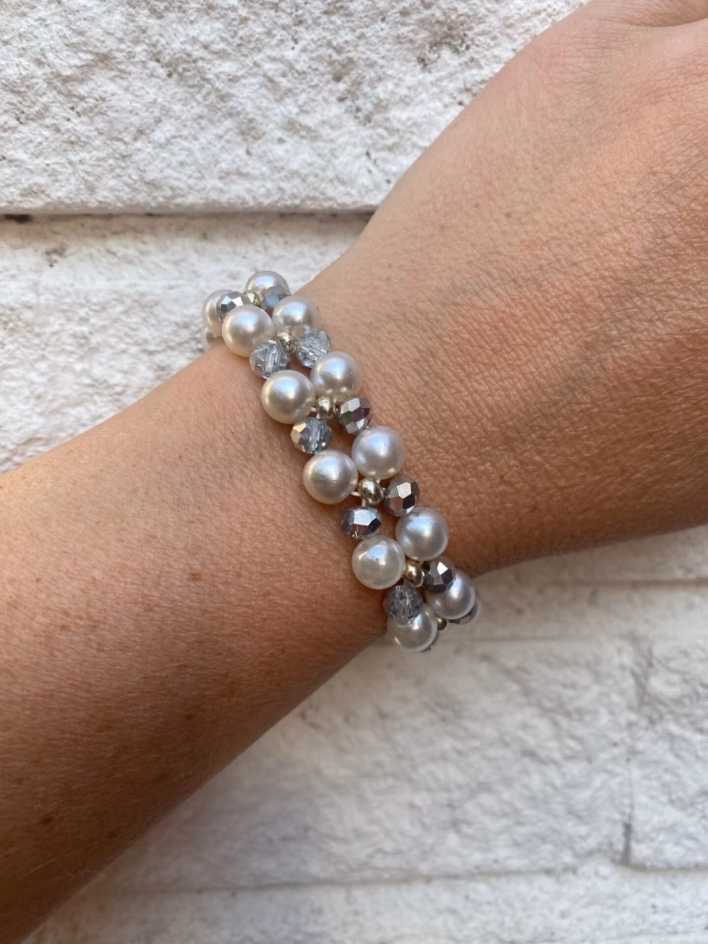 Armband med dubbelradigt benvita vaxade pärlor, varvat med grå silverfärgade glaspärlor samt samt silverfärgade pärlorPärlor 6mm, 8mm
