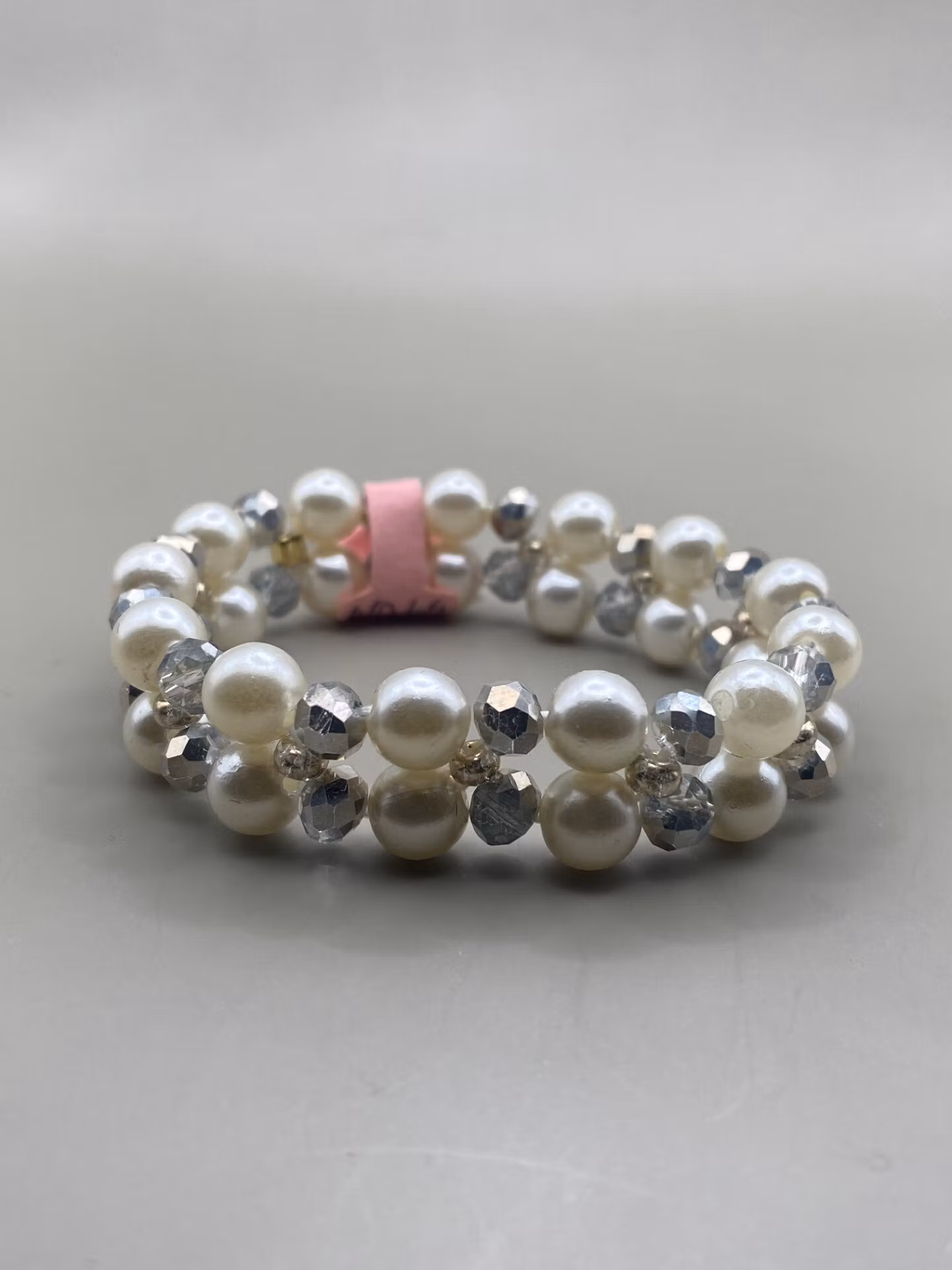 Armband med dubbelradigt benvita vaxade pärlor, varvat med grå silverfärgade glaspärlor samt samt silverfärgade pärlor