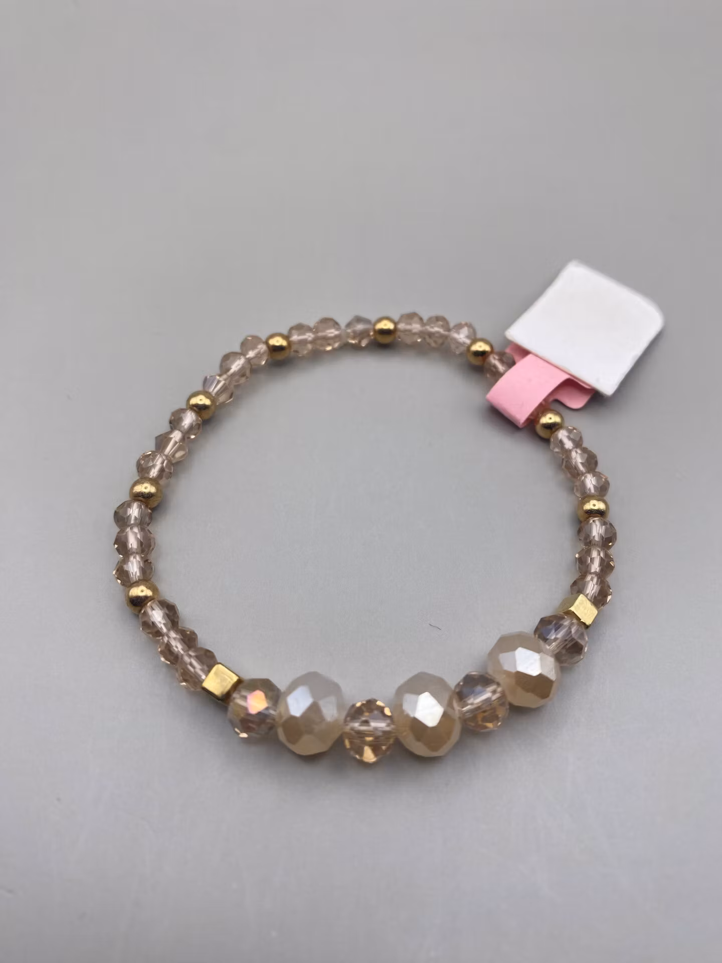 Armband i härligt champagnefärgade glaspärlor varvat med guldfärgade detaljer och större aprikosfärgade pärlor i blickfånget