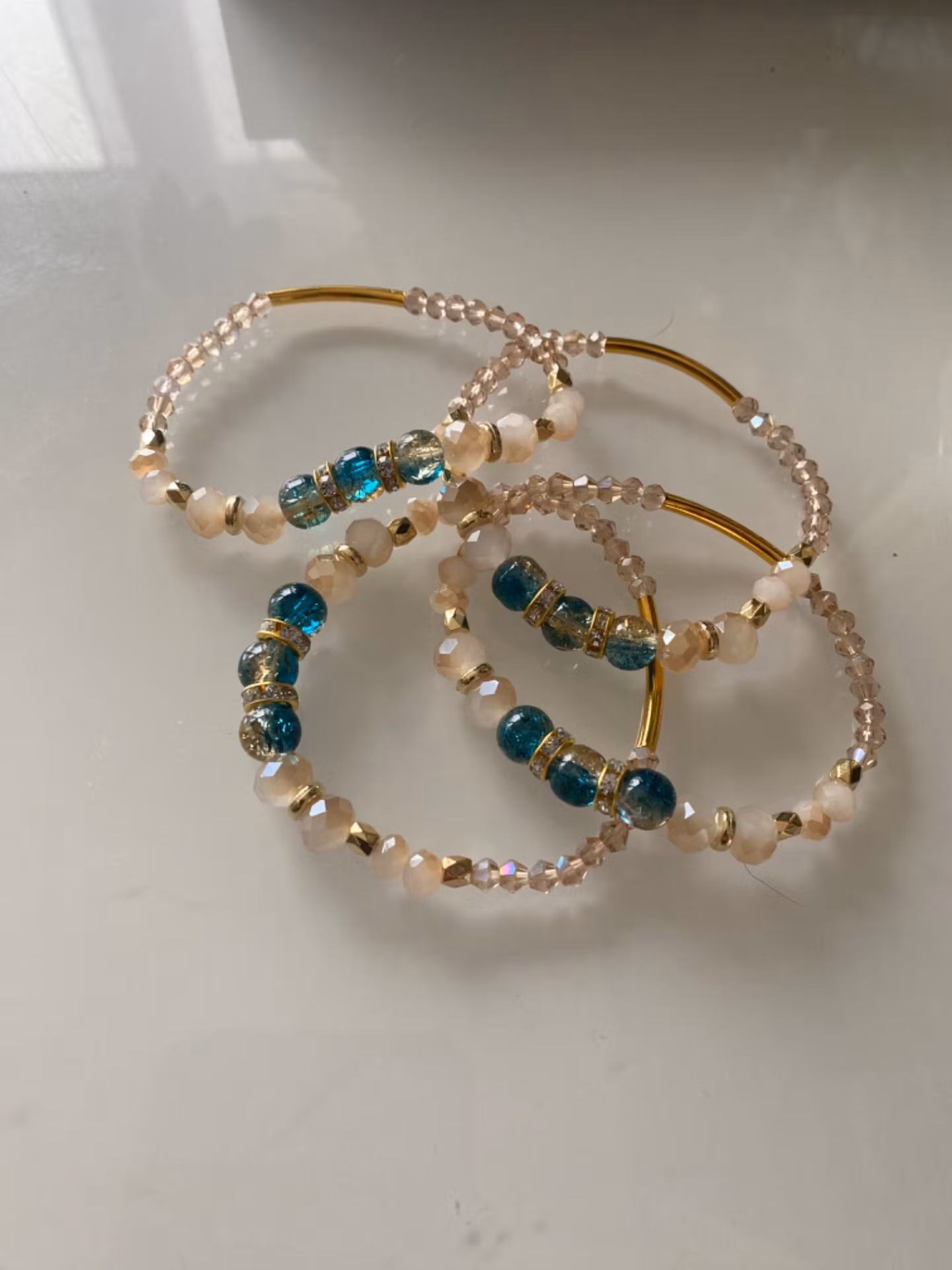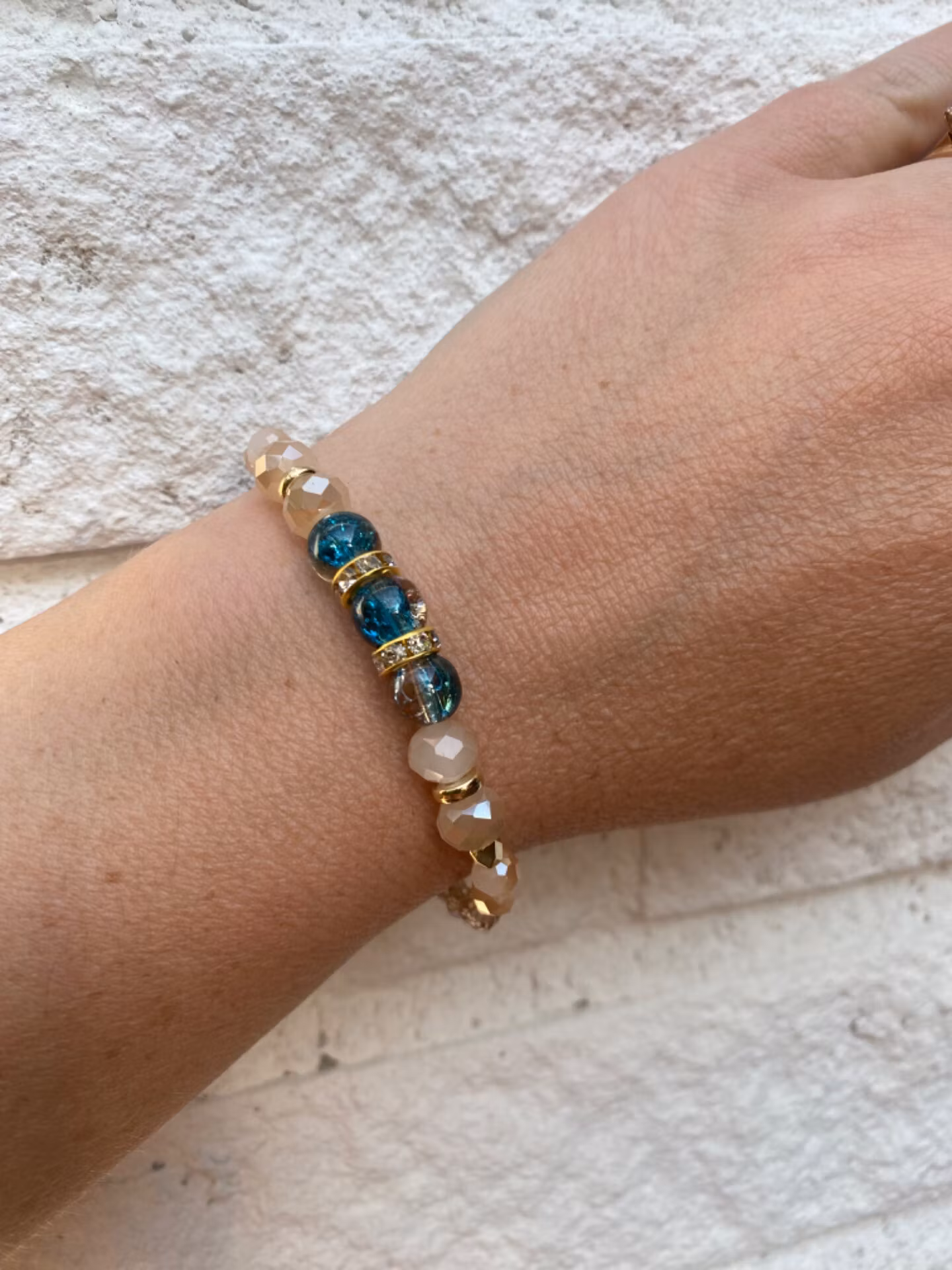 Armband i varvat aprikosfärgade och champagnefärgade glaspärlor, turkos mellererade glaspärlor i blickfånget, guldfärgade detaljer och strass.
