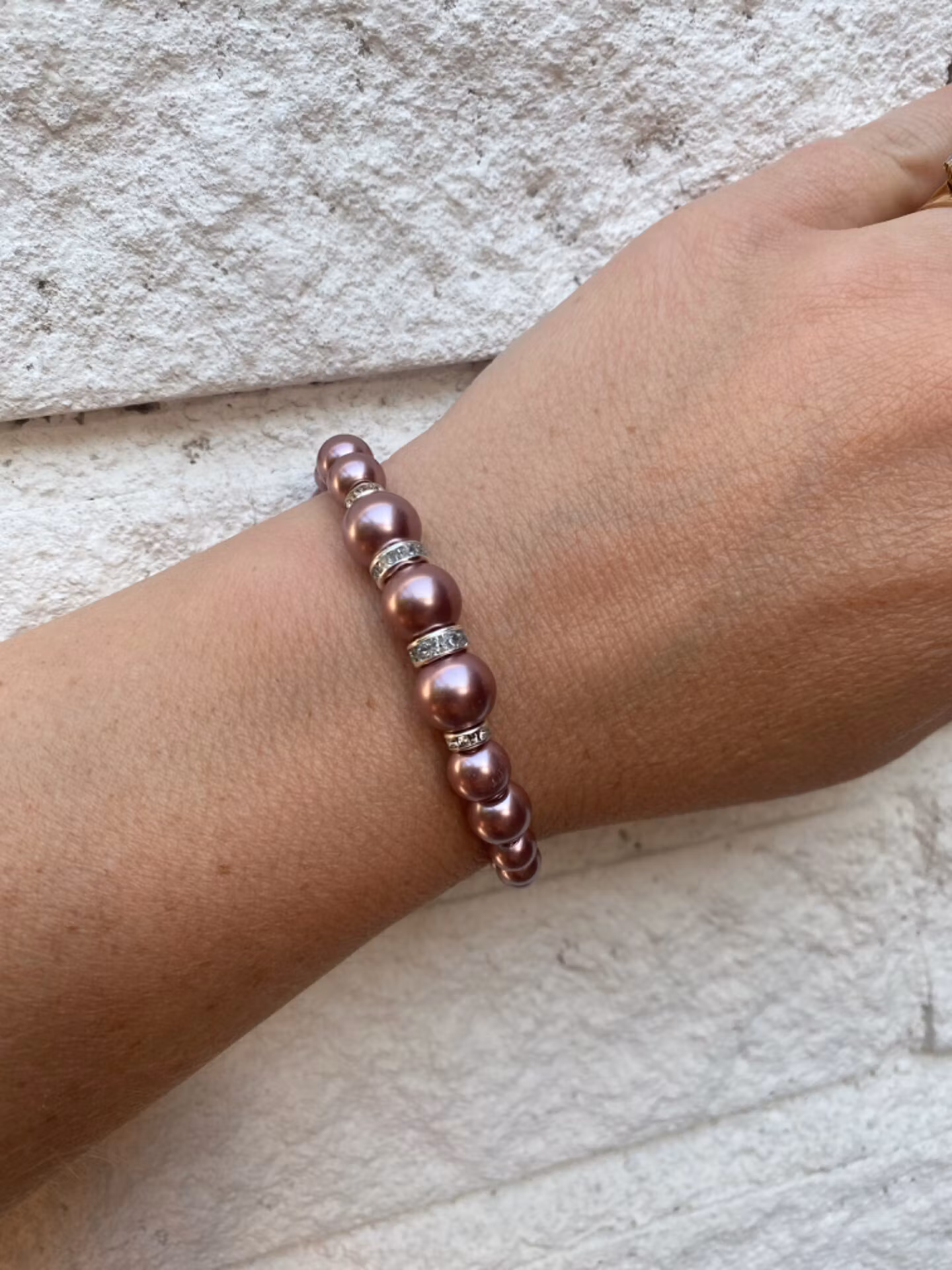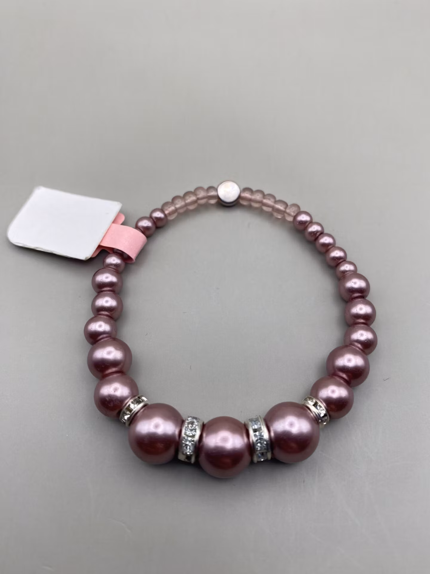 Armband i dovt lila pärlor, silverfärgade strassdetaljer, lila glaspärlor och roséfärgad stopp-platta.