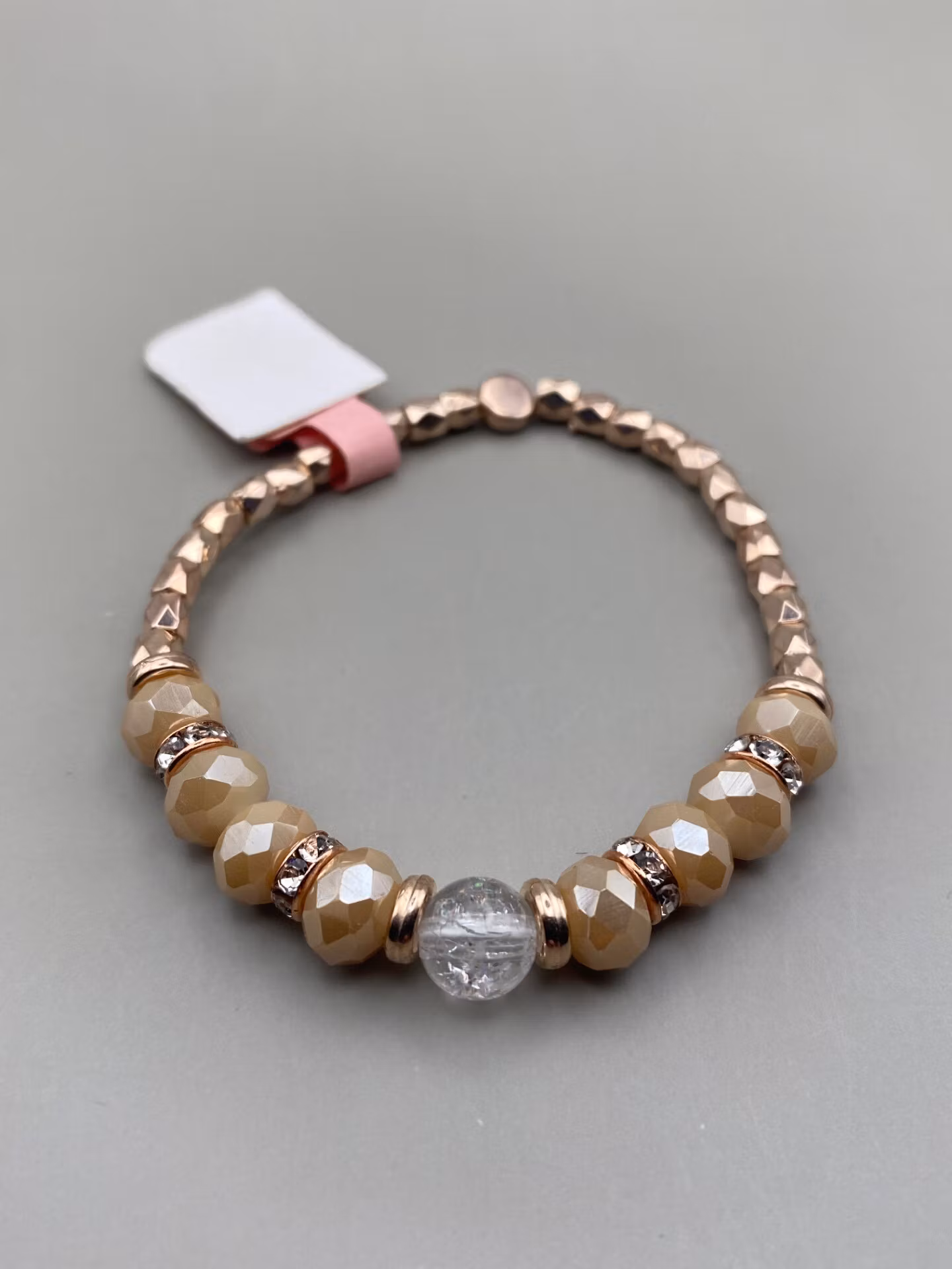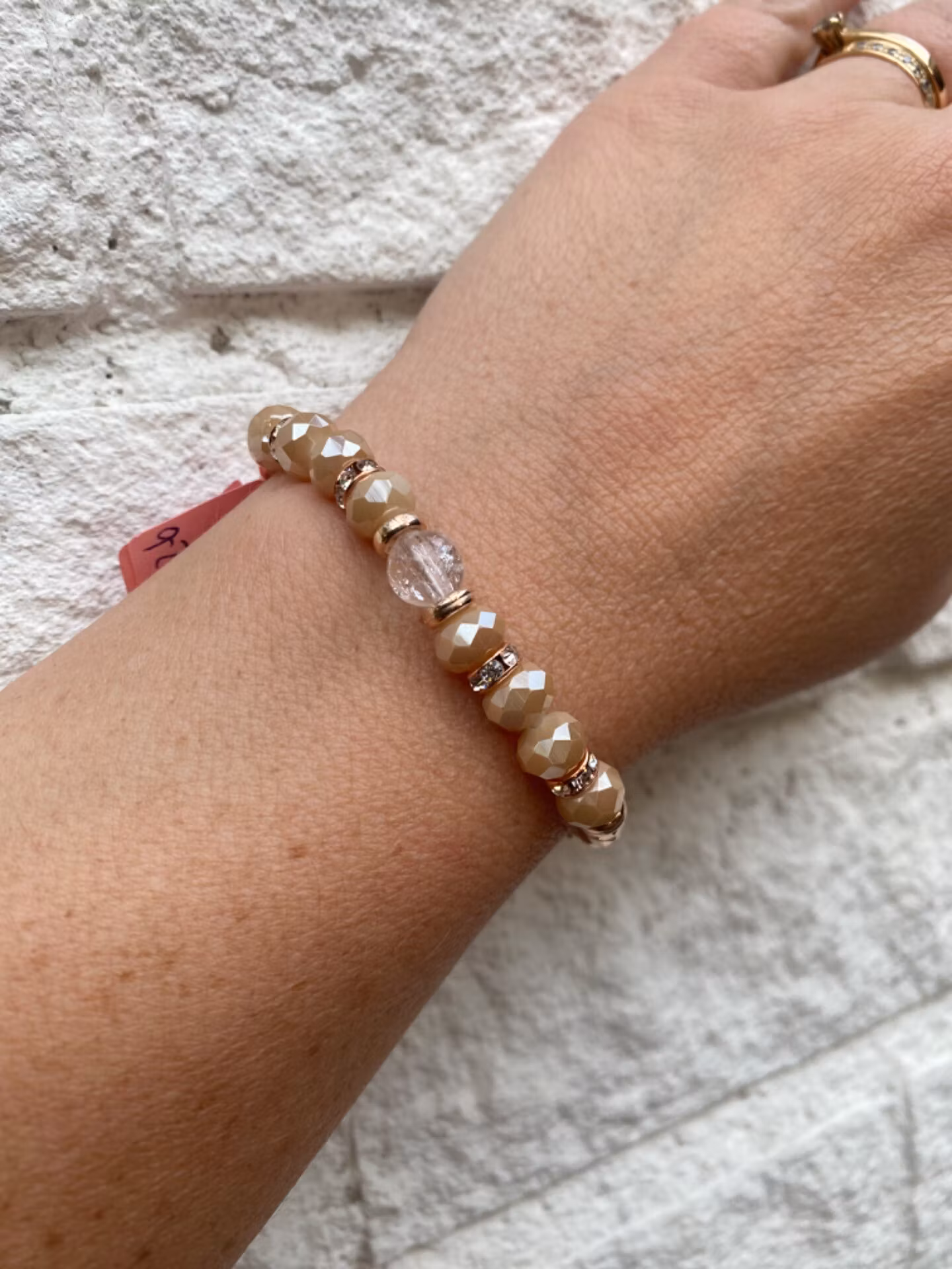Armband med pärlor i varma aprikosa toner, roséfärgade detaljer och en vacker glaspärla som blickfång. En mjuk och feminin accessoar som lyfter vilken outfit som helst.