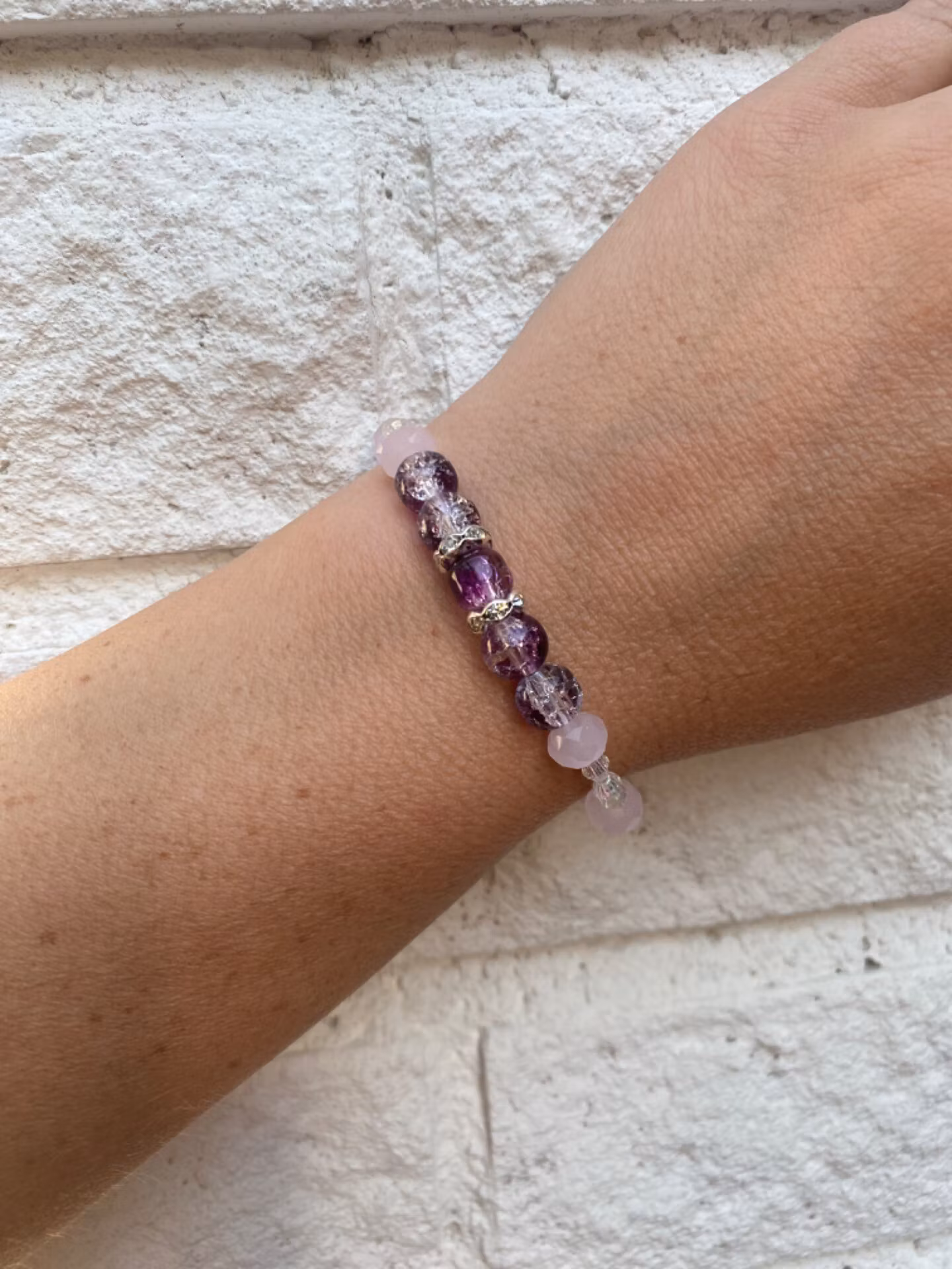 Armband i lila och ljusrosa toner, ljusrosa frostade glaspärlor varvat med vita samt lilamellerade glaspärlor i blickfånget och strassdetaljer
