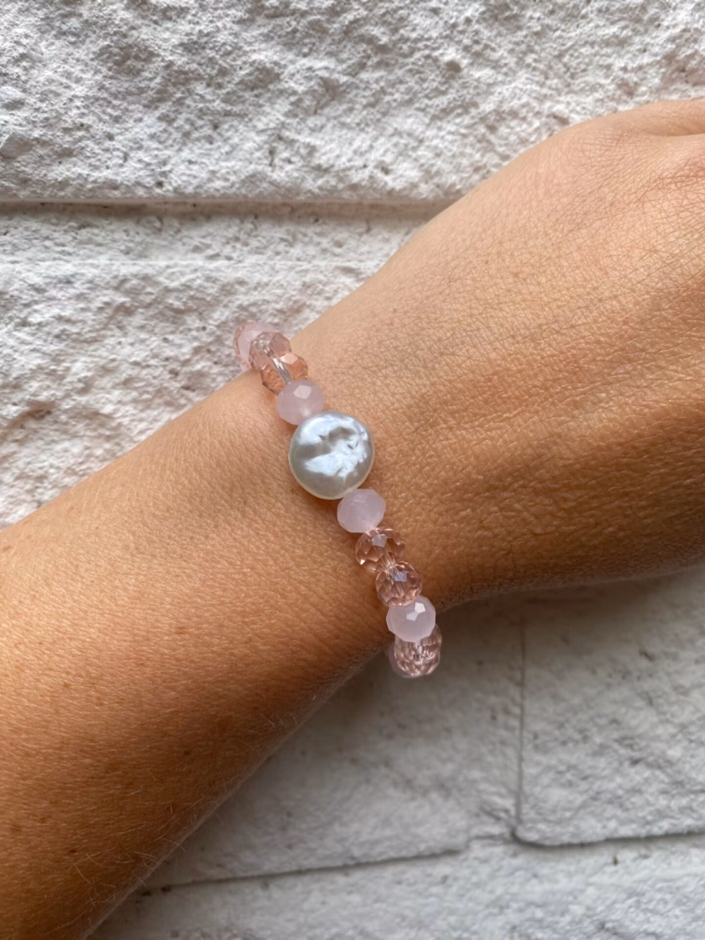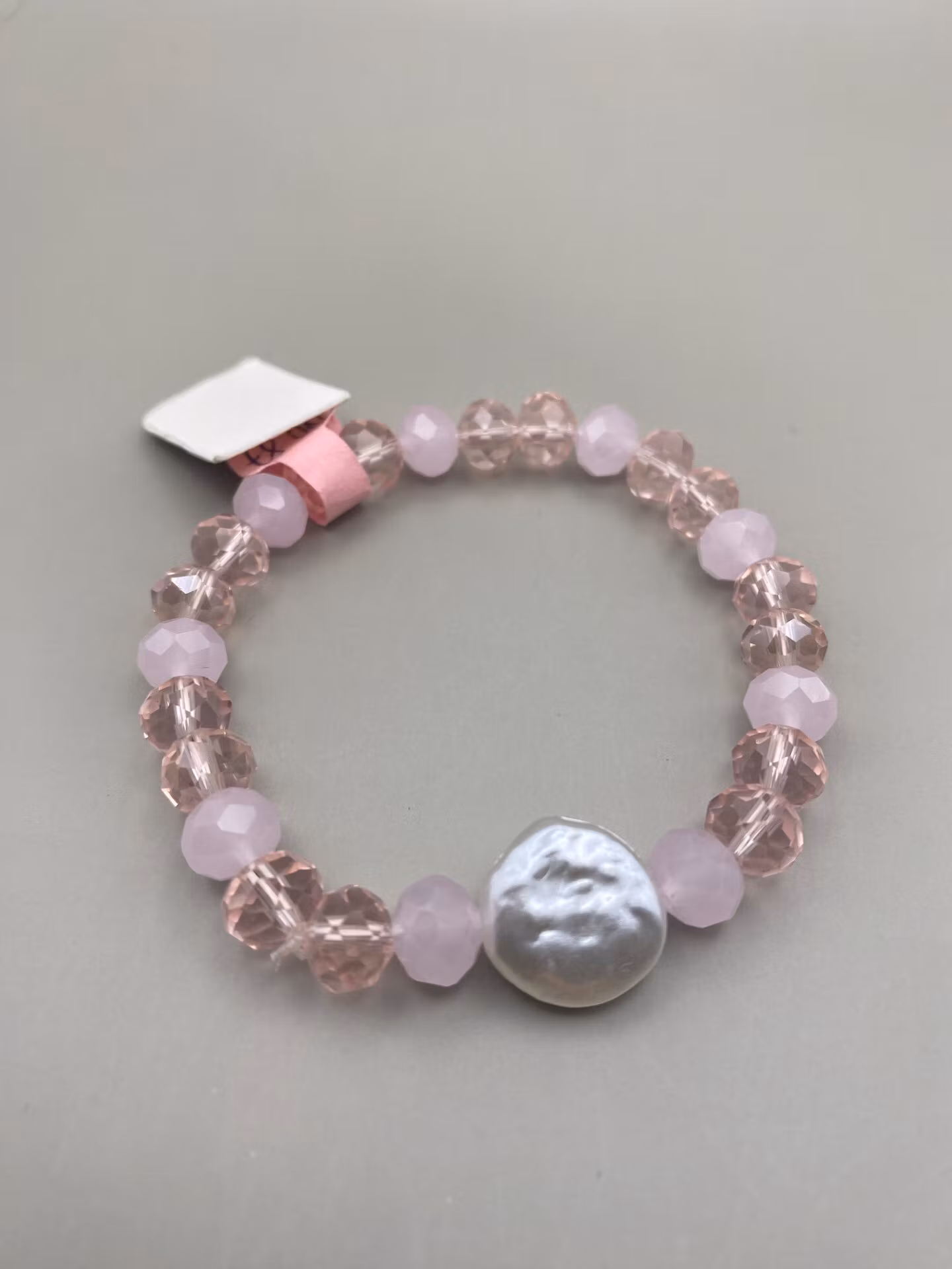 Armband i ljusosa toner, ljusrosa frostade glaspärlor varvat med rosa glaspärlor och vit platt pärla i blickfånget
