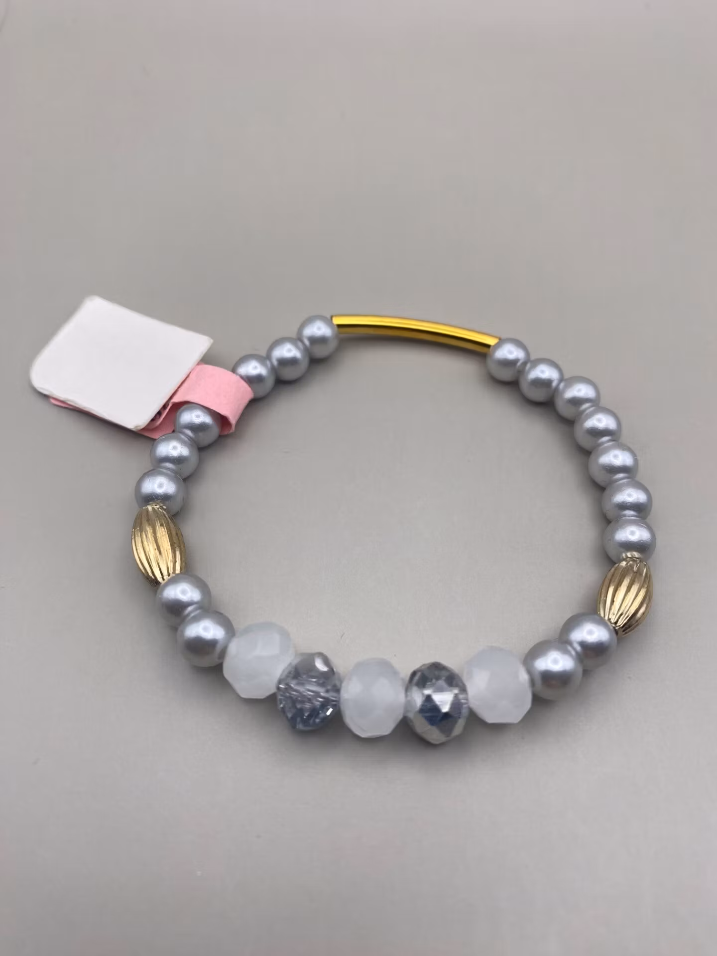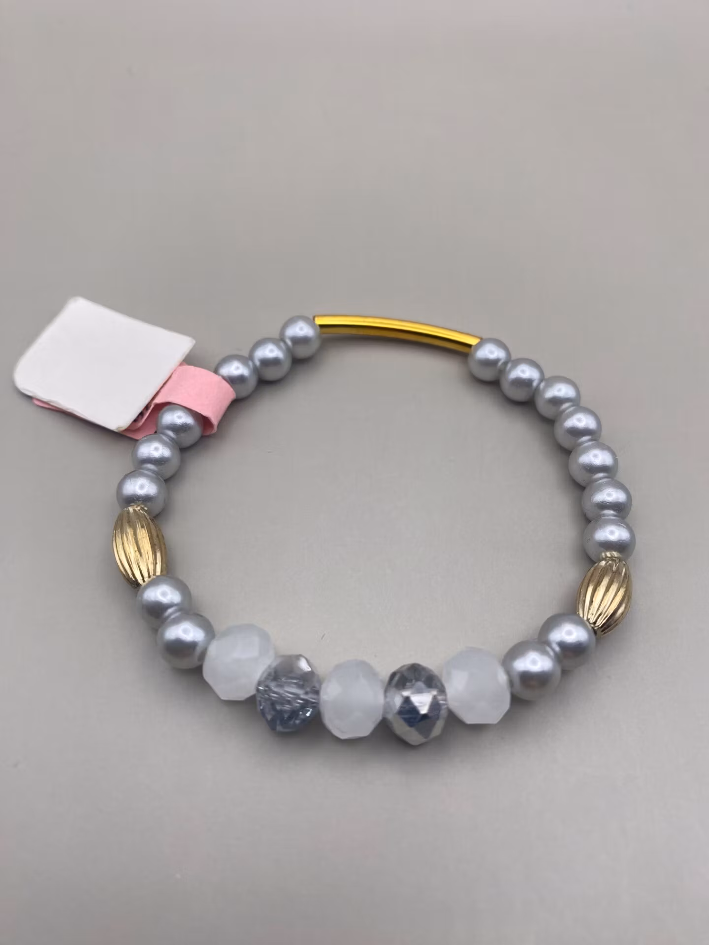 Armband i silvergrå pärlor varvat med guldfärgade pärlor och detaljer samt silvergrå glaspärlor och vita frostade glaspärlor