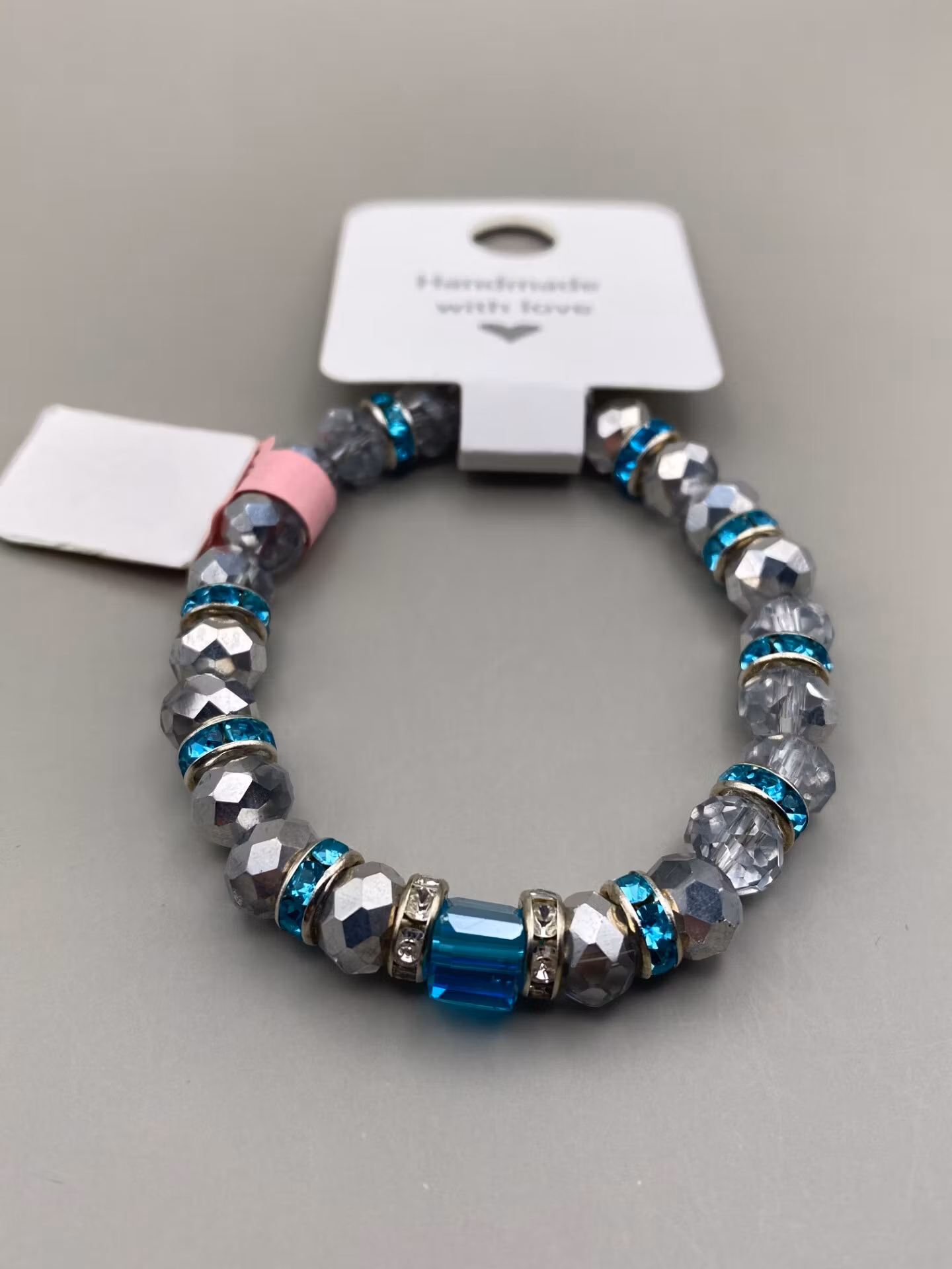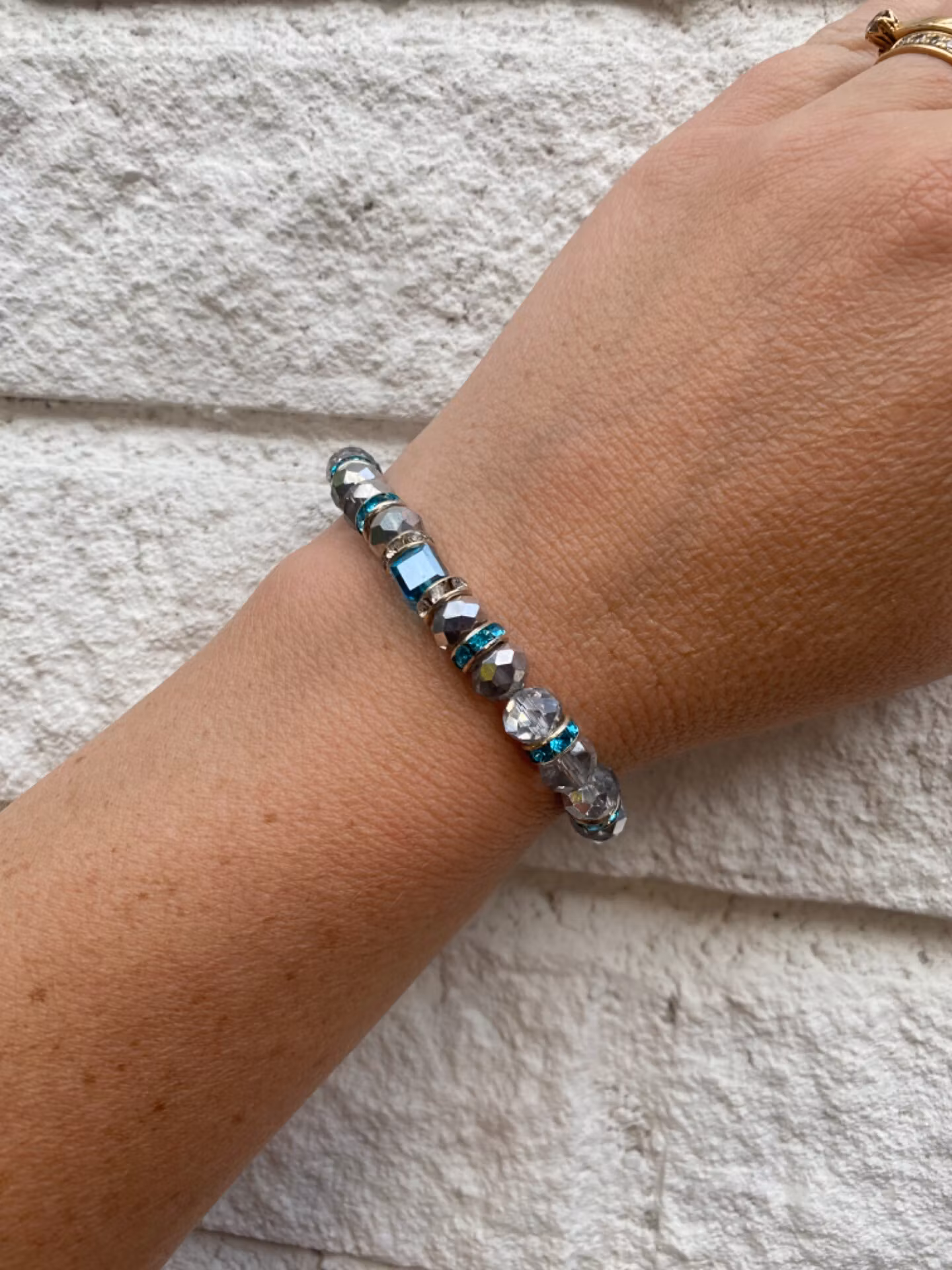 Silvergrått armband med blå toner och en fyrkantig glaspärla som blickfång – en elegant färgklick.