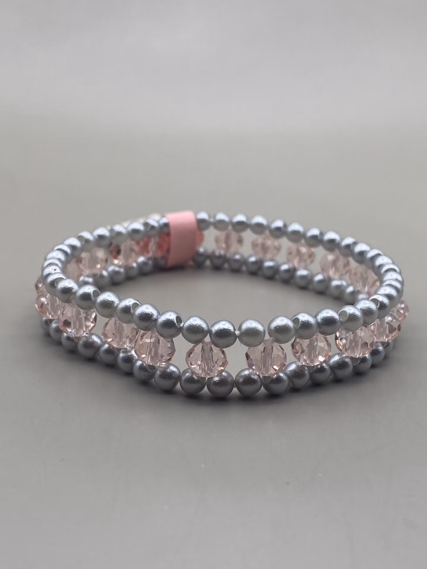 Armband i vackert treradigt mönster av silvergrå pärlor samt ljusrosa glaspärlor i mittenraden