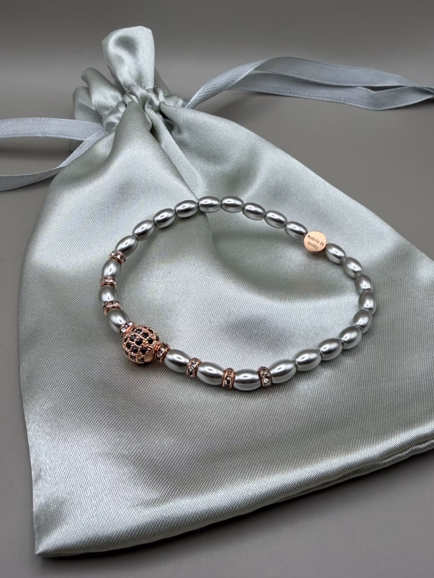 Detta eleganta handgjorda armband är skapat med silvergrå, högblanka risformade sötvattenpärlor av kvalitet AA, noggrant utvalda för sitt vackra lyster och rena