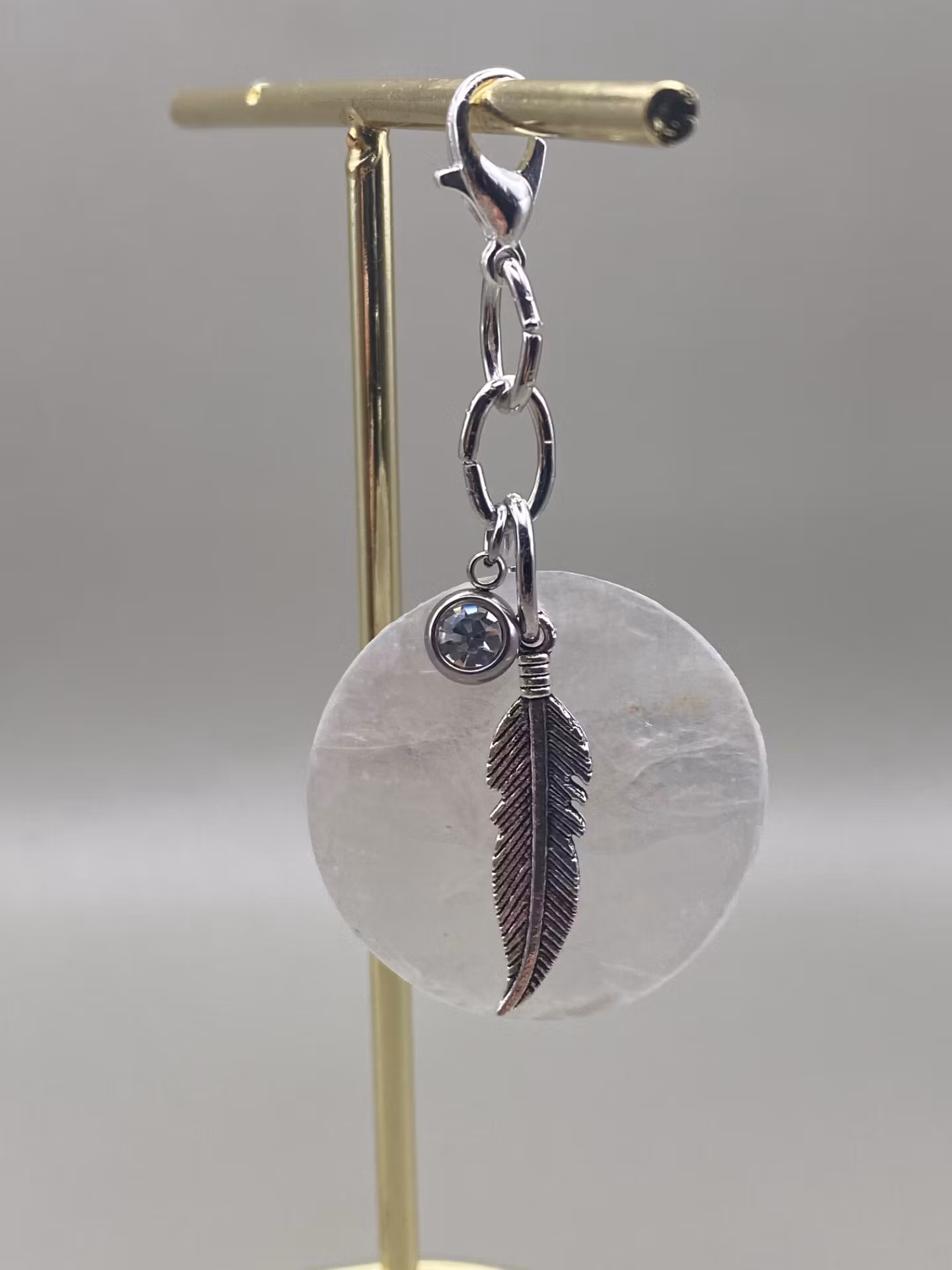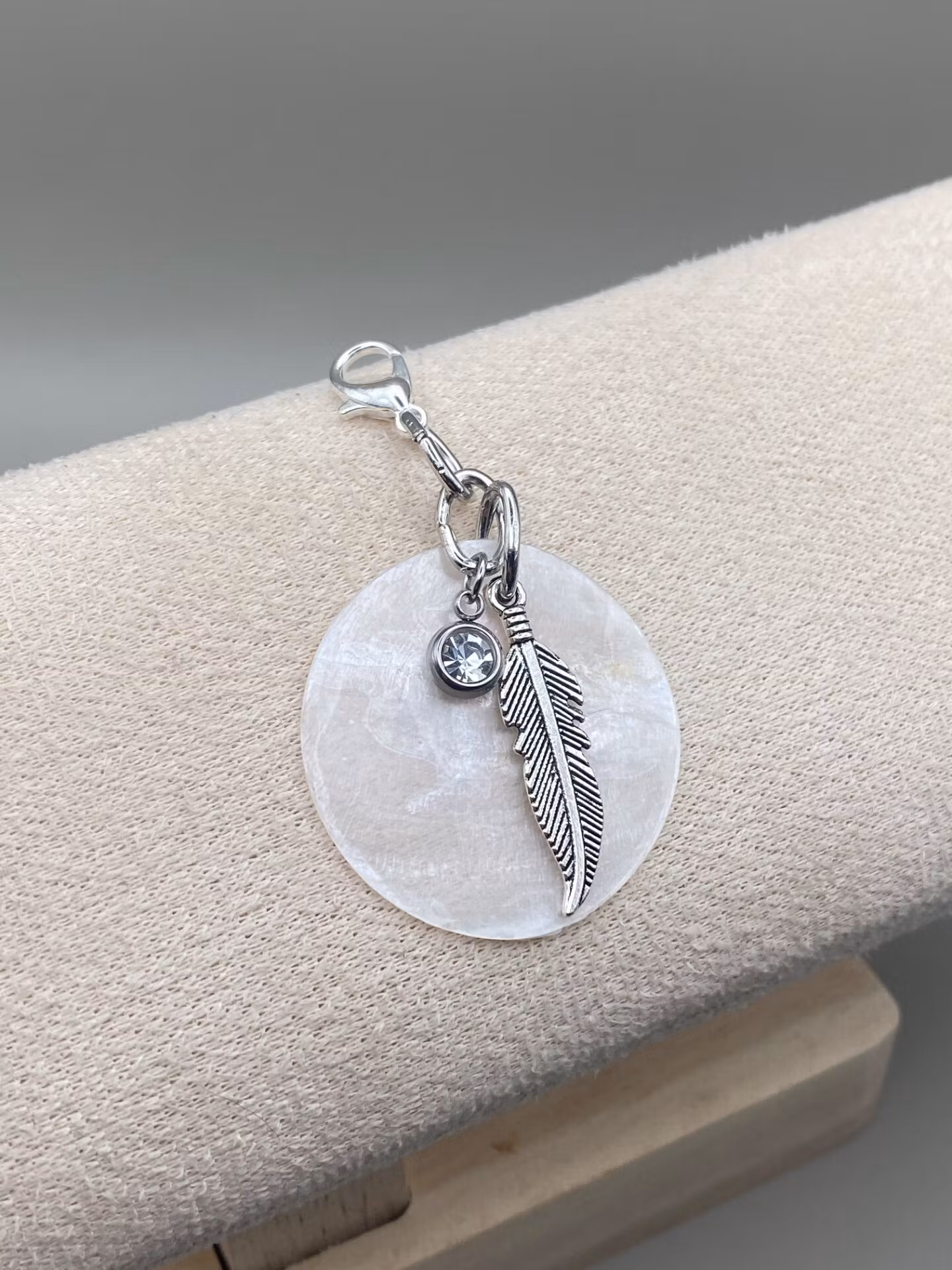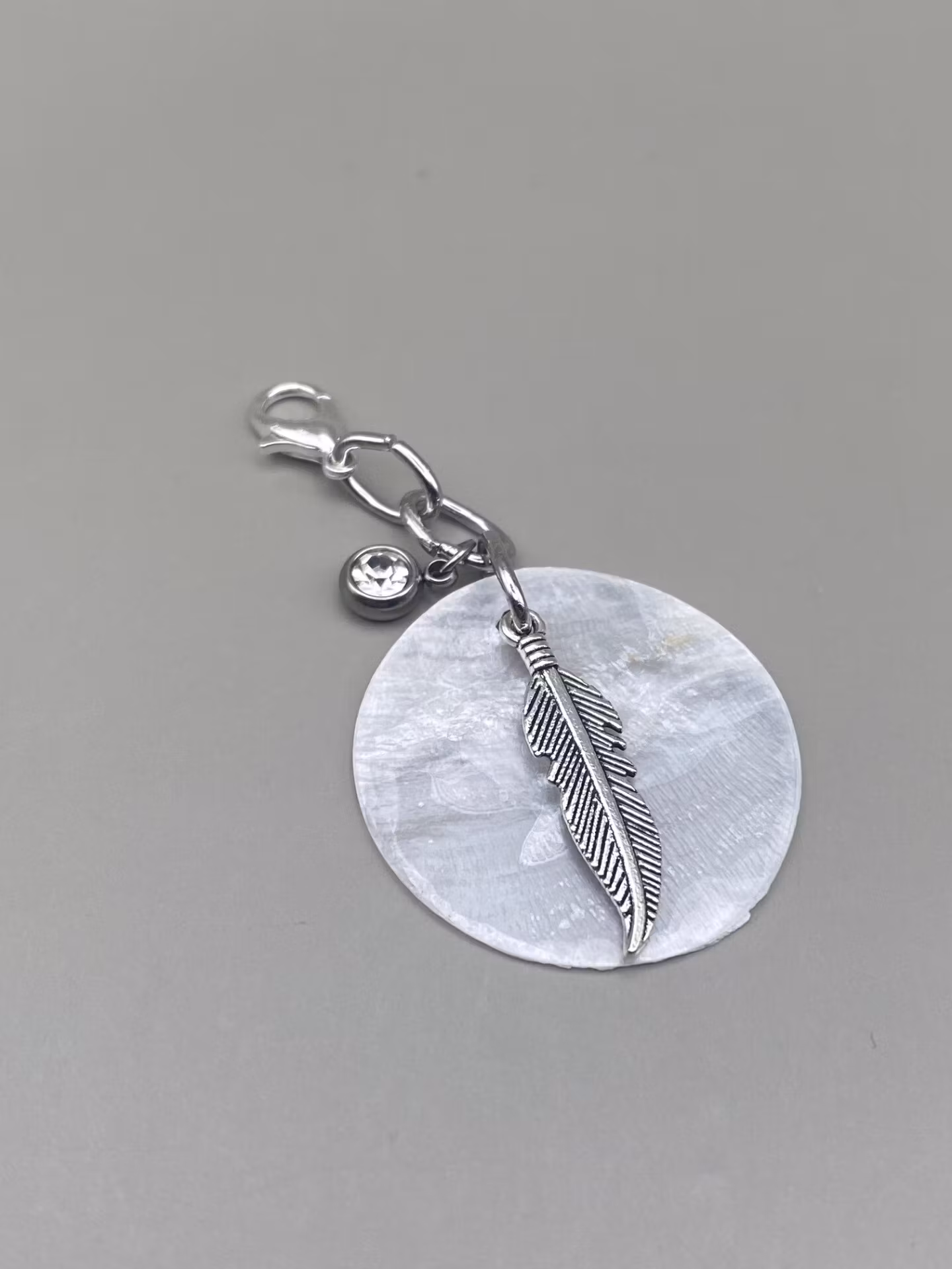 Berlocken är i silverfärgad rostfritt stål med hängade berlocker i form av ett tunt runt snäckskal, en dekorativ silverfärgad fjäder och en hängande strass-berlock.