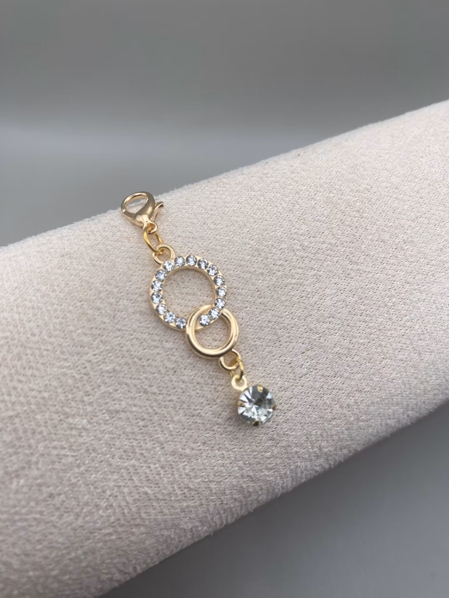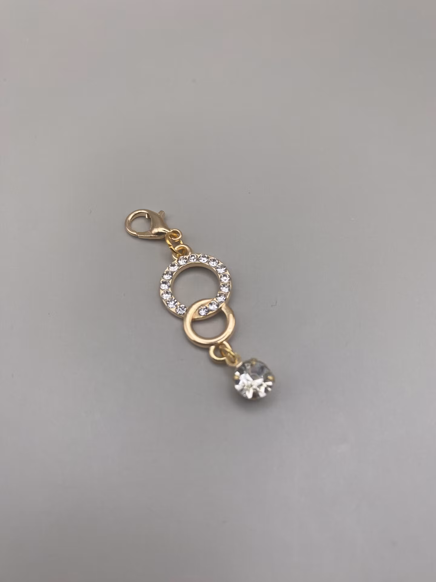 Berlocken är i guldfärgad rostfritt stål i en vacker sammansatt form av två ringar, den ena med rhinestones och en vacker dinglande cubic zirconia.
