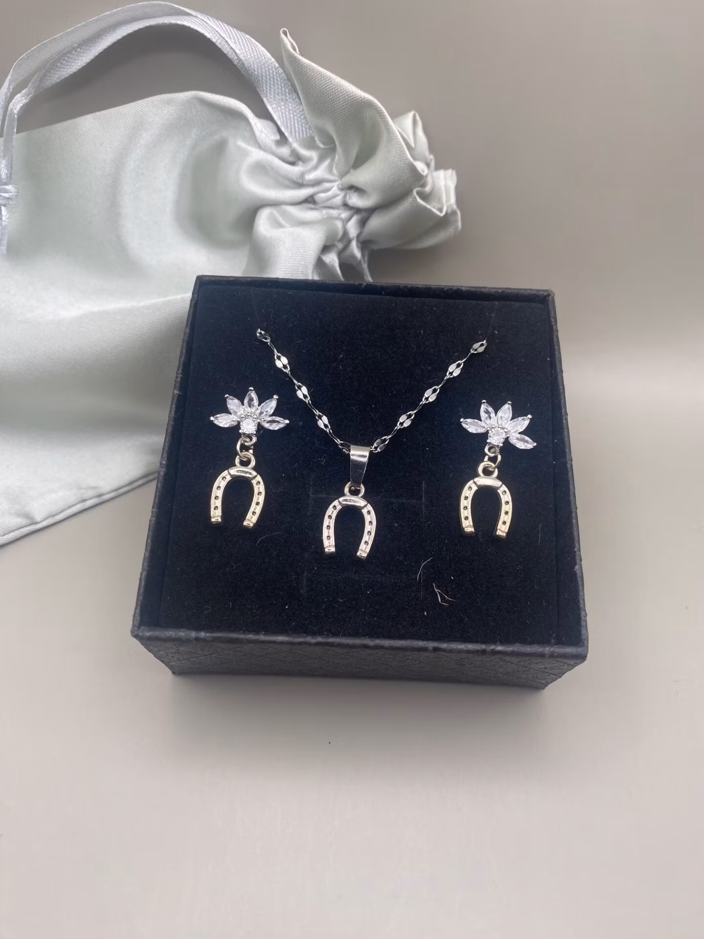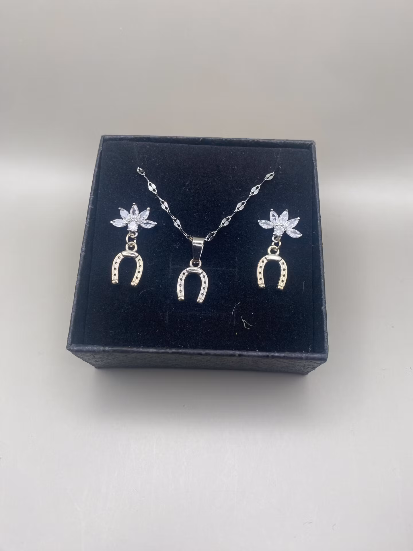 Vackert set med ett par örhängen och ett halsband. (ord.pris 198kr). Levereras i presentask.Örhängen: Vacker silverfärgad hästsko. Stift i rostfritt stålHalsban