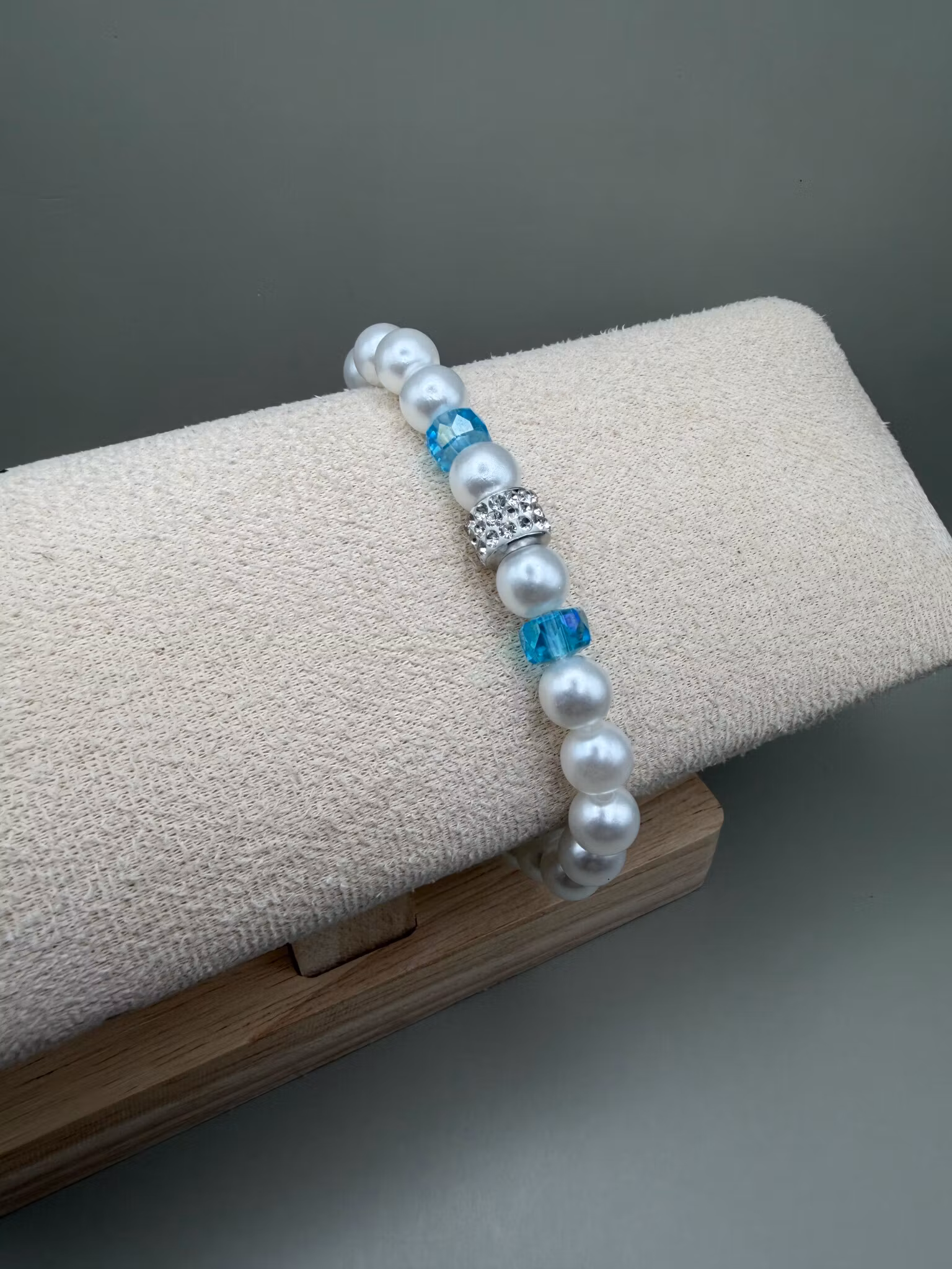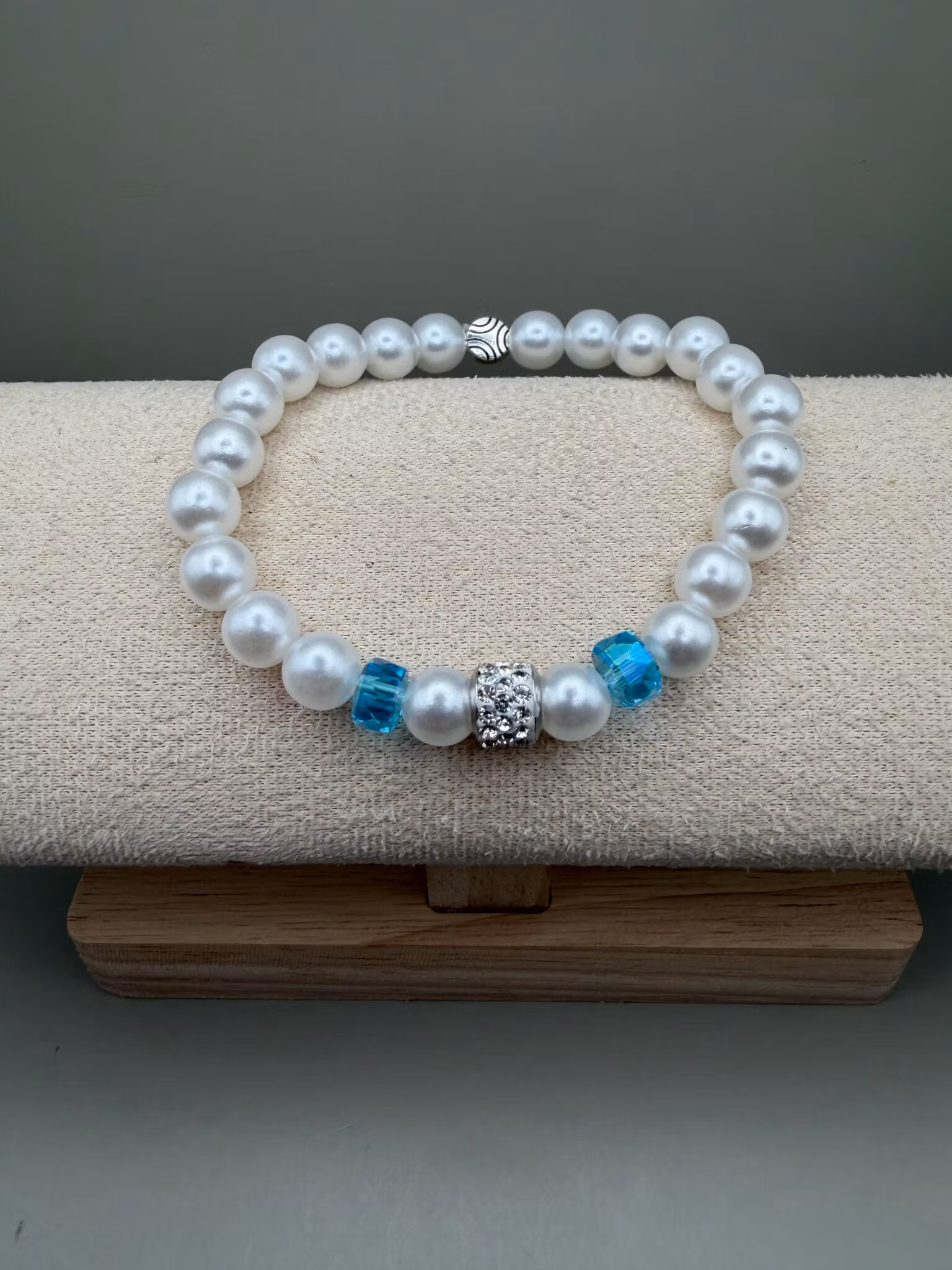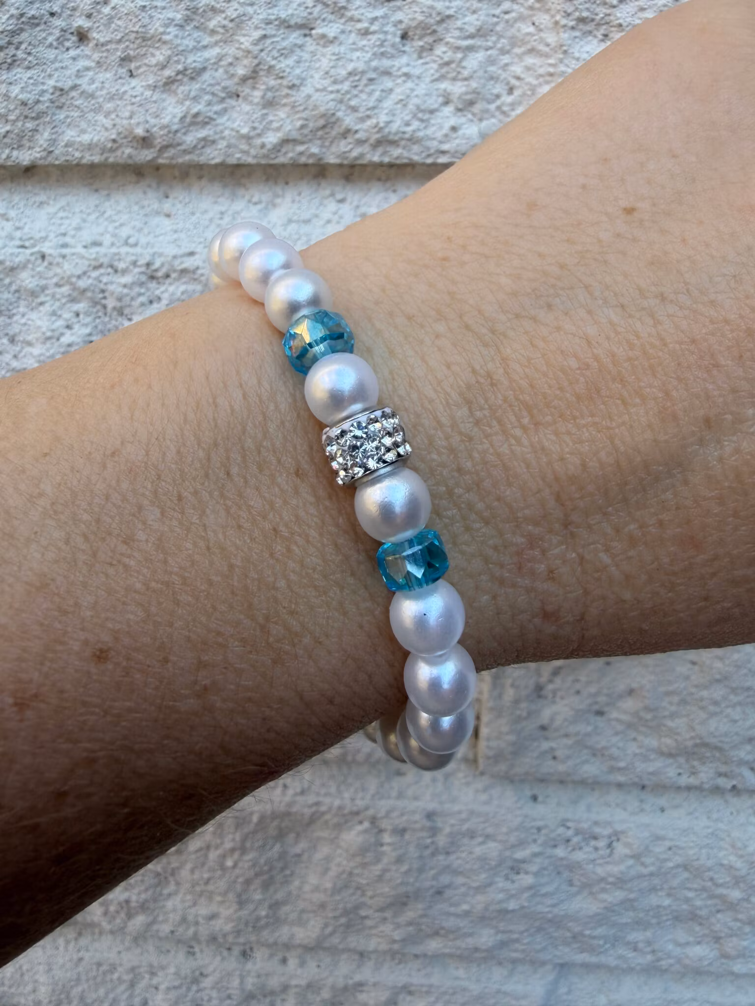 Ett vitt pärlarmband med strass som blickfång, kompletterat av två turkosa glaspärlor för en fräsch somrig känsla.