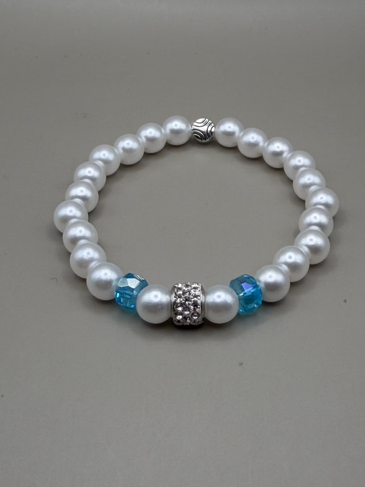 Ett vitt pärlarmband med strass som blickfång, kompletterat av två turkosa glaspärlor för en fräsch somrig känsla.Pärlor: 8mm