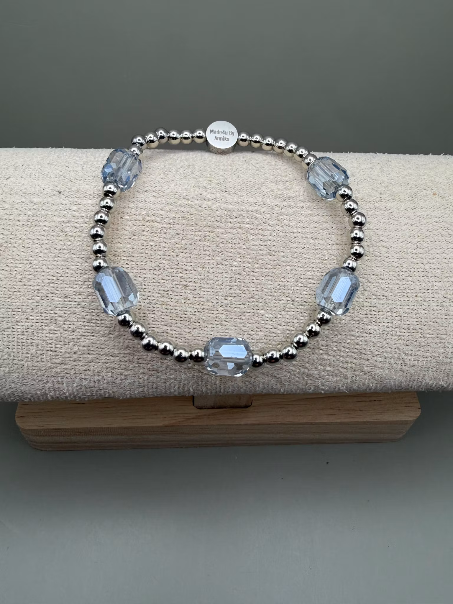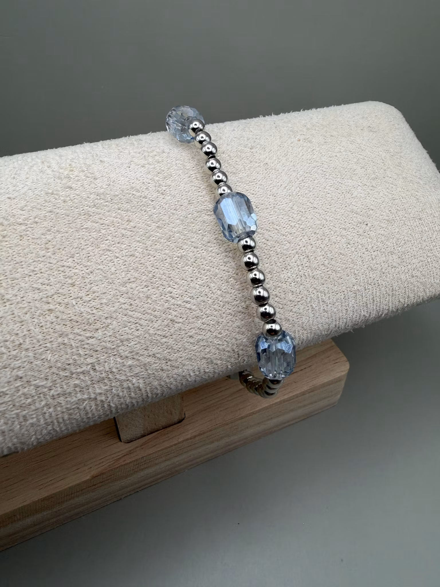 Ett vackert och stilrent pärlarmband med ett harmoniskt varvat mönster av små silverfärgade pärlor och avlånga, facetterade ljusblå glaspärlor. De skimrande ljusblå tonerna fångar ljuset på ett elegant sätt och skapar en känsla av lyx och tidlös elegans – ett armband som lyfter både vardags- och festlook.