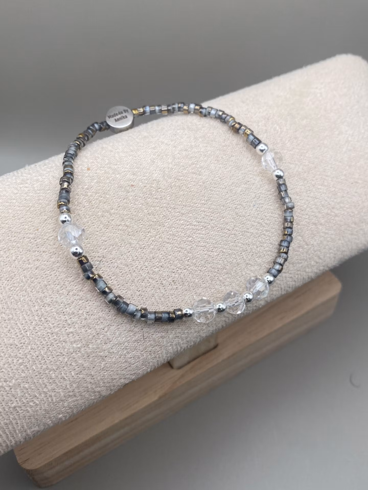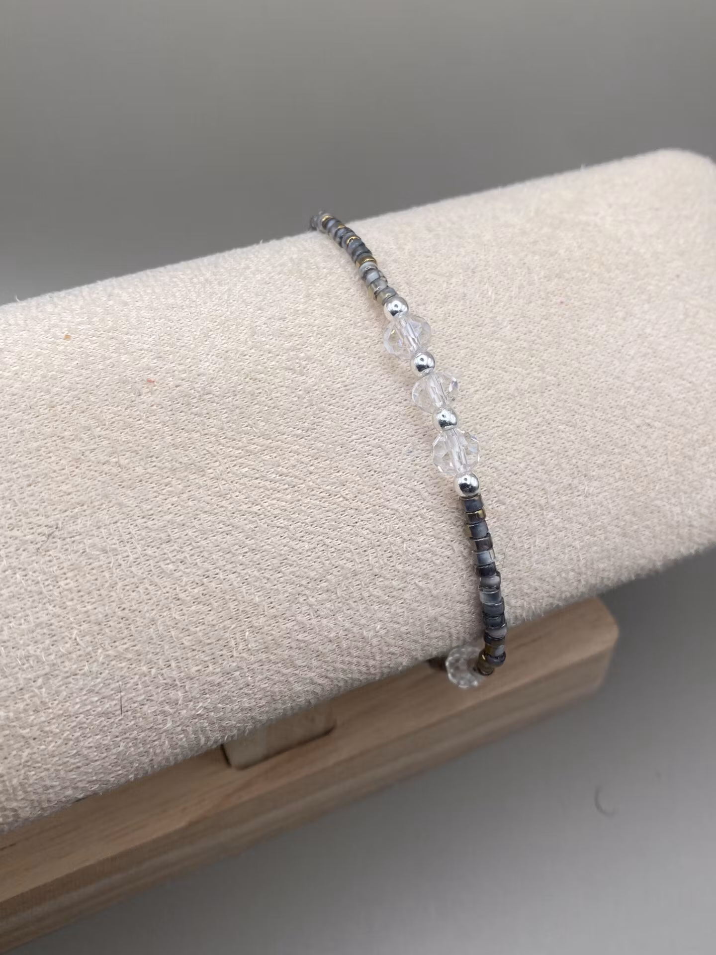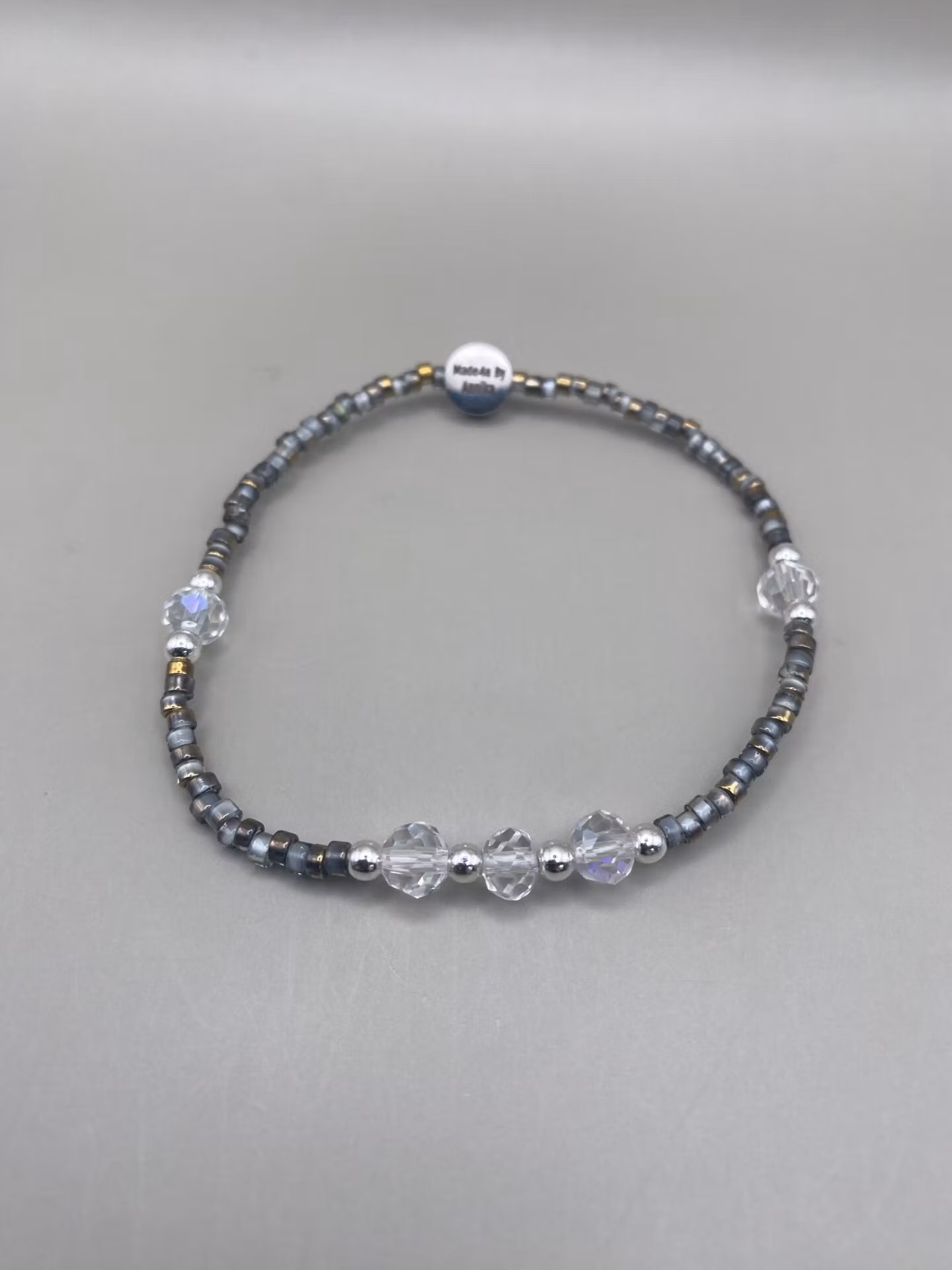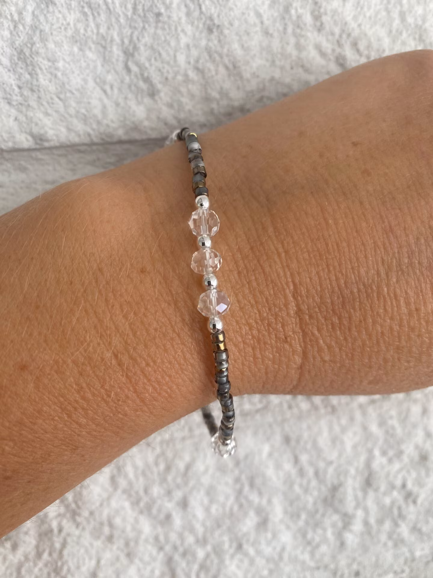 Läckert armband i små gråmellerade glaspärlor och klara facetterade glaskristallpälor och silverfärgade detaljer.