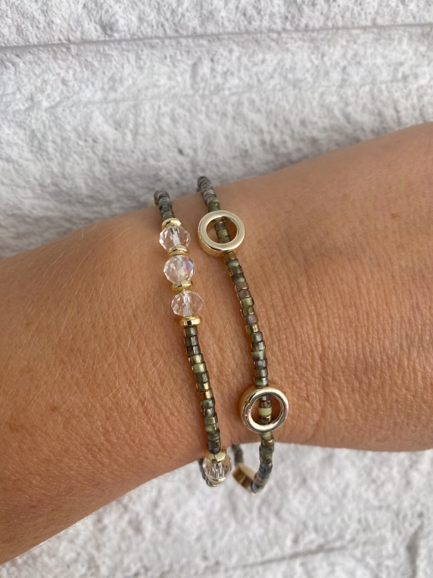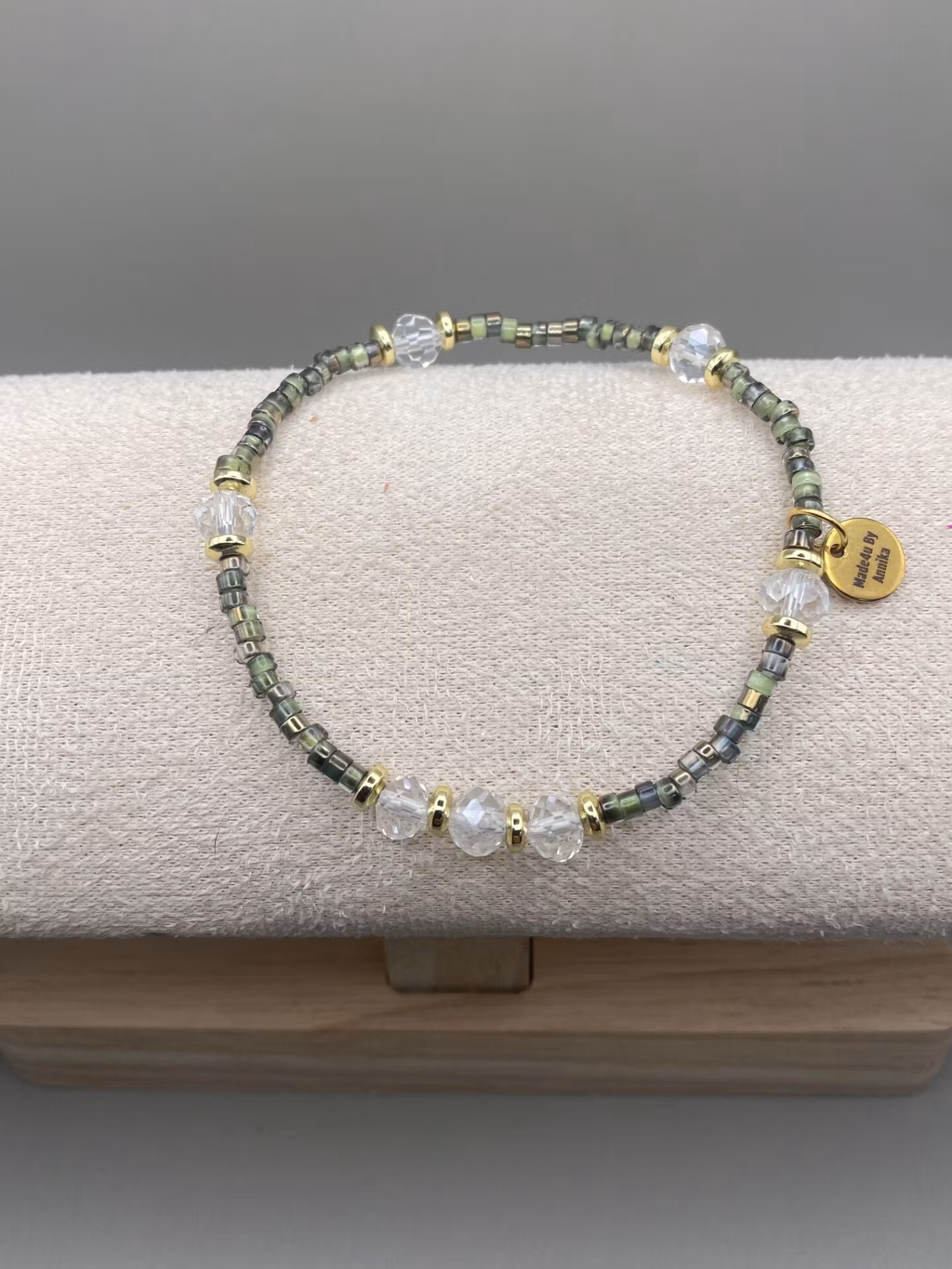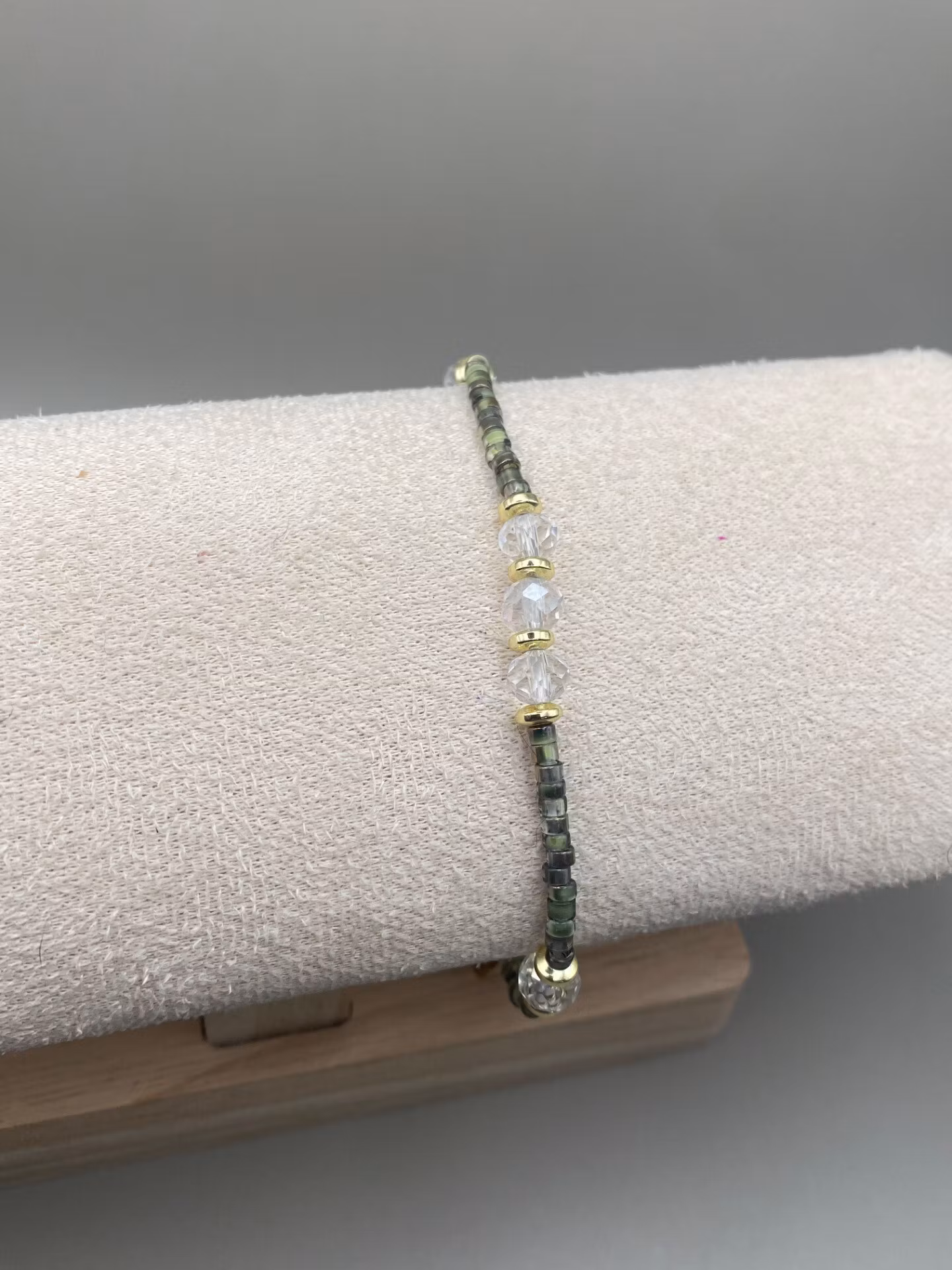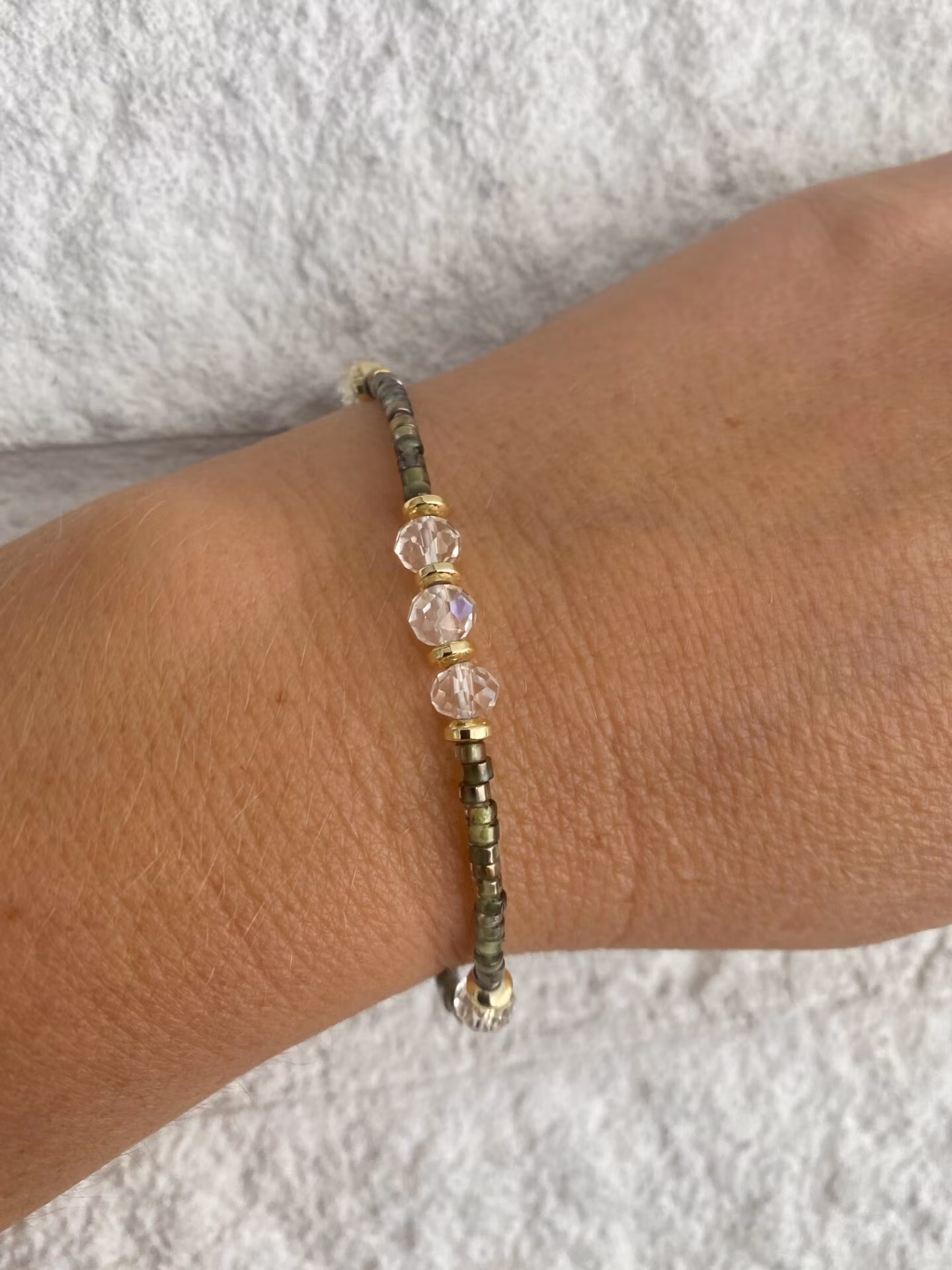 Läckert armband i små grönmellerade glaspärlor och klara facetterade glaskristallpälor och detaljer i 18K guldpläterad hematit.
