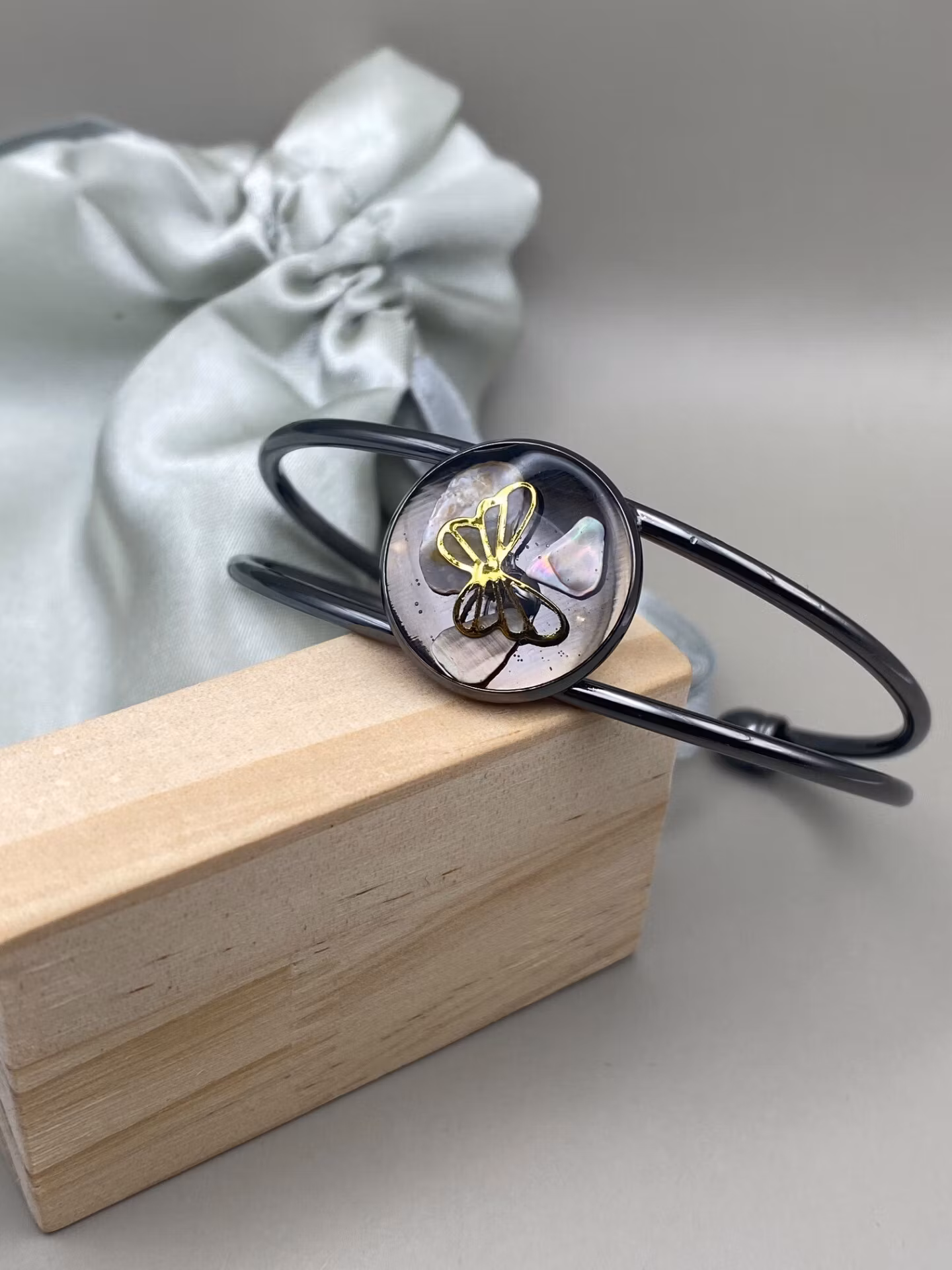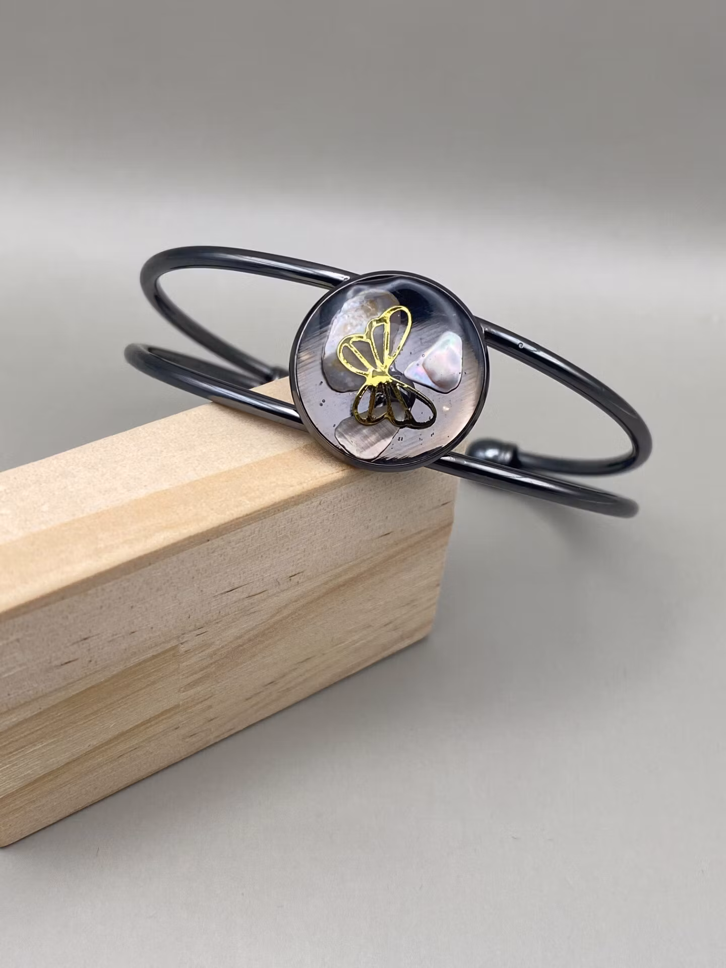 Vackert lekfullt armband med fast metallsvart ram och vacker rund platt berlock med en härlig mix av silvergrått och svart, med en dekorativ guldfärgad fjäril i kristallklar resin, gjuten för hand för att ge en unik och exklusiv finish.