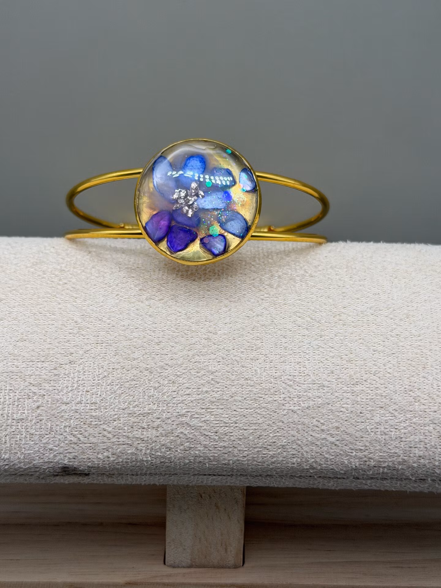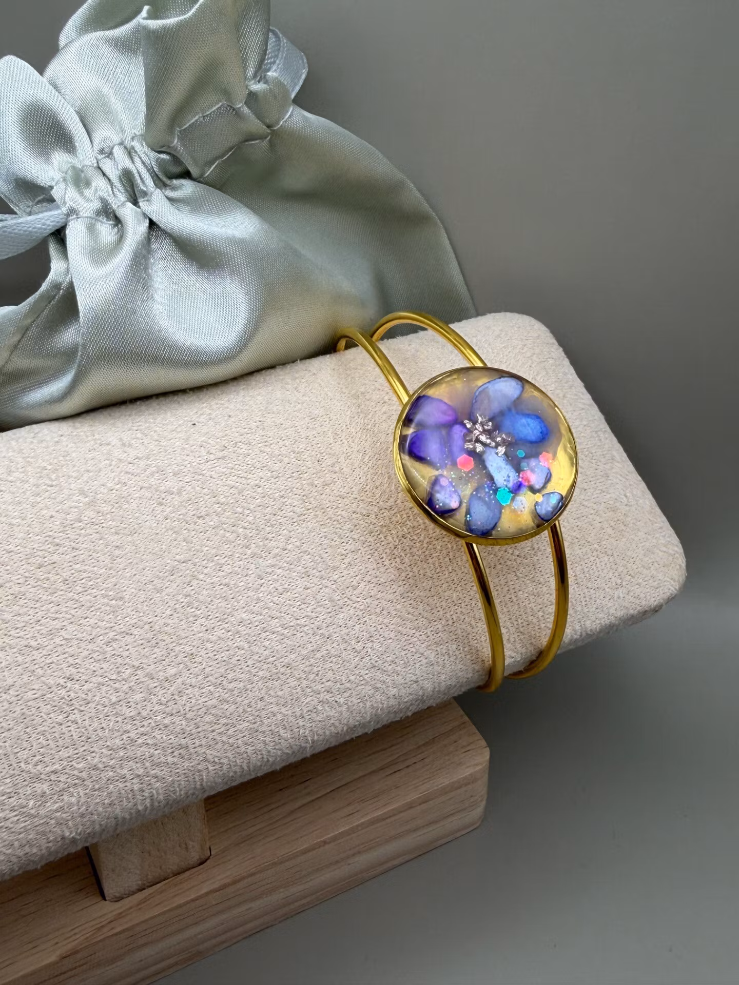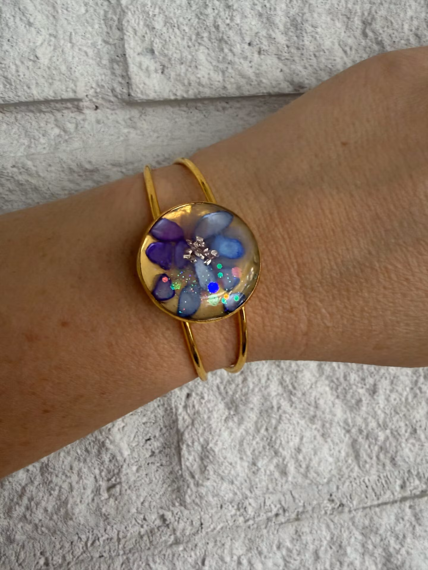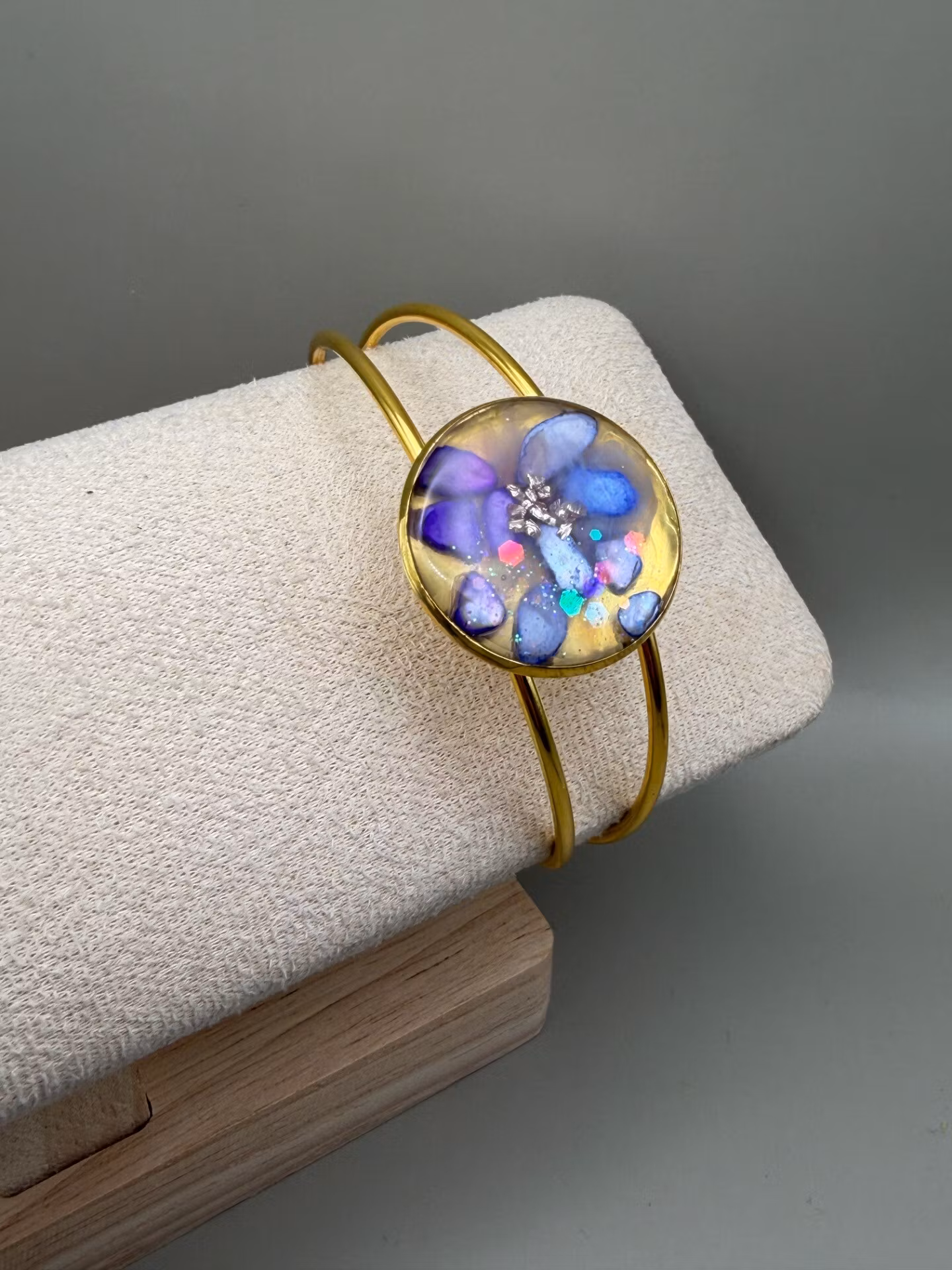 Vackert lekfullt armband med fast gulfärgad ram och vacker stor platt berlock med en fin mix av lila nyanser av stenar och guldfärgat glaskross, i kristallklar resin, gjuten för hand för att ge en unik och exklusiv finish.