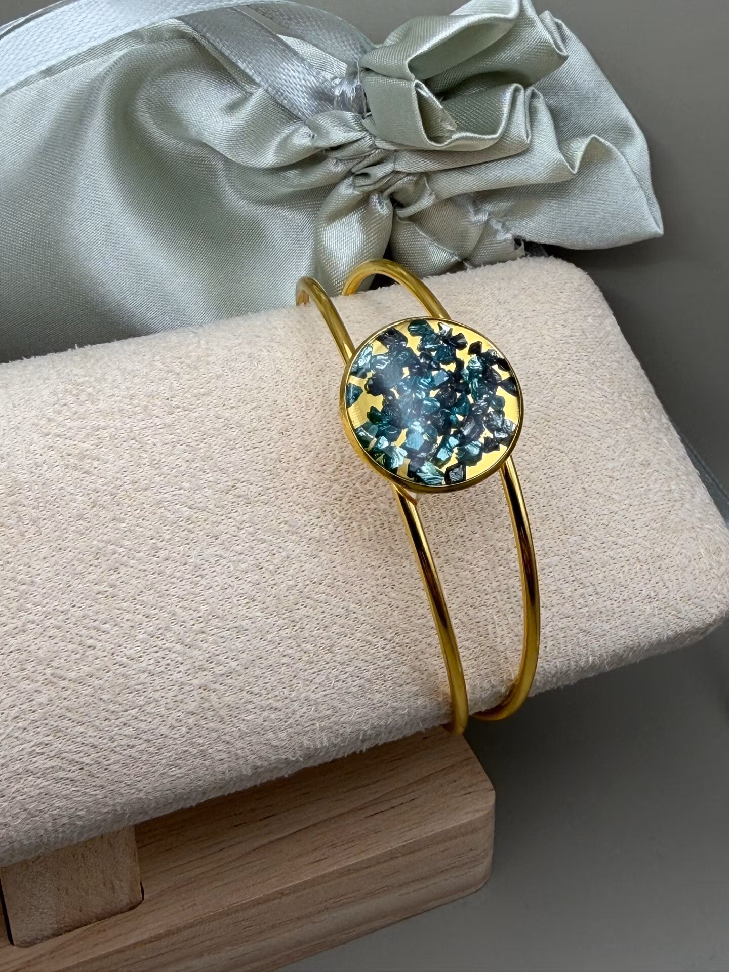 Vackert lekfullt armband med fast guldfärgadram och vacker stor platt berlock med en fin mix av turkos och grågrönt glaskross, i kristallklar resin, gjuten för hand för att ge en unik och exklusiv finish.