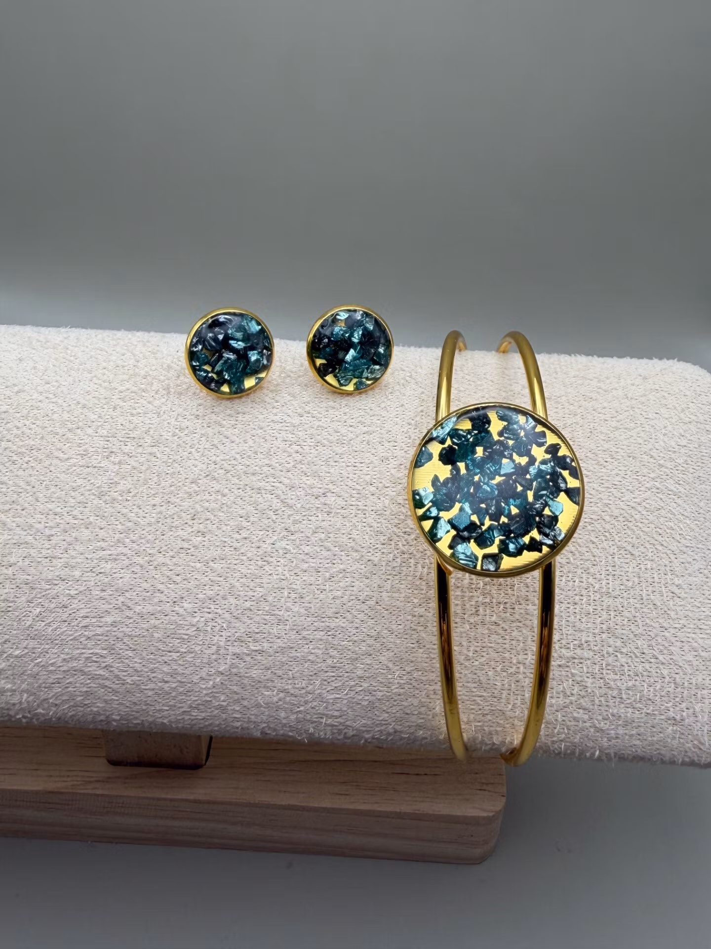 Vackert lekfullt armband med fast guldfärgadram och vacker stor platt berlock med en fin mix av turkos och grågrönt glaskross, i kristallklar resin, gjuten för