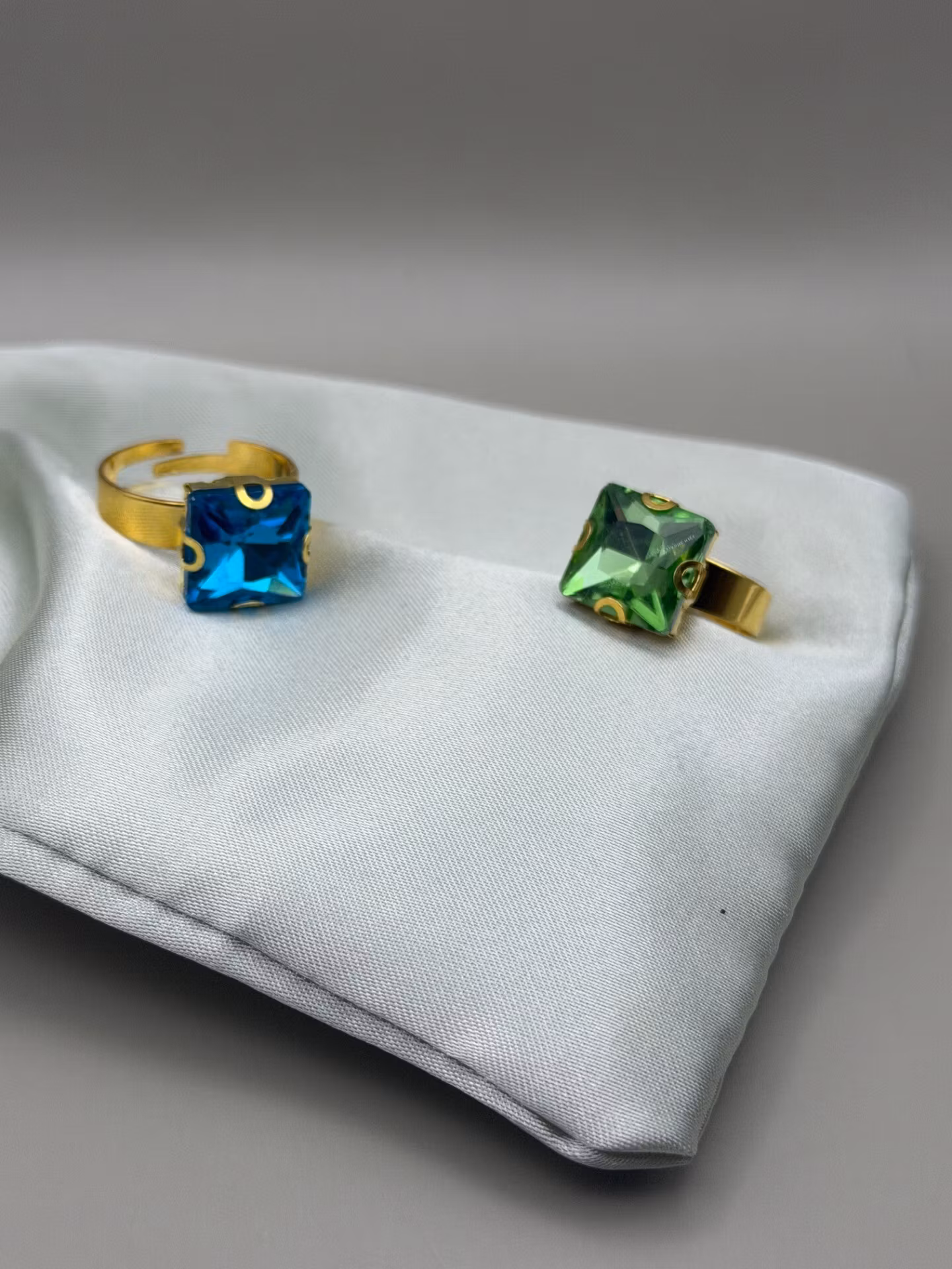 Stilig statement-ring med en stor, fyrkantig strasssten i ljusgrönt kristallglas.