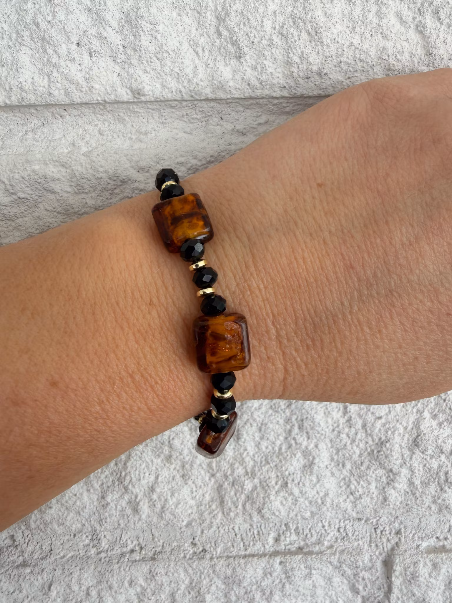 Trendigt armband med stora fyrkantiga leopardmönstrade glaspärlor i ett vackert mönster med facetterade svarta glaskristallpärlor och 18K guldpläterade pärlor i hematit. Armbandet avslutas med min karaktäristiska signaturpärla.